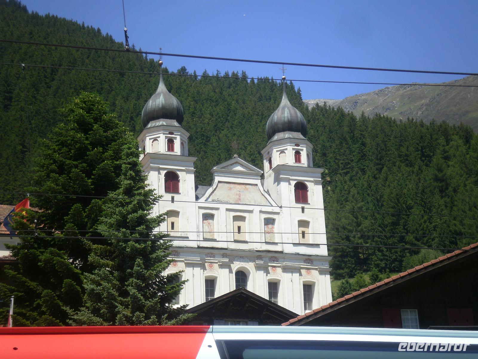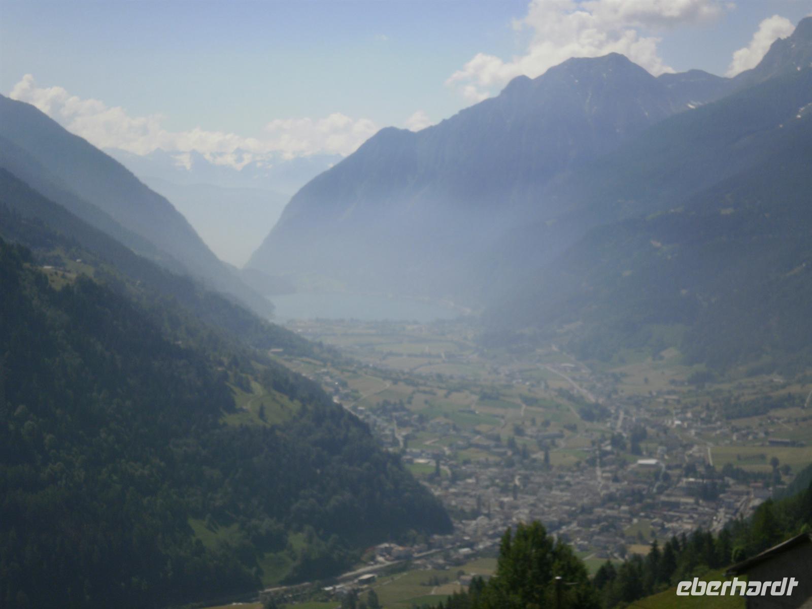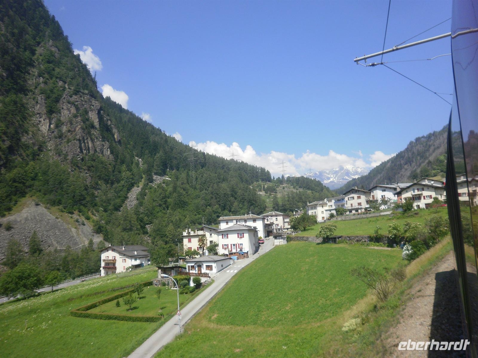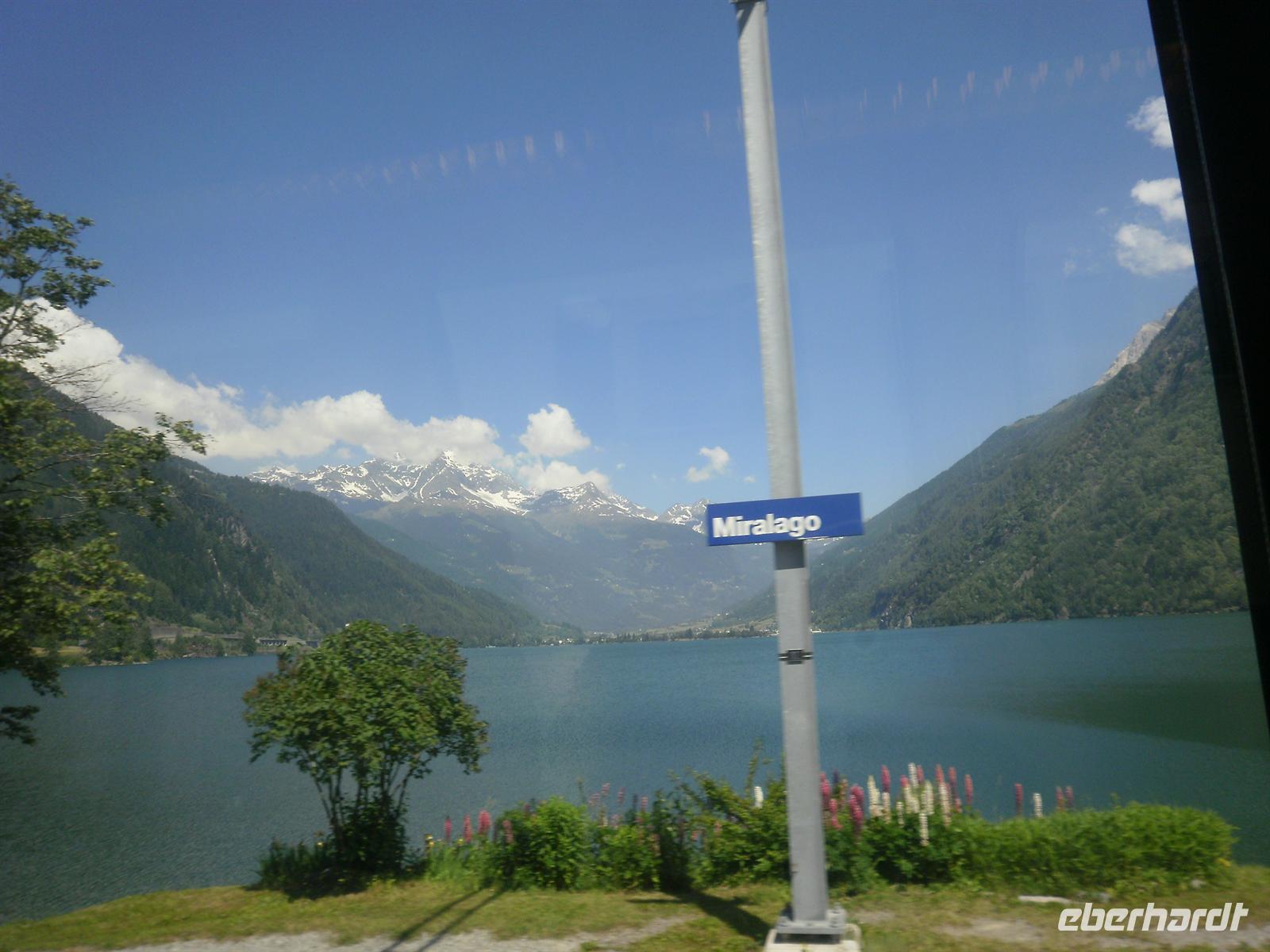Gegen Mittag kamen wir schließlich nach einer etwa 2-stündigen Fahrt im Bernina-Express im italienischen Tirano an und die meisten von uns gingen zum Mittagessen ins Restaurant “Al Portici”. Einige von uns probierten auf meine Empfehlung hin eine Spezialität dieser Gegend, nämlich “Pizzoccheri“. Das ist eine Mischung aus Buchweizennudeln, Spinat, Karotten, Knoblauch, Zwiebeln und das alles mit Butter und Käse überbacken. Dazu gab es für einige ein Glas Hauswein, natürlich aus dieser Gegend - dem milden Veltlin. Wir hatten wahrhaftig Temperaturen an die 30 Grad. Einige von uns nutzten auch noch die Gelegenheit und spazierten zur Wallfahrtkirche “Madonna di Tirano” - diese Kirche mit ihren herrlichen Fresken hatte heute sogar ihre Türen geöffnet, denn meistens ist sie über die Mittagszeit geschlossen - wie fast alle Geschäfte hier! In Italien pflegt man nämlich die Tradition der Siesta und ein altes römische Sprichwort sagt: “Zu dieser Zeit sind nur Hunde und Franzosen unterwegs…” Für uns ging es nun mit dem Bus zurück. Nach kurzer Zeit erreichten wir wieder den Grenzübergang Italien - Schweiz und wie versprochen, legten wir auf der Rückfahrt ein paar Foto-Stopps ein, denn während unserer Bahnfahrt am Vormittag durften wir leider nicht aussteigen.