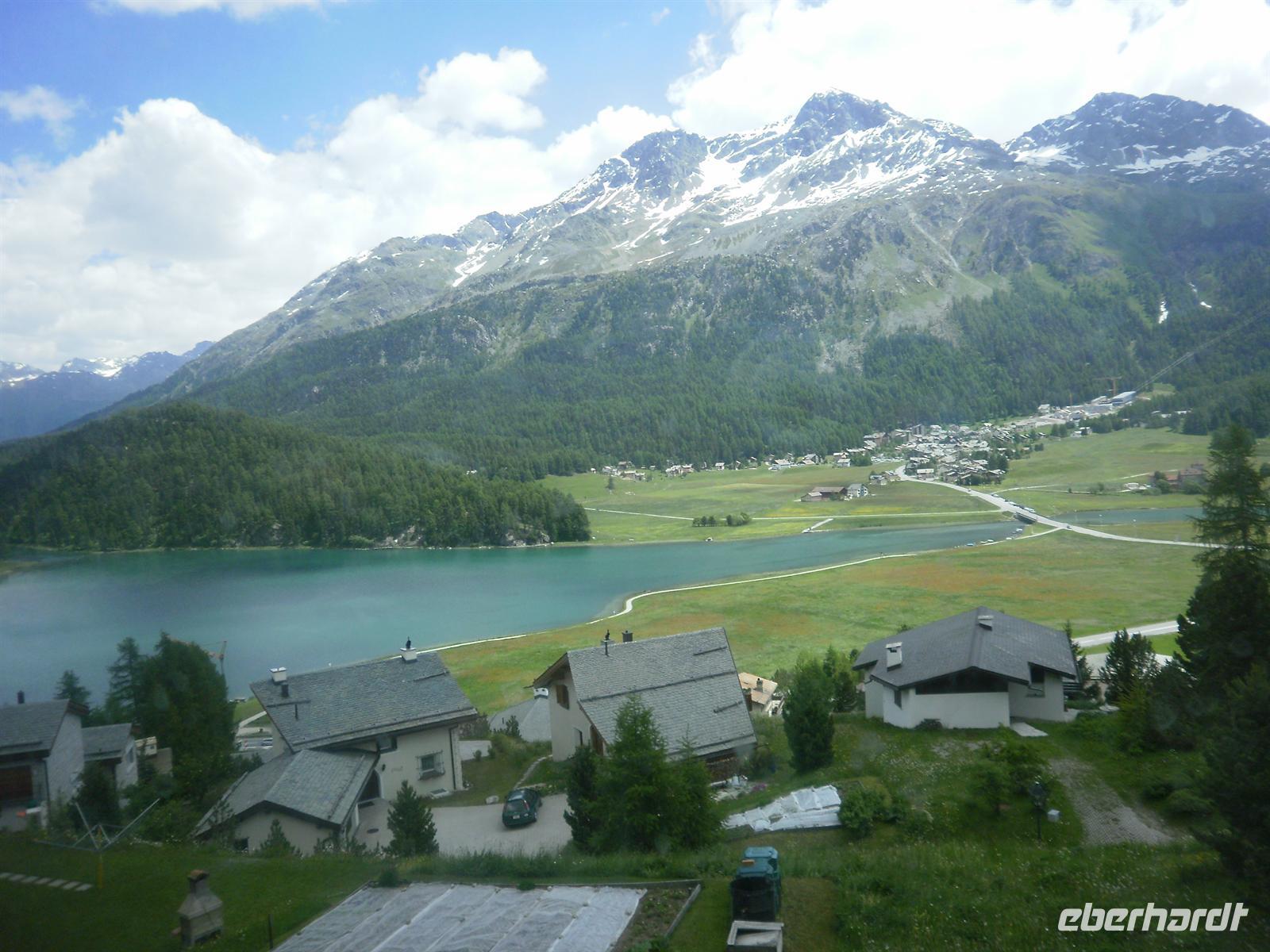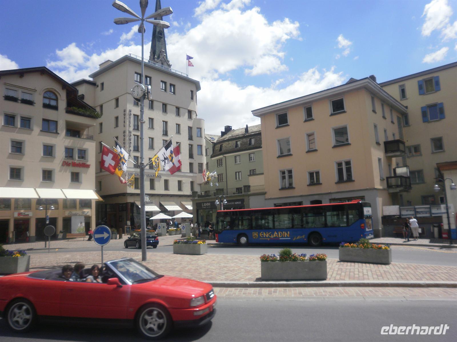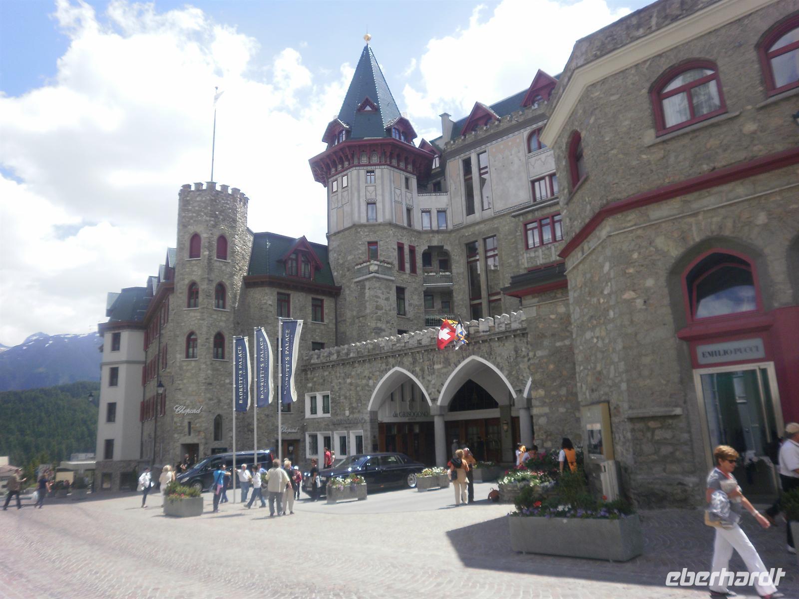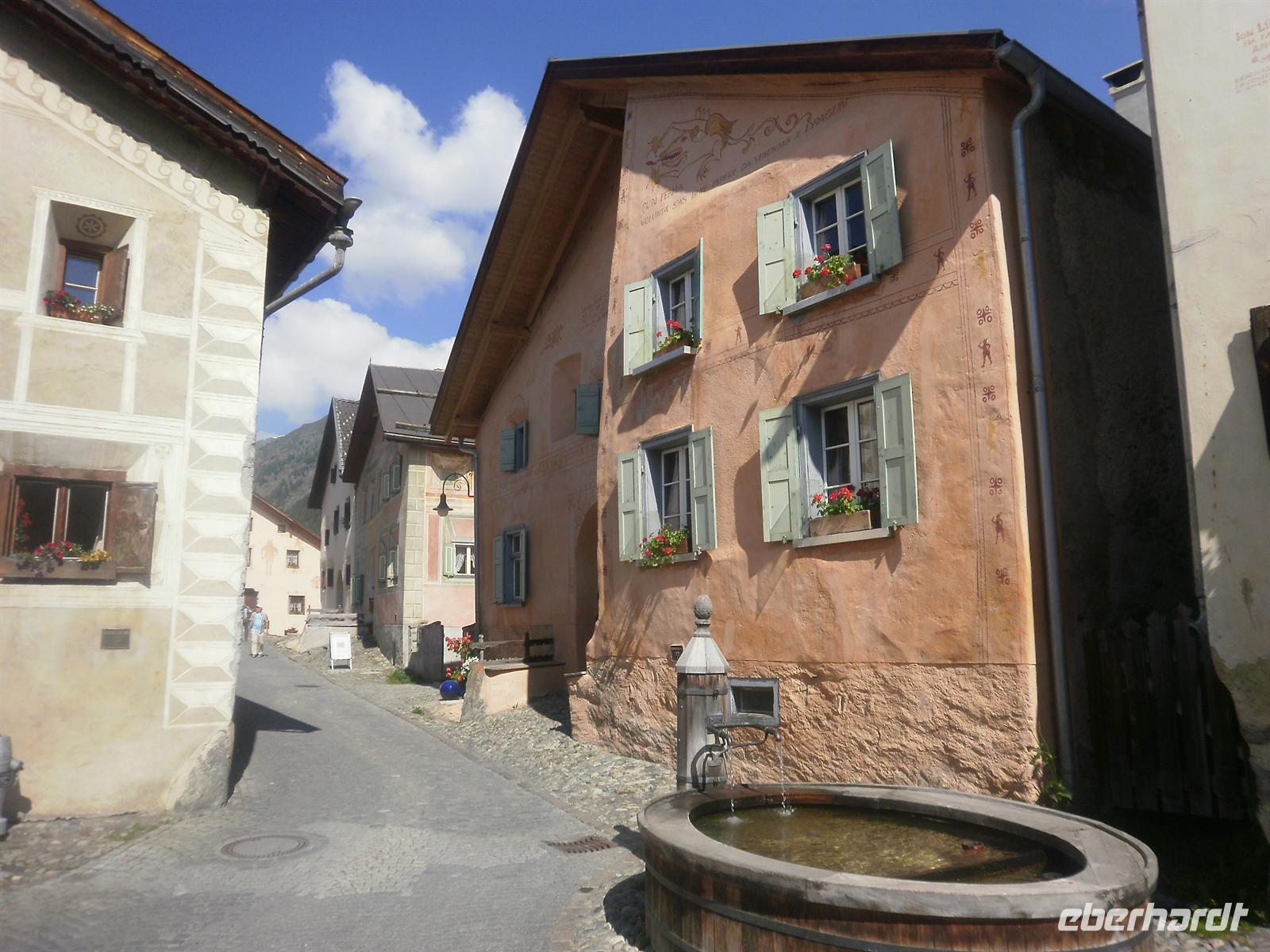 Zuerst ging es für uns nach Guarda, einem typisch Engadiner Dorf, das ich vor einigen Jahren mal entdeckt habe und unseren Gästen unbedingt zeigen musste. Guarda hat noch heute ein intaktes Ortsbild, wie man es leider nur noch selten sieht. Während die Gebäude in den Hochburgen des Tourismus, vor allem aber in St. Moritz, Hotelbauten weichen mußten, sieht man in Guarda noch sehr viele Häuser im Engadiner Baustil. Kennzeichnend für das Engadiner Haus sind die tief eingelassenen Fenster, die Eingangstore und die wertvollen Sgraffito-Malereien. Von Guarda genießt man übrigens auch einen herrlichen Ausblick auf das Inntal, denn der Ort liegt auf einer Terrasse oberhalb des Inntals. Nun führte uns die Fahrt durch die Ortschaften Susch, Zernez, vorbei an Zuoz und Samedan nach St. Moritz. St. Moritz ist in erster Linie als Wintersportort bekannt, im Sommer ist hier so gut wie gar nichts los.