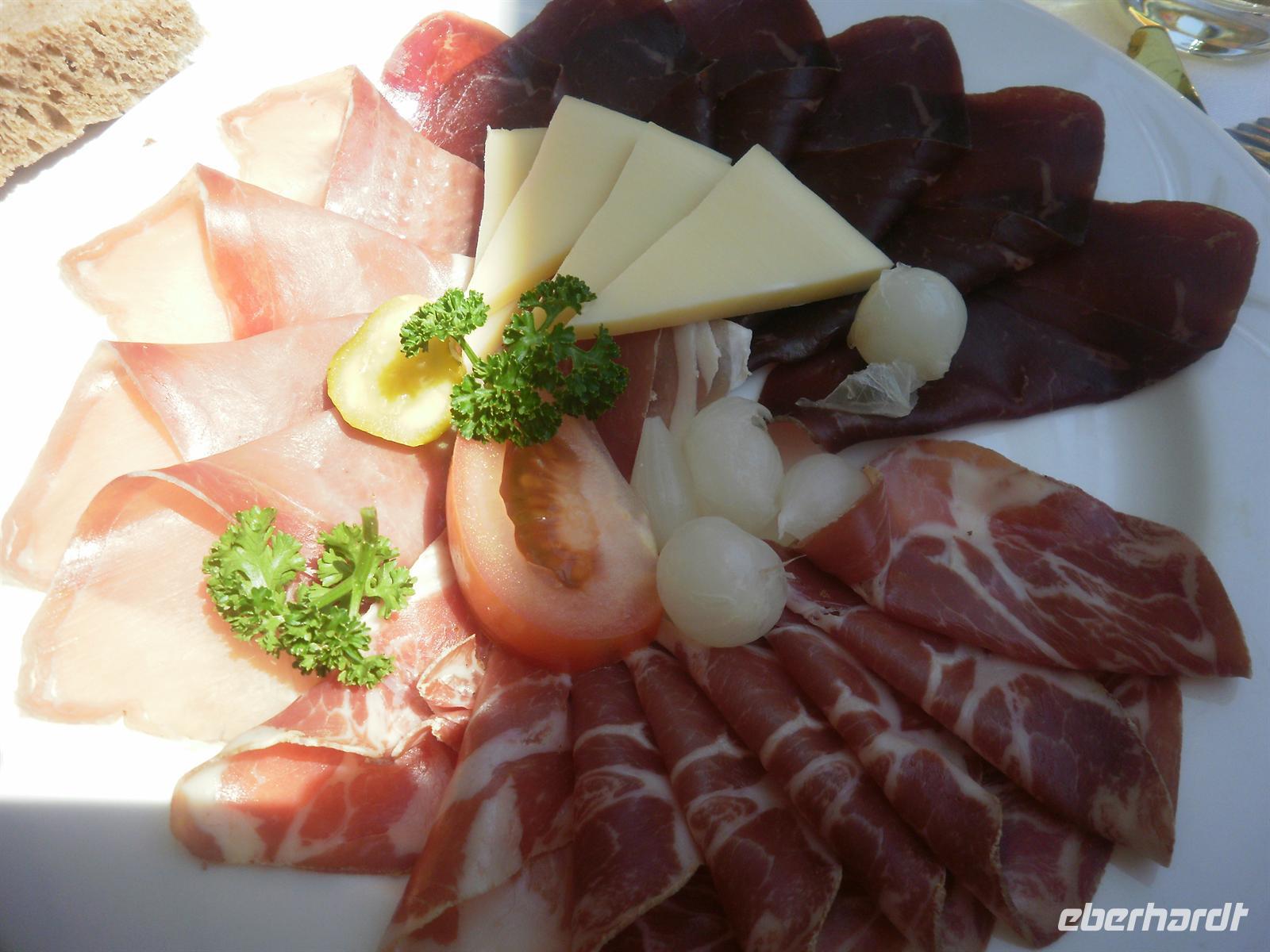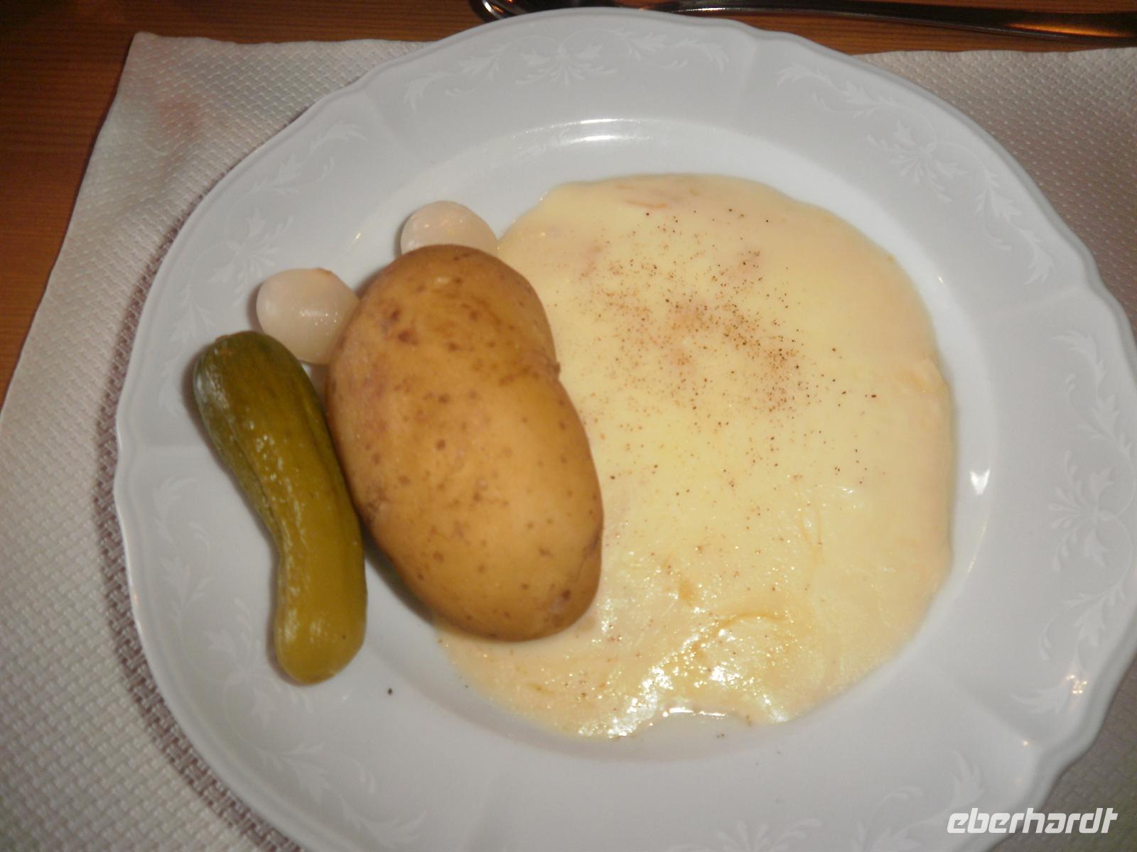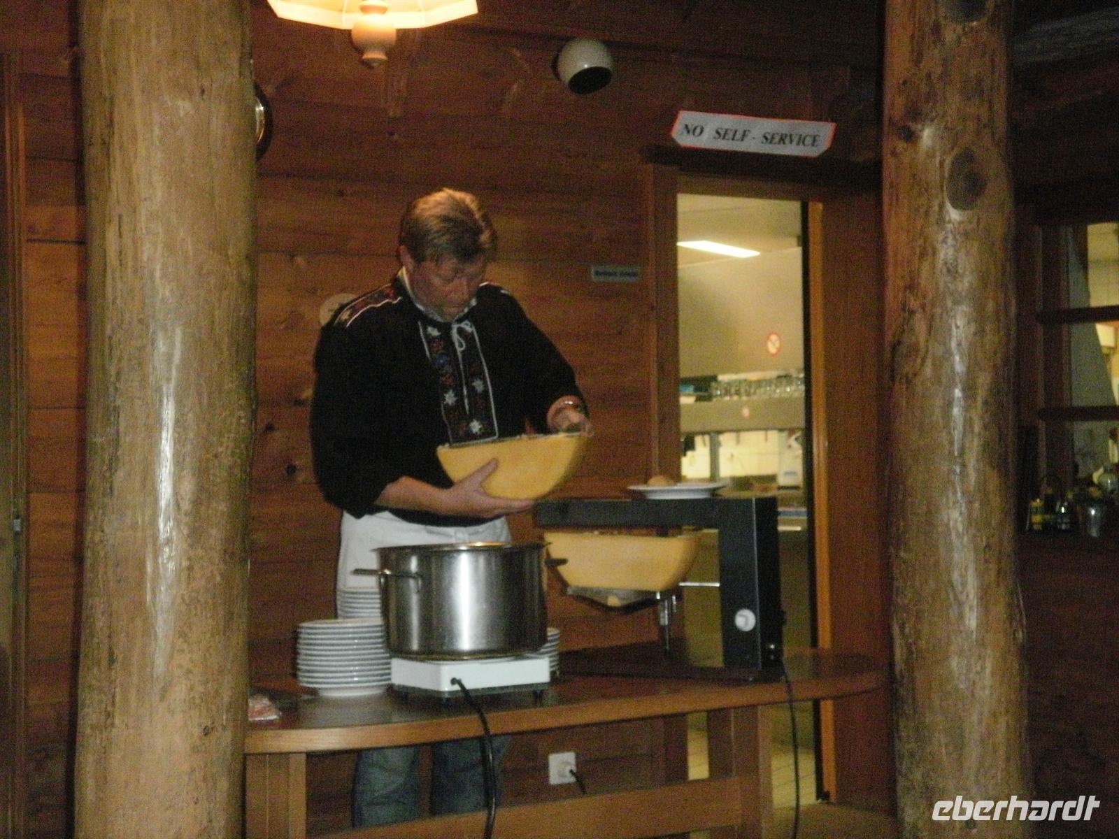 Diese Häuser stehen häufig auf sogenannten "Mäuseplatten" und dienten früher dazu, daß keine Mäuse an die Vorräte rankamen. So erlebte jeder diesen Tag nach seinen eigenen Vorstellungen. Am frühen Abend trafen wir uns alle wieder und nun ging es mit einer unterirdischen Standseilbahn zur Sunnegga hinauf. Wir befanden uns jetzt auf 2.288 Metern Höhe - Gornergrat und Matterhorn waren zum Greifen nah! Wir saßen auf der Terrasse und genossen einfach diese herrlichen Blicke, bevor wir ein typisch schweizerisches Essen erleben durften. Es gab Raclette - eine Käsespezialität mit Pellkartoffeln, grünen Gurken und Glaszwiebeln. Jeder konnte soviel essen, wie er wollte und wir konnten auch bei der Zubereitung zuschauen. Um Raclette zuzubereiten, wird übrigens ein großer halbierter Käse an der Schnittfläche erhitzt und die geschmolzene Oberfläche jeweils abgeschabt. Für die meisten von uns war es das erste Raclette-Essen des Lebens. Die Schweizer lieben Käse und das merkt man natürlich auch, wenn es um hiesige kulinarische Spezialitäten geht. Nachdem wir alle satt und zufrieden waren, ging es zurück nach Zermatt.