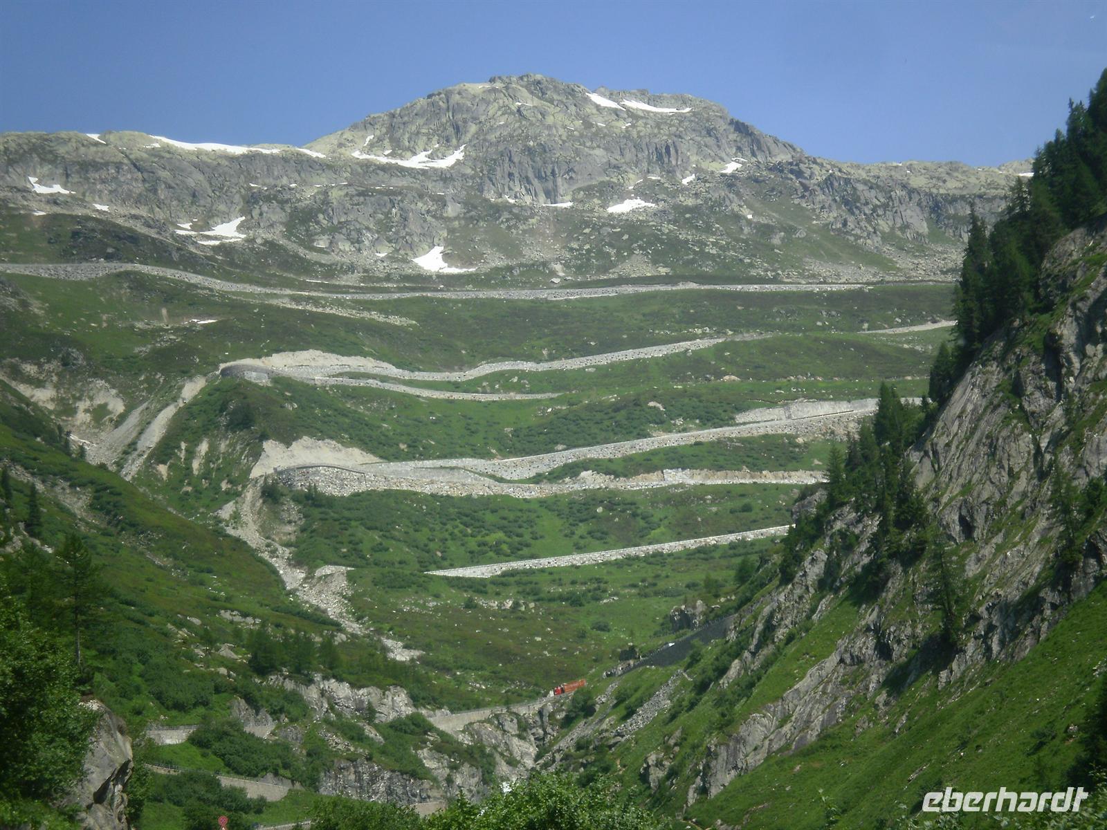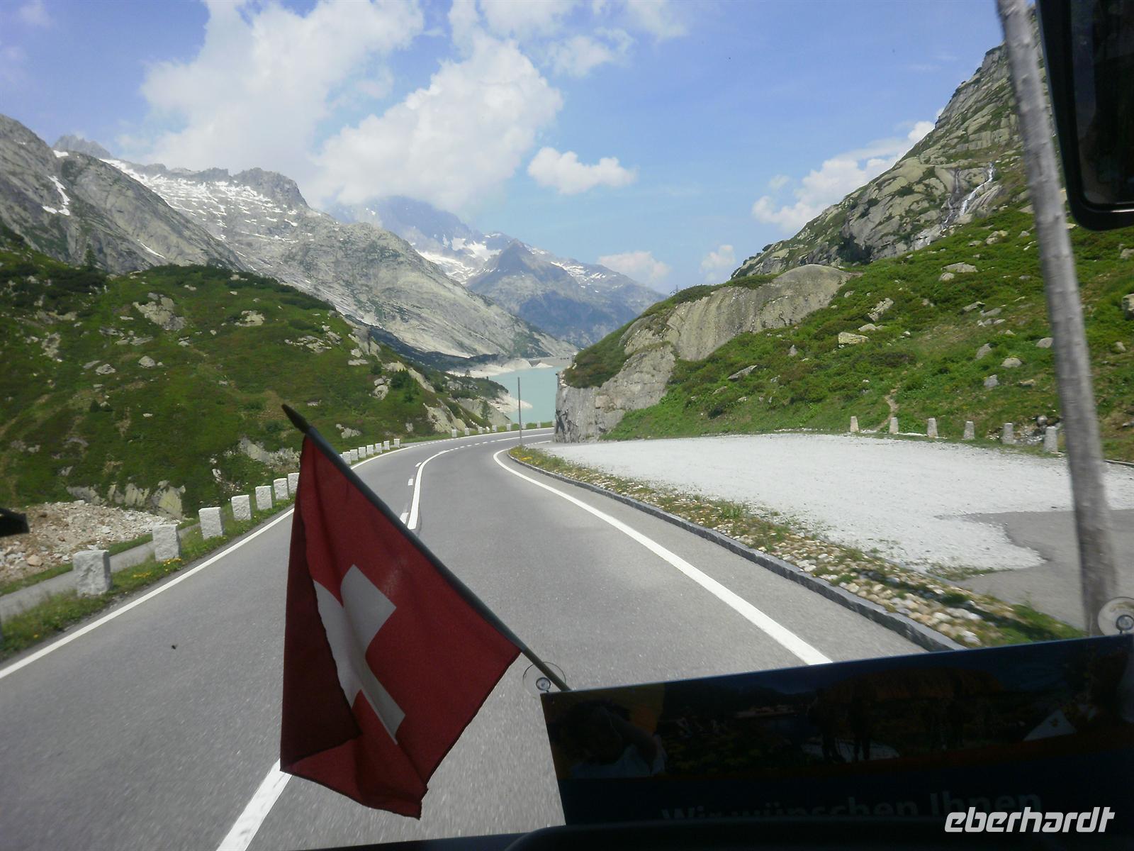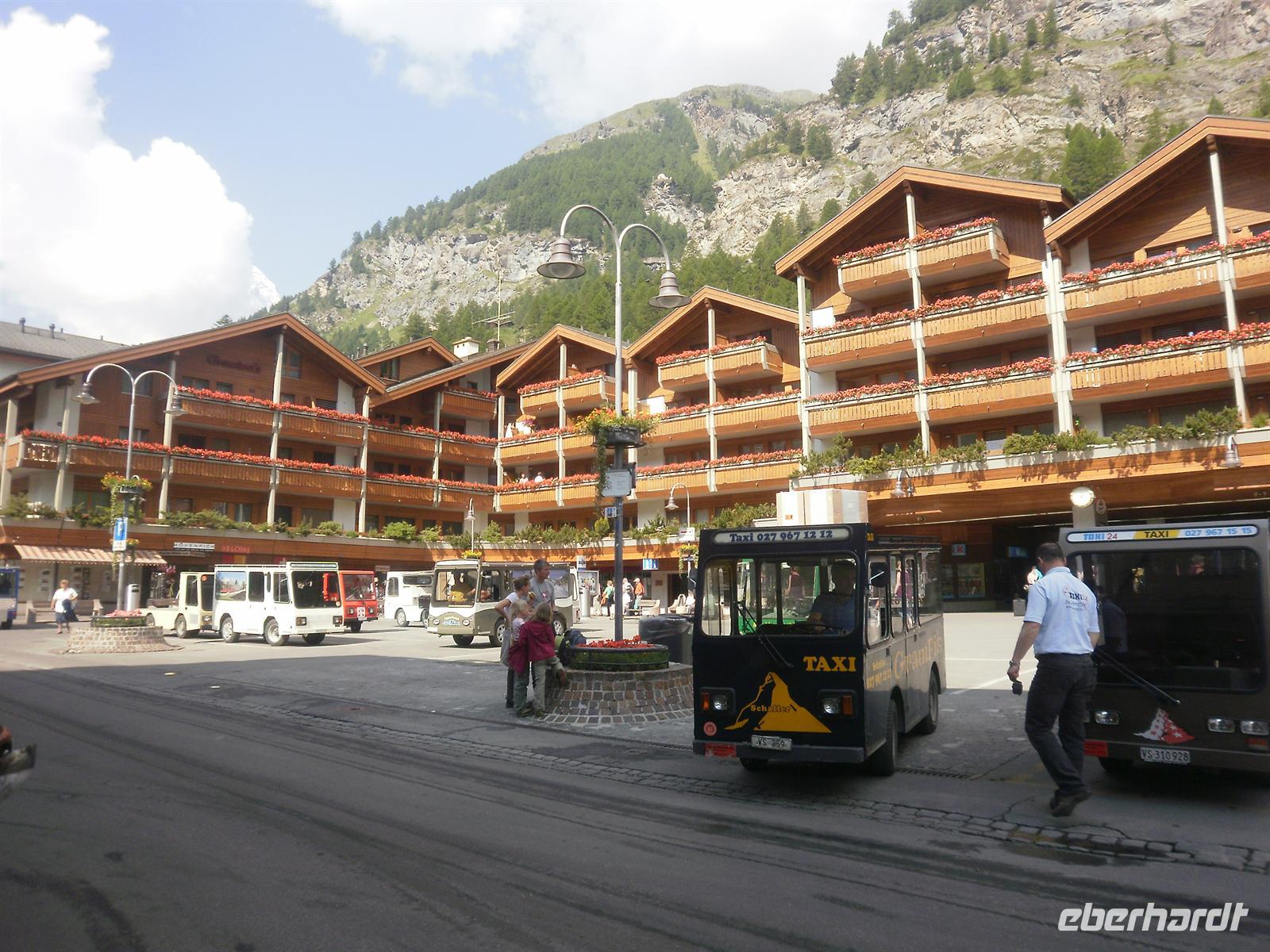 Am nächsten Morgen mussten wir dann leider schon wieder Abschied nehmen von dieser Region. Mit dem Pendelzug fuhren wir nach Täsch. Dort, ca. 5 Kilometer nördlich von Zermatt, mußte unser Bus parken, da Zermatt ein autofreier Ort ist. In Täsch angekommen, ging es dann gleich mit unserem Bus weiter. Mit unserem Gepäck war übrigens alles bestens organisiert, niemand mußte sich darum kümmern.