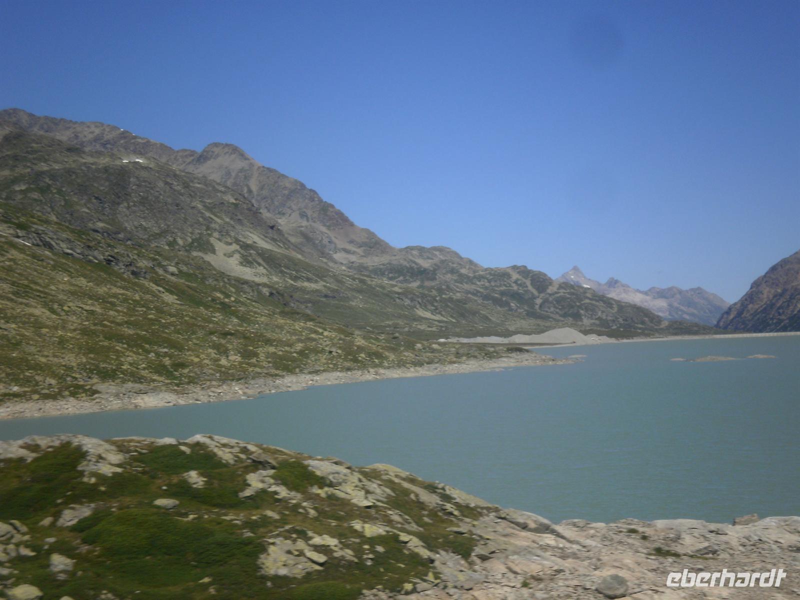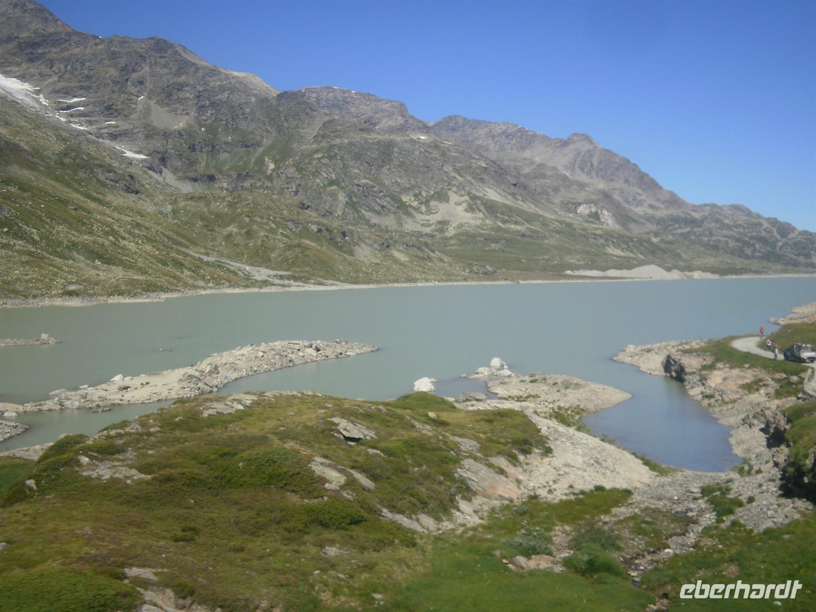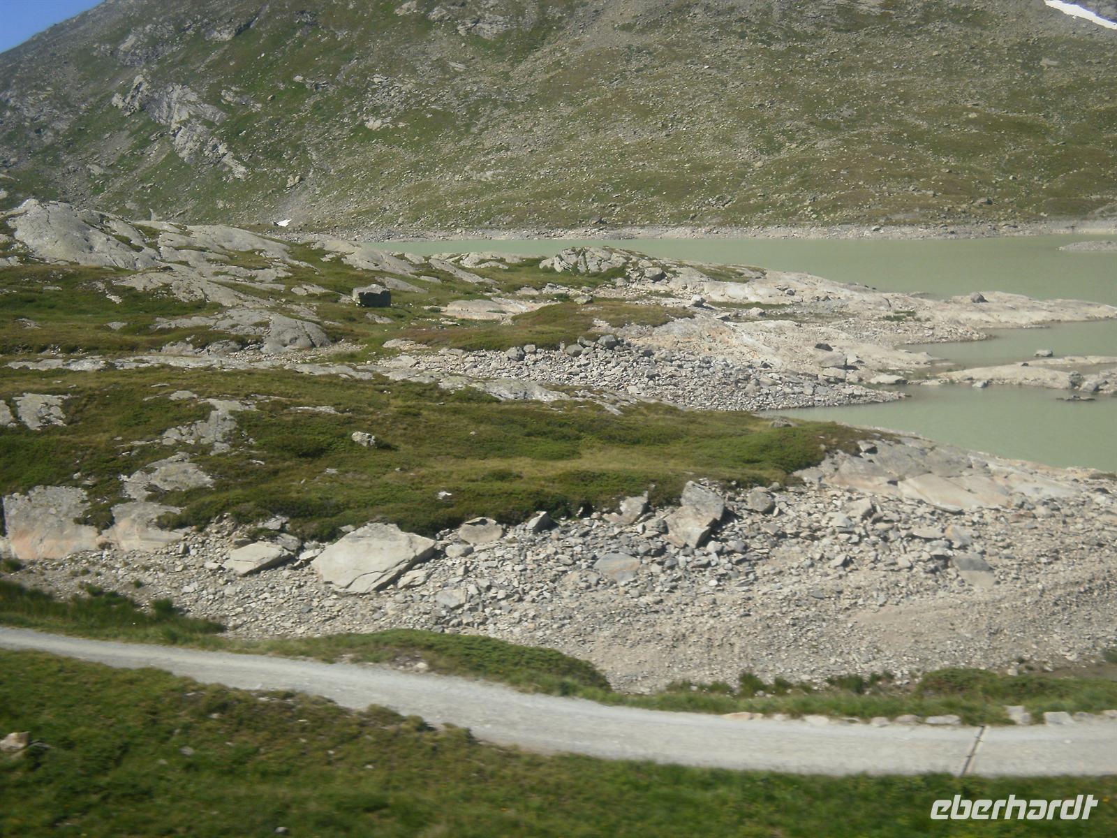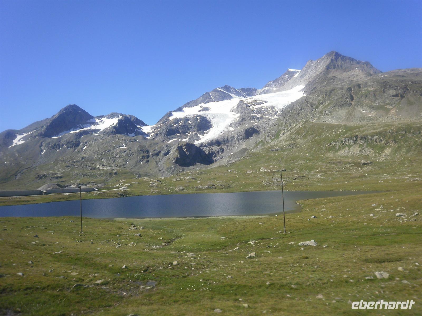 Zahlreiche Baustellen prägten das Ortsbild, aber das ist im Sommer normal. Die meisten Touristen besuchen St. Moritz nämlich im Winter. Das hatte natürlich auch einen Vorteil, denn so konnten wir ganz in Ruhe flanieren. Zum Glück für die Männer, hatten auch noch einige der teuren Geschäfte geschlossen und so mußte niemand seine Kreditkarte zücken. Ich führte unsere Gäste bis zum sogenannten "Schiefen Turm", dem Rest einer alten Kirche aus dem Mittelalter. Dieser Turm ist eines der Wahrzeichen von St. Moritz. Für die meisten von uns ging es einfach darum, St. Moritz zumindest mal gesehen zu haben, um mitreden zu können. Fast alle waren der Meinung, daß hier sehr viel von der Ursprünglichkeit verloren gegangen ist. Vorbei an den Oberengadiner Seen ging es nunmehr zum Julierpass hinauf. Dieser Pass bildet den Übergang vom Engadin nach Tiefencastel bzw. ins Rheintal.