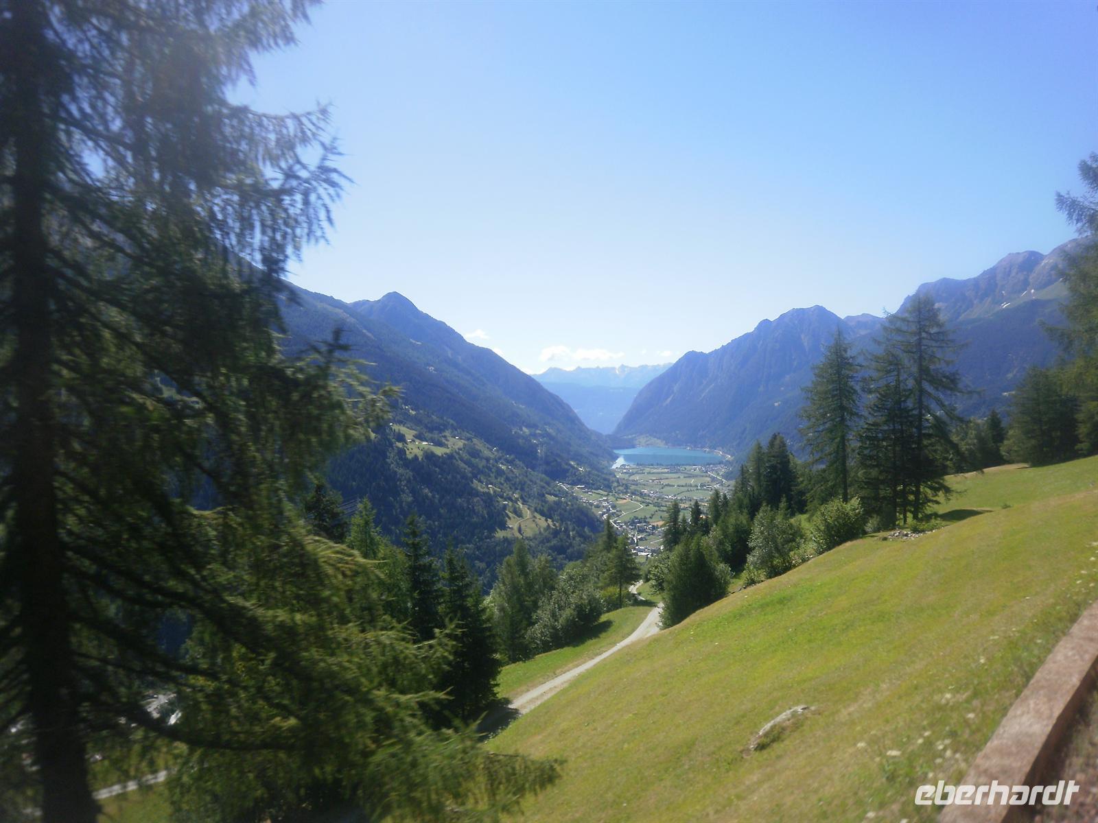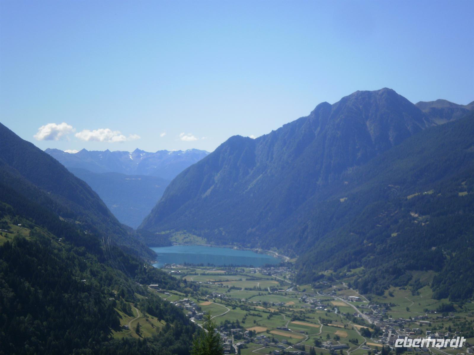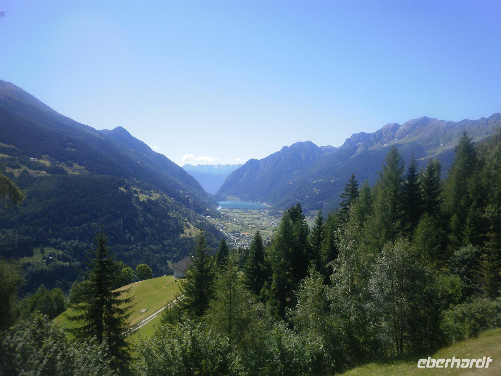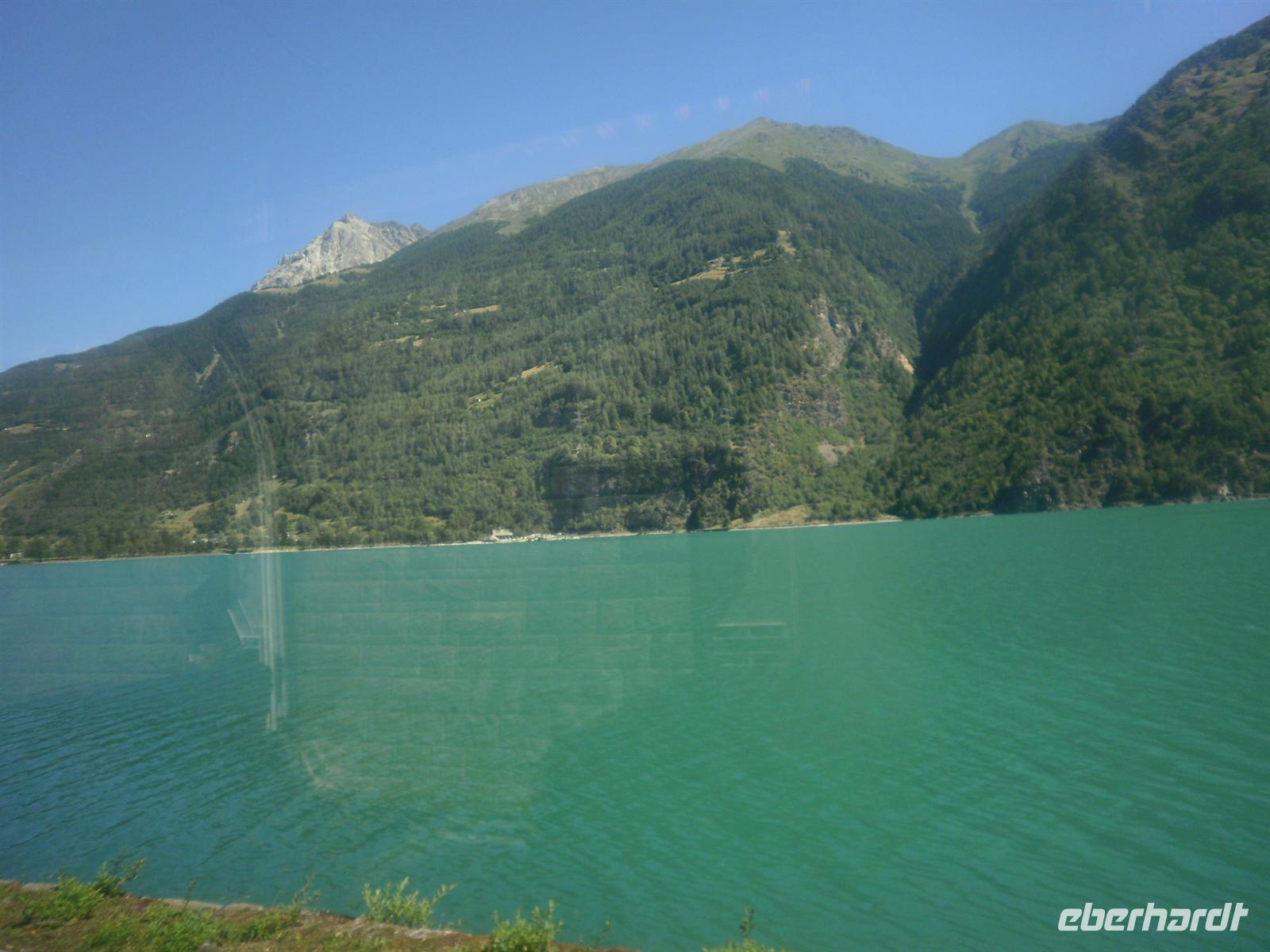 Für uns ging es nun mit dem Bus zurück. Nach kurzer Zeit erreichten wir wieder den Grenzübergang Italien - Schweiz und wie versprochen, legten wir auf der Rückfahrt ein paar Foto-Stopps ein, denn während unserer Bahnfahrt am Vormittag durften wir leider nicht aussteigen. Brusio sollte unser erstes Ziel sein, denn dort erlebt man eine wahre Einzigartigkeit - der Bernina-Express beschreibt eine Schleife über einen Kreisviadukt. 107 Meter ist er lang, und er dürfte zu den meistfotografierten Bauwerken der Rhätischen Bahn zählen. Diese 360-Grad-Kehre bringt wertvolle Höhenmeter, ein Griff in die Trickkiste der Bahnbauer, der sonst nur bei Kehrtunnels angewendet wird. Wir warteten auf einen Bernina-Zug, damit unser Foto perfekt war. Weiter hinauf ging es zum Lago di Poschiavo, wo wir zum See spazieren konnten.