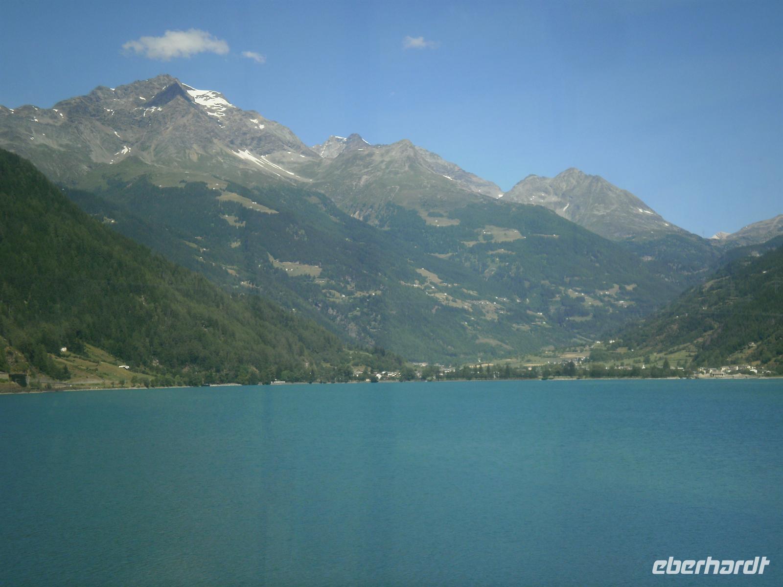 Wir mussten dafür zwar zeitig aufstehen, aber das störte niemanden. Mit unserem Bus ging es über den 2.383 m hoch gelegenen Flüela-Pass nach Pontresina. Dort stiegen wir bei herrlichem Sonnenschein in den Bernina-Express ein. Die Bernina-Linie ist die einzige Schweizerbahn, die offen über die Alpen führt. Sie wurde 1910 fertig gestellt und brachte uns von den Gletschern des Berninapasses auf 2.253 m ü. d. M. hinunter auf 429 m ü. d. M. nach Tirano. Während der Höhenunterschied zwischen Ospizio Bernina und Tirano 1.824 Meter beträgt, misst die Horizontaldistanz nur 22 Kilometer. Diese Höhendifferenz wird ohne Zahnrad-Strecken überwunden - trotz Steigungen von bis zu 70o/oo. Das ist das absolute Maximum, das eine Adhäsionsbahn noch nutzbringend bewältigen kann. Besonders raffiniert ist übrigens auch die Wahl der Linienführung. Sie ermöglicht nicht nur die Überwindung der immensen Höhenunterschiede, sie eröffnet dem Reisenden auch atemberaubende Ausblicke auf eine imposante Bergwelt, auf Gletscher und Täler.