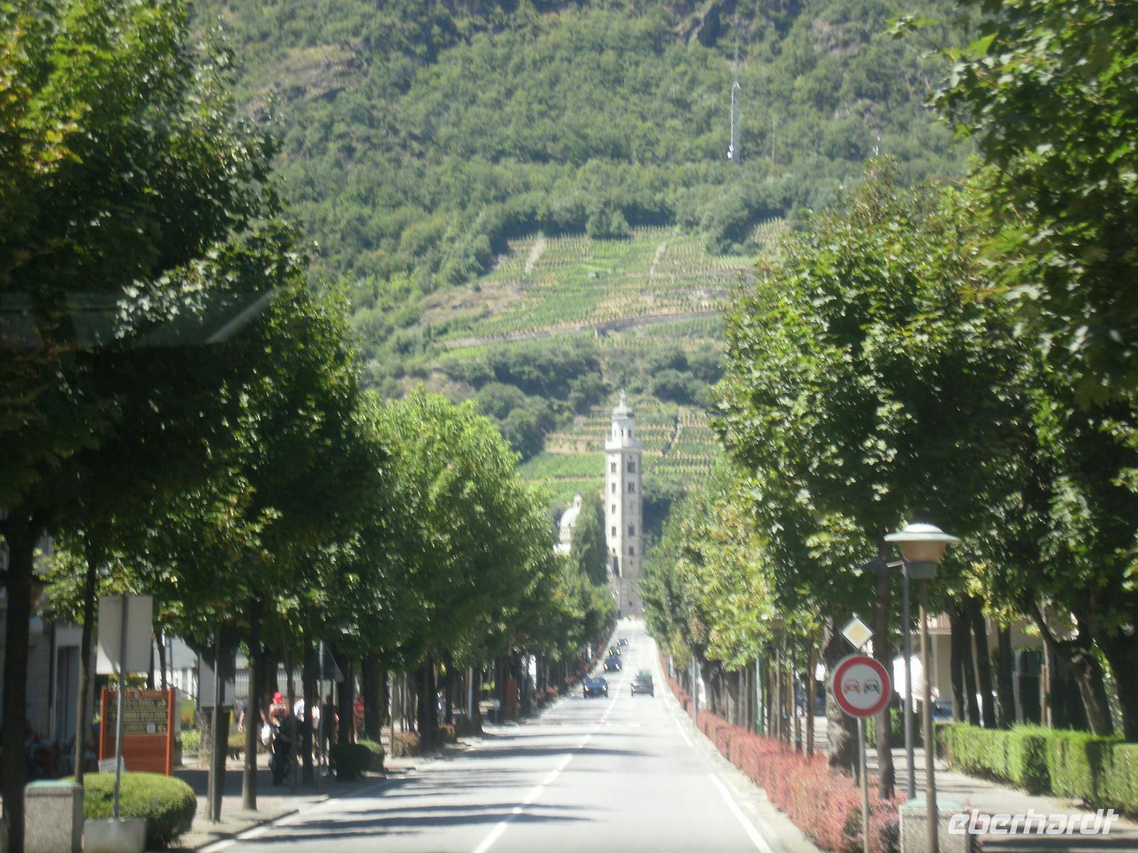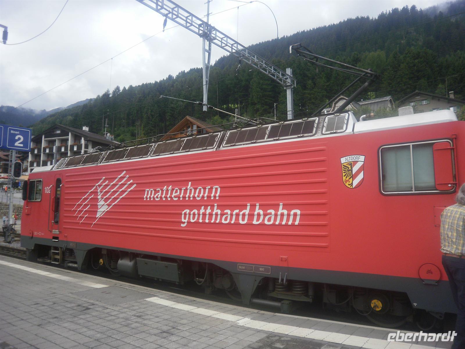 Am nächsten Morgen mussten wir dann leider schon wieder Abschied nehmen von dieser Region. Mit dem Pendelzug fuhren wir nach Täsch. Dort, ca. 5 Kilometer nördlich von Zermatt, mußte unser Bus parken, da Zermatt ein autofreier Ort ist. In Täsch angekommen, ging es dann gleich mit unserem Bus weiter. Mit unserem Gepäck war übrigens alles bestens organisiert, niemand mußte sich darum kümmern.