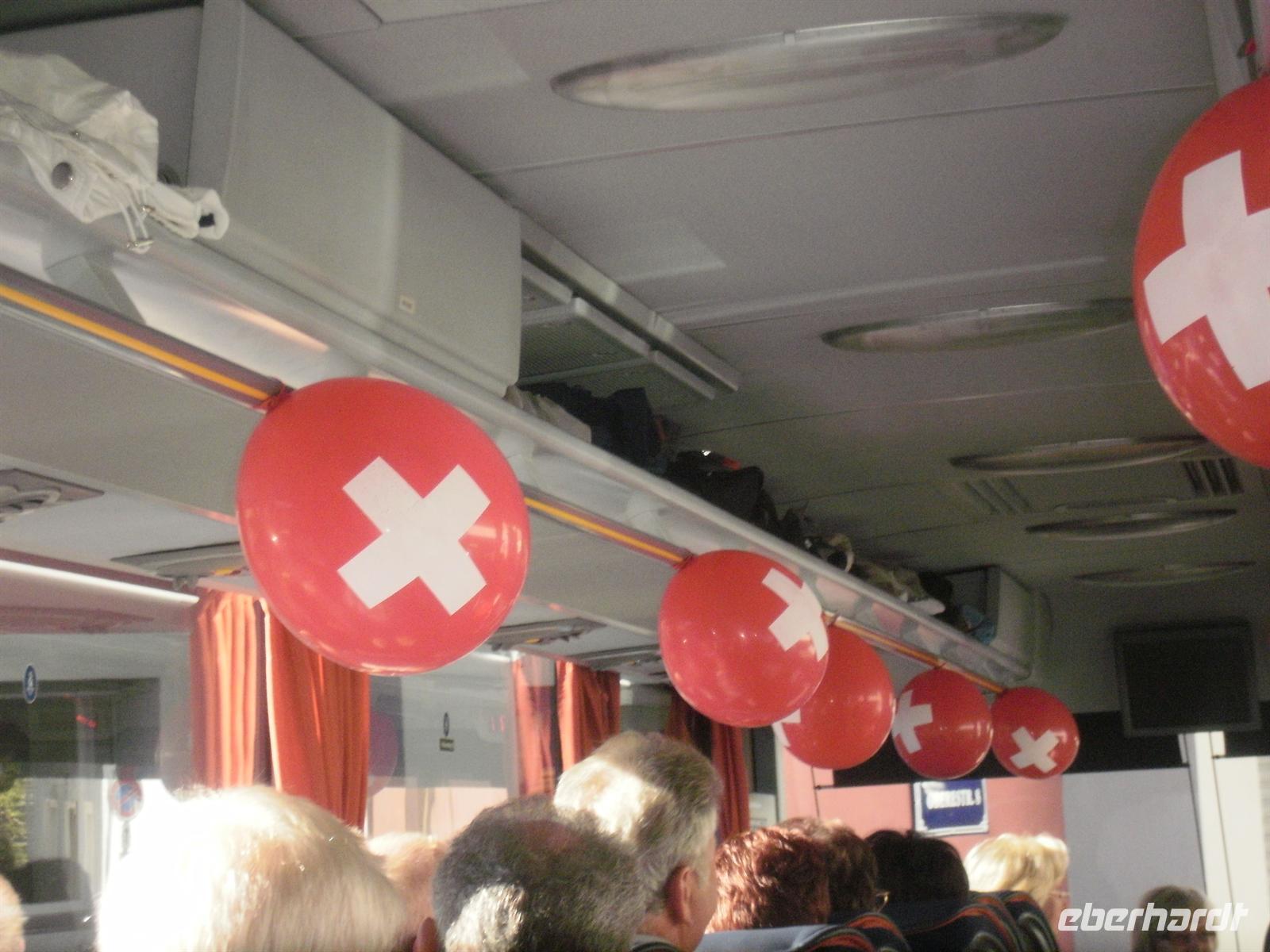 Pünktlich um 6 Uhr morgens ging es am Dresdner Flughafen los. Die letzten Gäste stiegen am Autohof in Münchberg zu und damit war unsere Reisegruppe mit 31 Personen komplett. Wie bei unseren Reisen üblich, legten wir im Abstand von jeweils etwa zwei Stunden eine Pause ein. So konnte jeder mal etwas frische Luft schnappen beziehungsweise sich die Beine vertreten. Die Fahrt führte uns über Nürnberg und Ulm in Richtung Bodensee.
