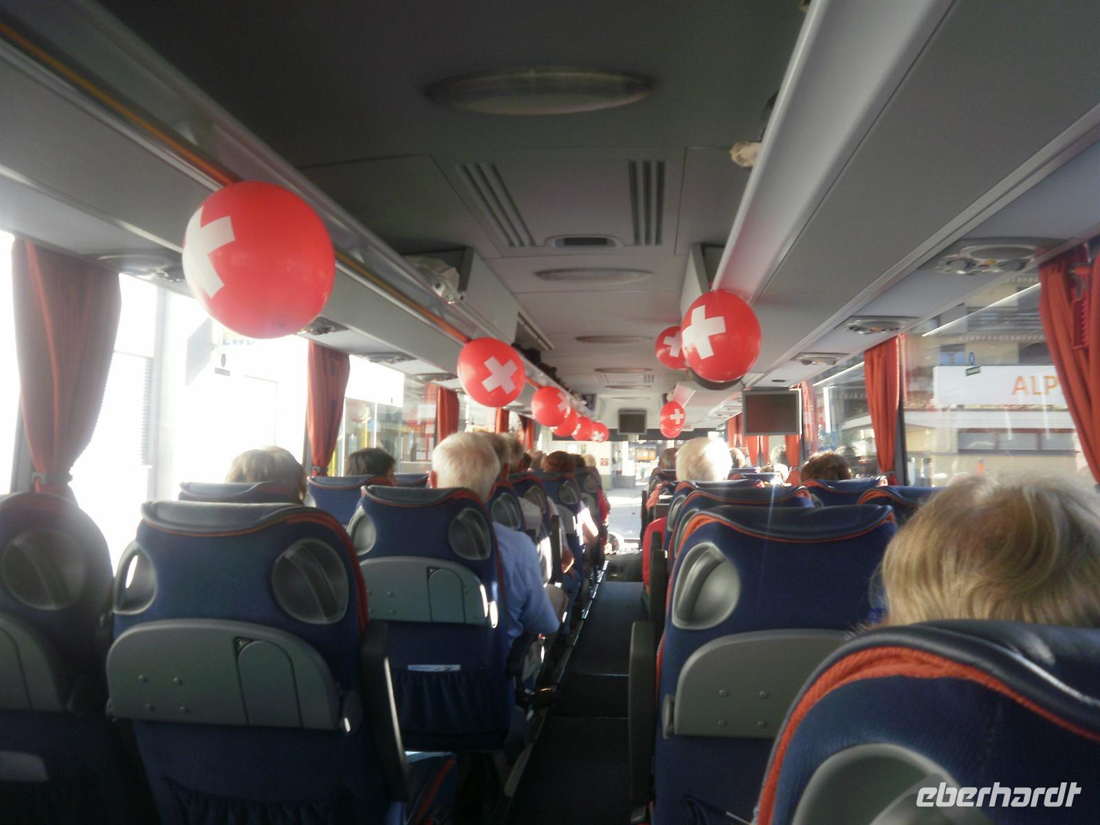Heute war übrigens ein ganz besonderer Tag - der Schweizer Nationalfeiertag! Den Bus hatten unser Buschauffeur Andreas und unsere Reiseleiterin Katrin bereits am Vorabend mit Luftballons geschmückt. Am 1. August 1291 schlossen sich nämlich die Urkantone Uri, Schwyz und Unterwalden auf dem legendären Rütli am Vierwaldstättersee zum ewigen Bund zusammen. Dieser Bund diente zur gemeinsamen Abwehr fremder Übergriffe auf ihren Besitz und ihre Rechte. Im Laufe der folgenden Jahrzehnte traten dieser "Eidgenossenschaft" weitere städtische und ländliche Gebiete bei. Der 1. August 1291 gilt noch heute als die Geburtsstunde der Schweiz und damit wird alljährlich am 1. August der Nationalfeiertag gefeiert. Unsere heutige Fahrt führte uns wiederum über den Flüela-Pass vorerst ins Unterengadin. Das Engadin ist übrigens das Bündner Inntal.