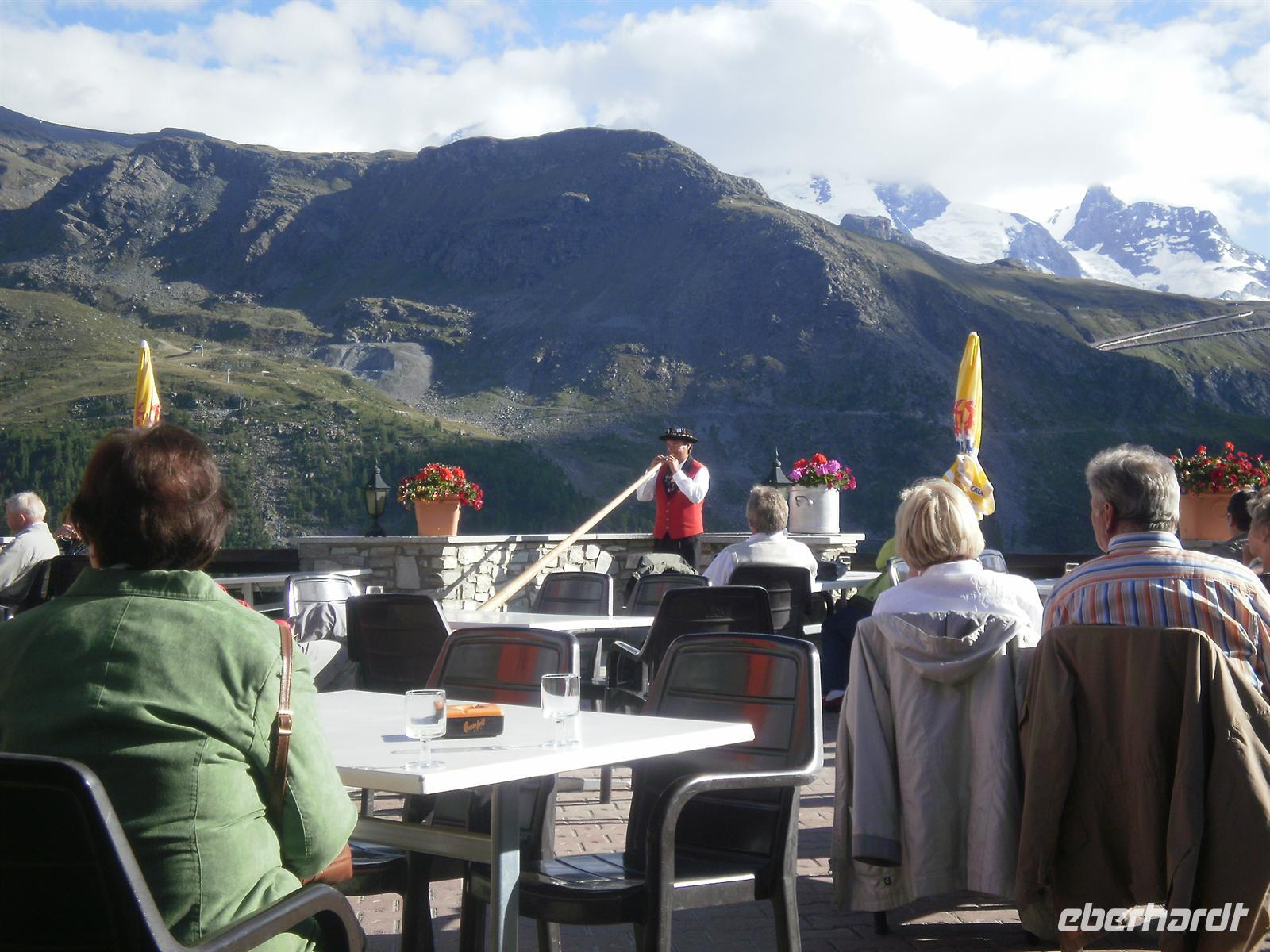 Fast alle Gäste unserer Reisegruppe fuhren bereits am Vormittag mit der höchsten, frei im Gelände angelegten Zahnradbahn Europas auf den 3.089 Meter hohen Gornergrat. Nachdem wir vorerst nur vereinzelt ein paar Gletscher und Berge erkennen konnten, war das Panorama und der Blick auf einige Viertausender etwas später einfach atemberaubend und unbeschreiblich! Auch für einen Spaziergang in Zermatt blieb noch genügend Zeit. Besonders interessant ist das alte Zermatt mit den typisch Walliser Holzhäusern.