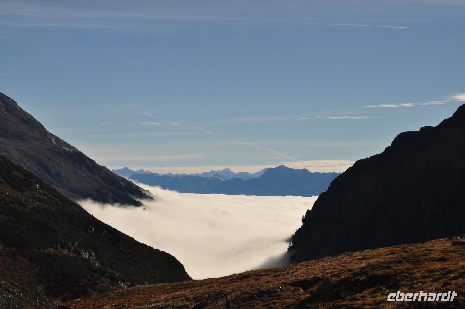 Die schlappen Seile der Bahn trugen uns sicher hinauf in 2500 m Höhe. Um 8:00 Uhr ragten zahlreiche nahe und ferne Gipfel aus dem Wolkenmeer, um bereits eine Stunde später völlig in den Wolken verschwunden zu sein. Bei -1 Grad Celsius trotzdem ein Erlebnis und bei der Abfahrt konnten wir wieder einige schöne Ausblicke erheischen.