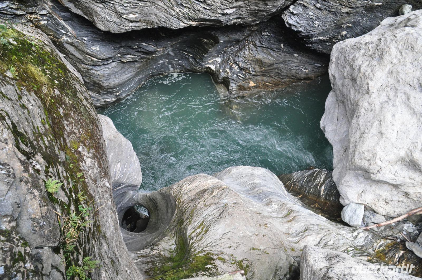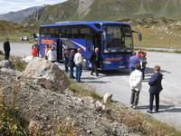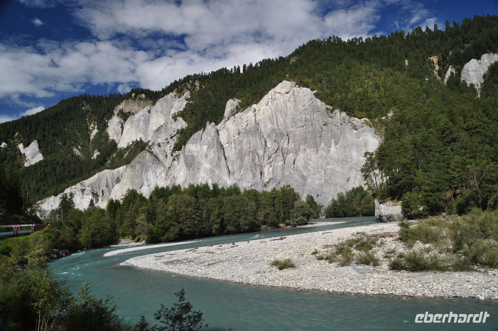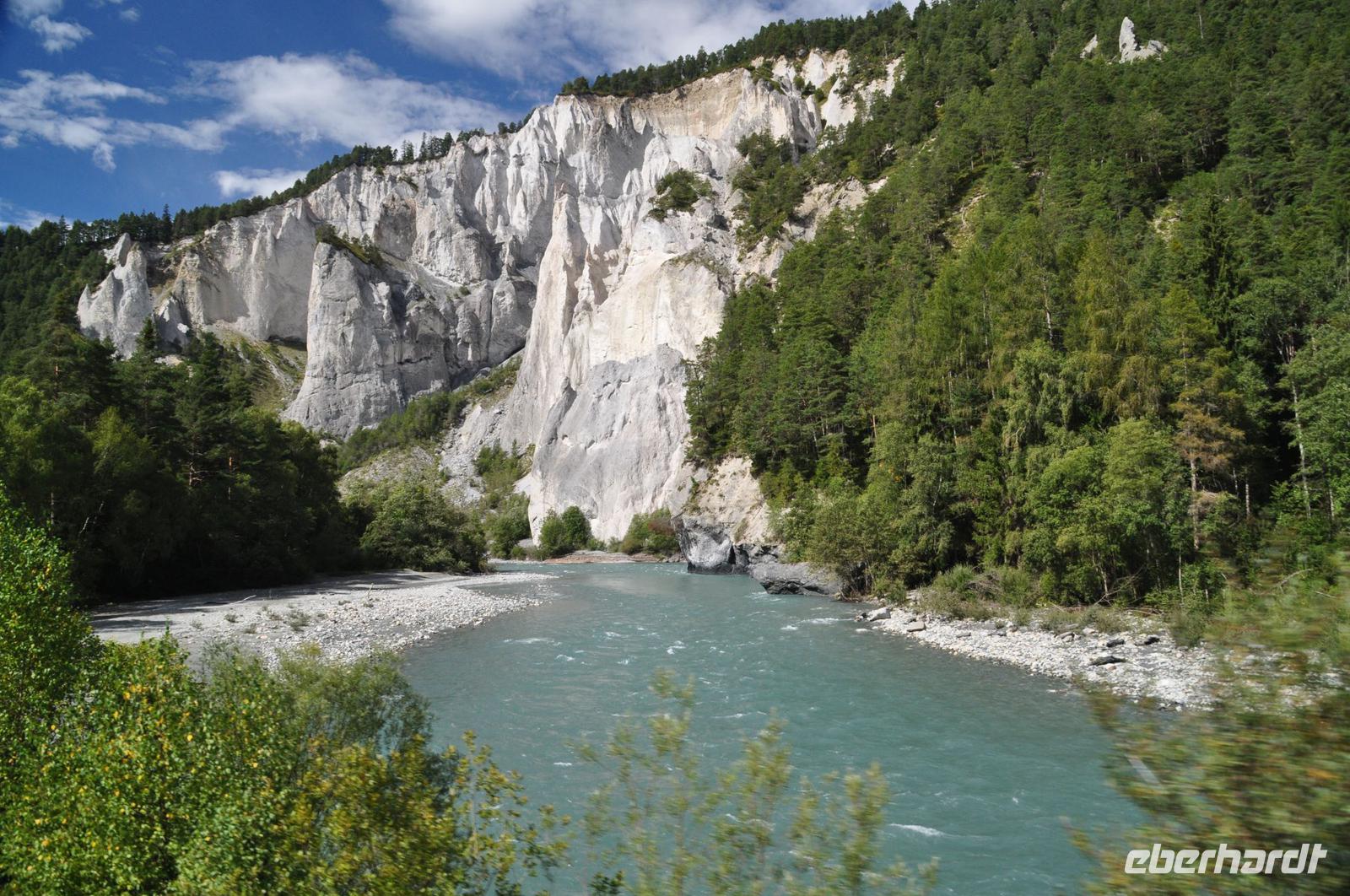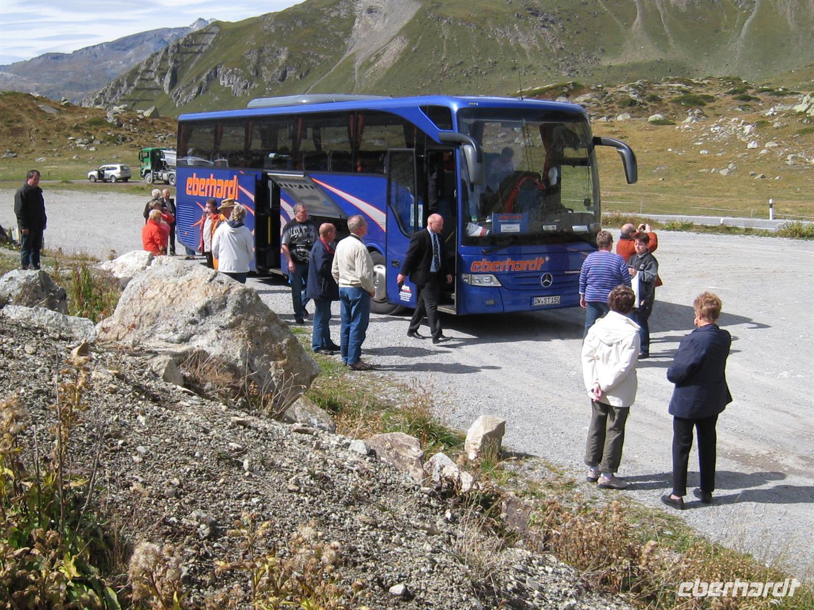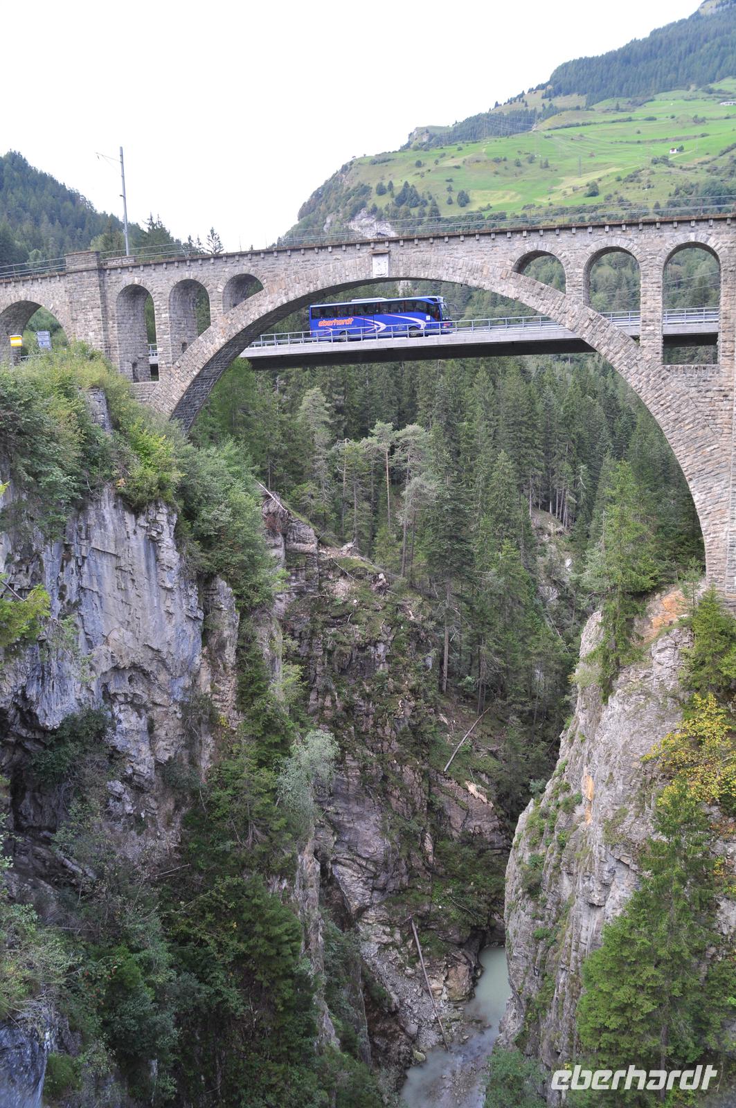 Am Fluela-Pass lernten wir Schweizer Gastfreundschaft kennen und fuhren zügig ins Inntal, das dem Engadin seinen Namen gab. Im Wintersportort der Schönen und Reichen erwartete uns der übliche Sonnenschein; mancher fand den ?Schiefen Turm" von St. Moritz durchaus vergleichbar mit schiefen Türmen in Mitteldeutschland. Herrliches Bergszenario am Julierpass und dann hinab wieder nach Graubünden. Am Solisviadukt inszenierte unser Fahrer Andreas eine fotogene Situation, bis dann sogar noch der Glacier-Express vorbeirauschte. Den noch jungen Rhein bestaunten wir in der Tiefe der Via Mala Schlucht und waren fasziniert von der Kraft des Wassers am Felsgestein.