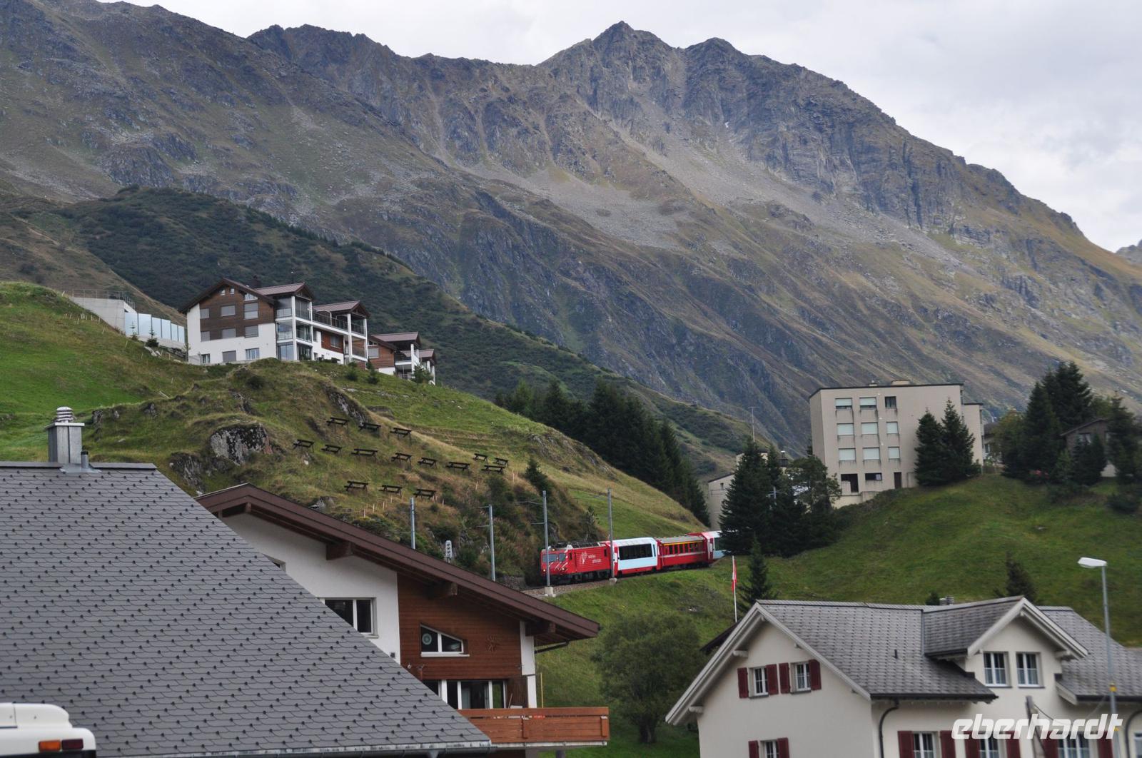 Mit dem langsamsten Schnellzug der Welt ging es von Davos durch Flusstäler (Albula, Landwasser, Rhein, Rhone, Visp und Matter) und über den Oberalppass bis Zermatt. Vor der Auffahrt zum Oberalppass werden in Chur die Züge geteilt - für manchen eine neue Herausforderung der Trennung, um den Partner dann in Andermatt wieder in die Arme zu schließen. Glacier heißt Gletscher und so konnten wir im Mattertal tatsächlich Ausblick halten auf einige schöne Eisflüsse.