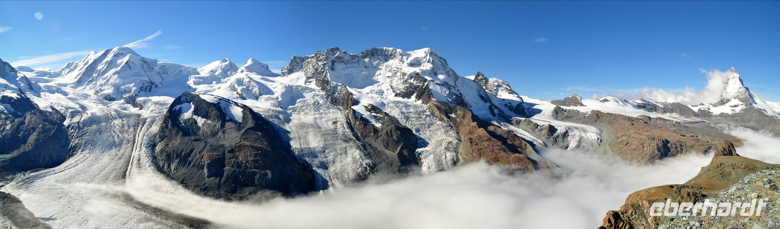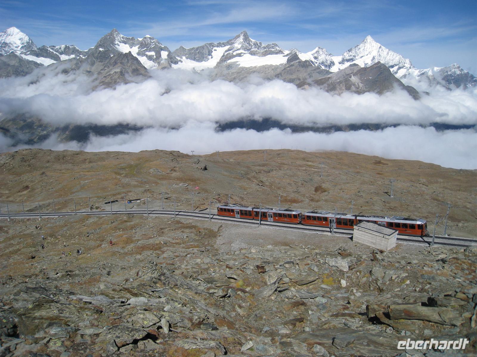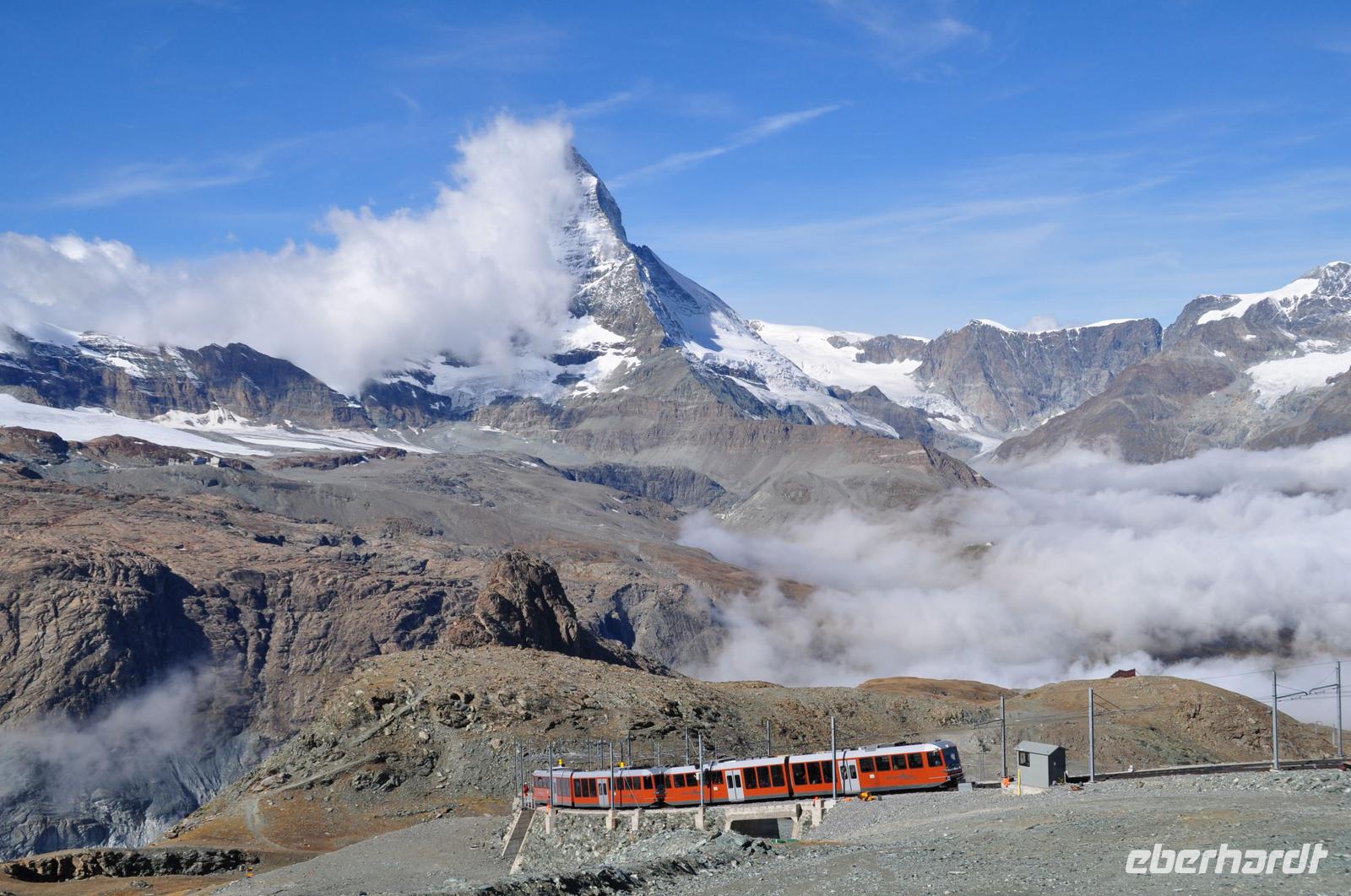 Schweiz - wie man sie sich vorstellt: Expresszüge über Alpenpässe, weltbekannte Bergorte, Matterhorn und andere Viertausender im Sonnenschein, Säntis überm Wolkenmeer