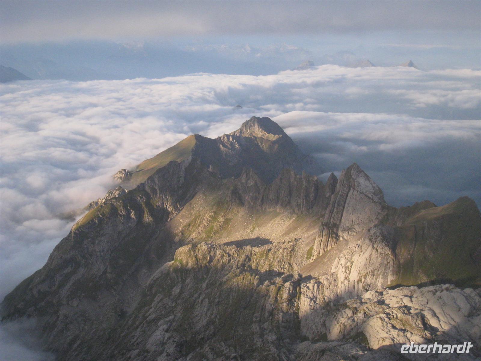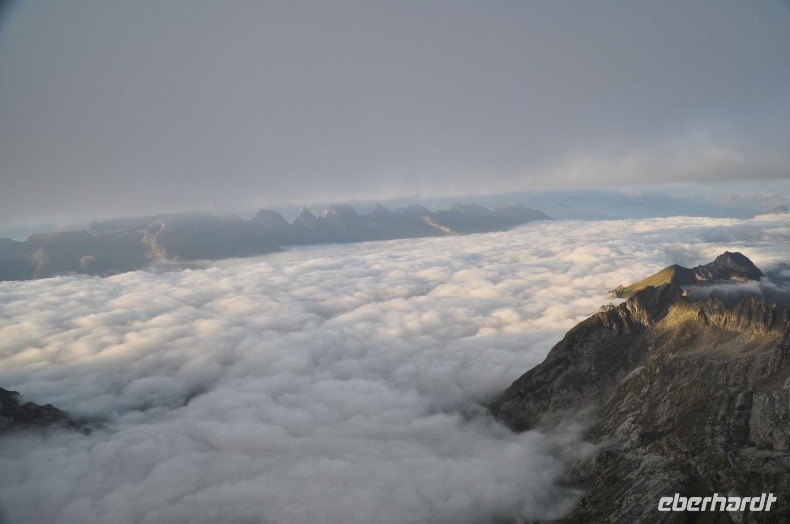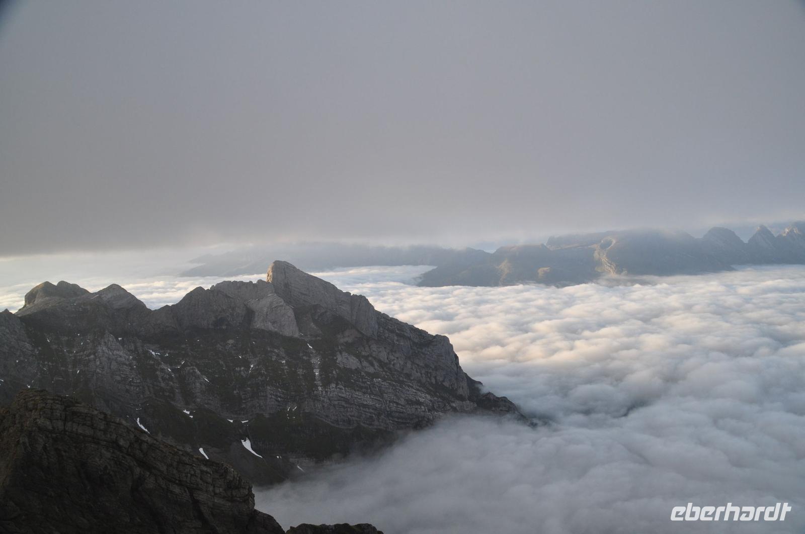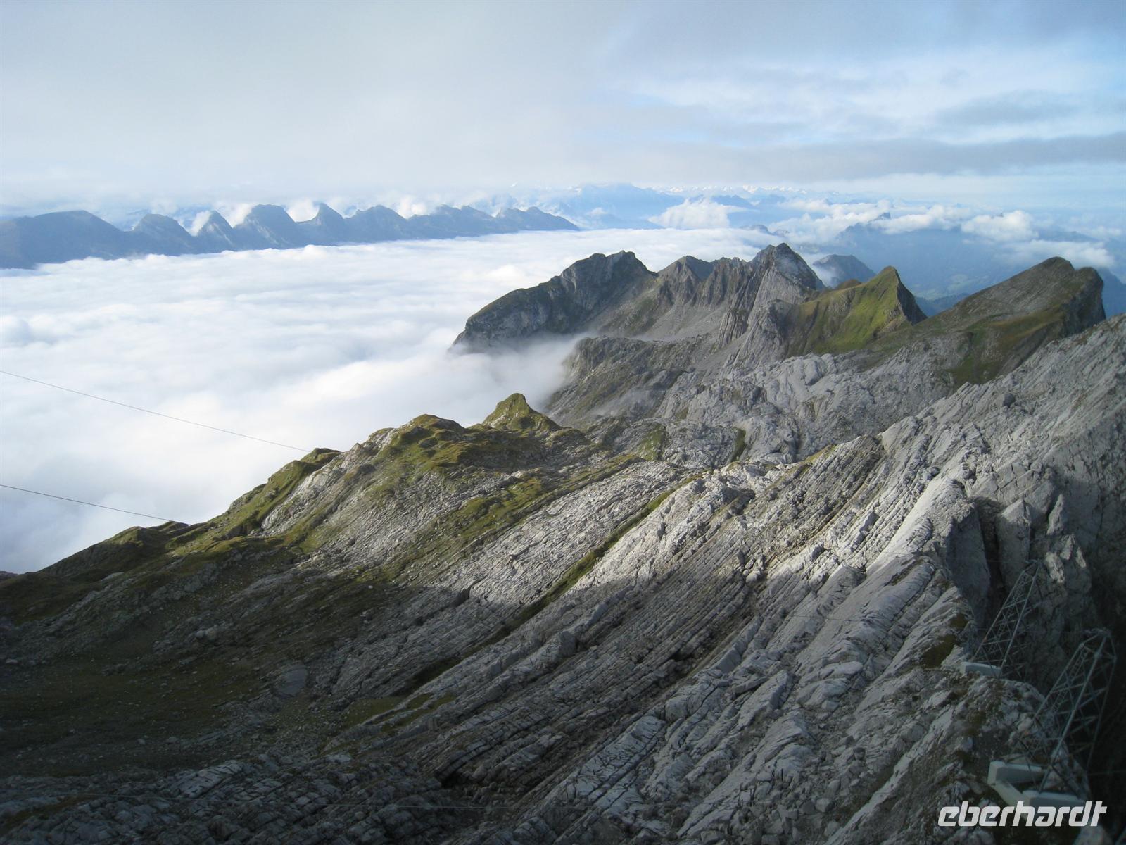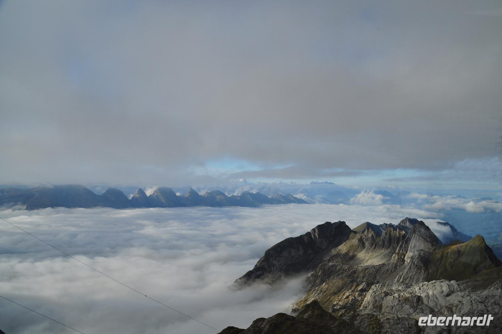 Warum einen Urlaubstag nur unter das Motto Heimfahrt stellen? Gerade solch ein Tag sollte noch ein Erlebnis beinhalten: Frühstück über dem Wolkenmeer der Schweiz auf dem Gipfel des Säntis.
