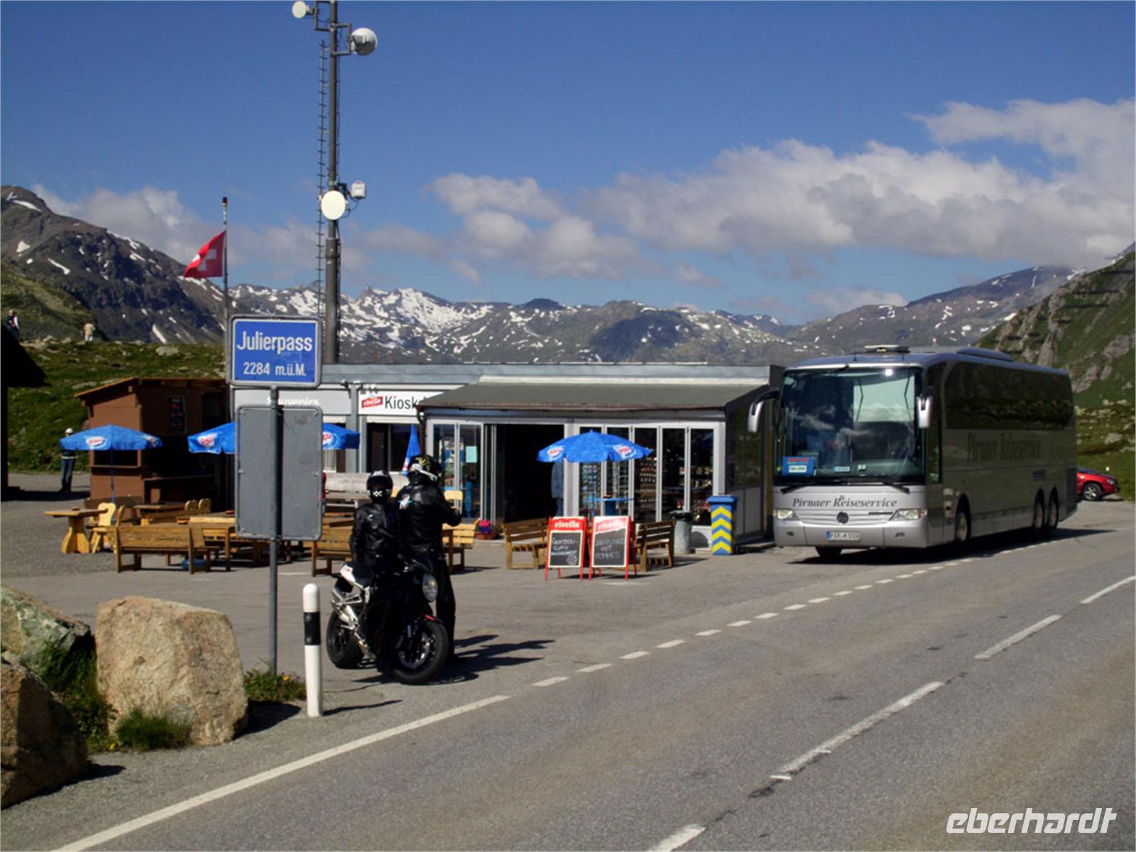 Heute geht es in das Engadin. Das fast 90 km lange Tal splittet sich in das Ober- und Unterengadin auf. Wir müssen wieder über den Julierpass, und machen deshalb einen Photostop am Marmoreta Stausee. Unsere geplante Route über den Füelapass ist leider wegen Bauarbeiten gesperrt. Doch auch so erreichen wir am späten Vormittag Sankt Moritz, den zum Ort der Reichen und Schönen künstlich hochstiliserten Alpenmetropole. Wir unternehmen einen kleinen Stadtrundgang bis zum schiefen Turm von Sankt Mauritius und beenden unseren Besuch mit einem Kaffee am See von Sankt Moritz.