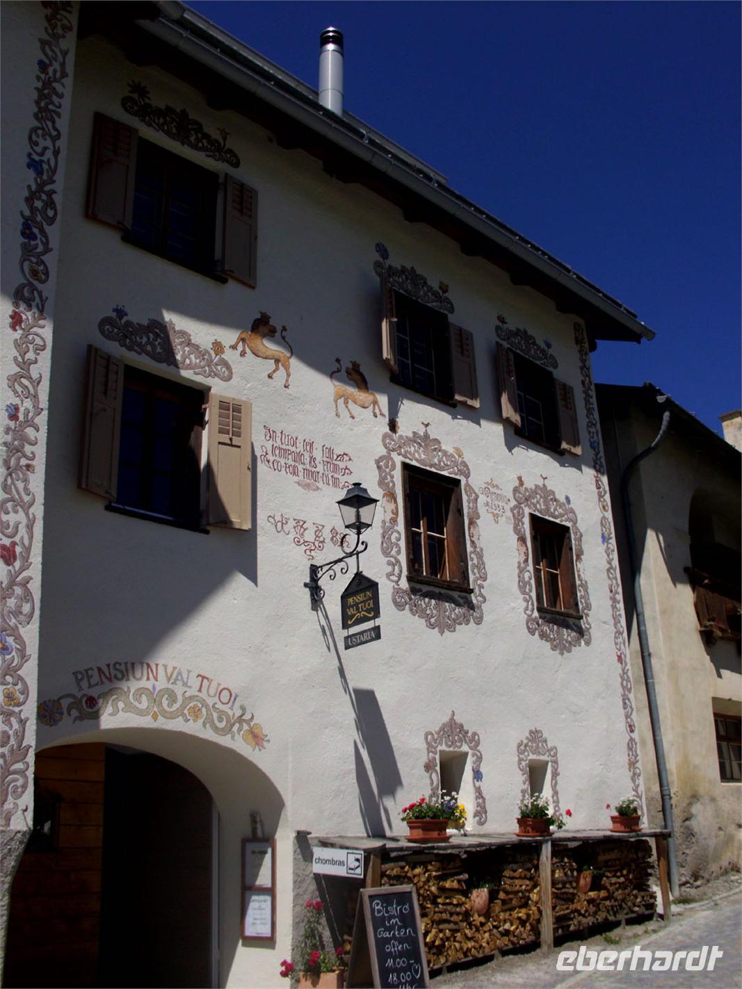 Unser Ziel ist Guarda, eines der schönsten Dörfer des Engadin. Enge Serpentinen führen hinauf und man muss eine Strecke laufen, bis man im Dorf ist. Aber hier sind alle Häuser mit der Sgraffittotechnik reich verziert worden und entstammen teilweise noch dem 17. Jh.