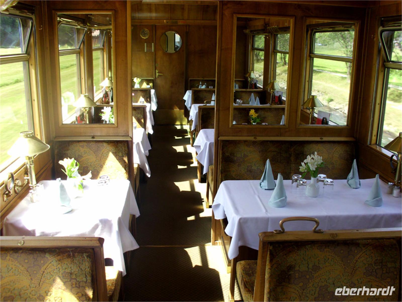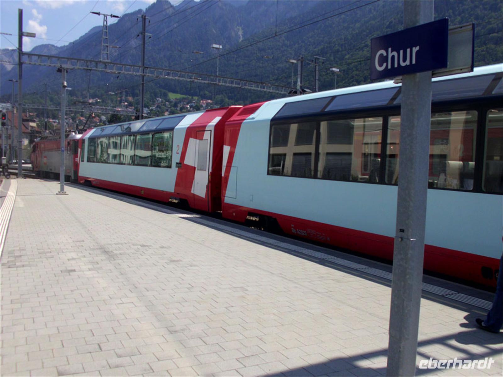 Von Davos aus geht es nach über den 2033 m hohen Oberalppass nach Andermatt und über verschiedene Pässe und weiter nach Brigg und Visp. Der Wagon ist klimatisiert und man merkt die 30 Grad im Schatten erst, wenn man bei einer der Kupplungspausen aussteigt.