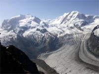 Man kann an jeder Station aussteigen und wieder einsteigen. Auf dem Gornergat verschlägt es einem die Sprache ob der grandiosen Bergwelt. Links das Matterhorn, der schönste Berg der Alpen. Über das kleine Matterhorn schweift der Blick nach links über Castor und Pollux auf die Dufourpitze zu, dem höchsten Berg der Schweiz mit 4634 m Höhe. Die Aussicht überwältigend. Unten in der Tiefe fließen die Gletscher zusammen. Das kundige Auge sieht aber auch, dass die Gletscher einmal größer gewesen sind.