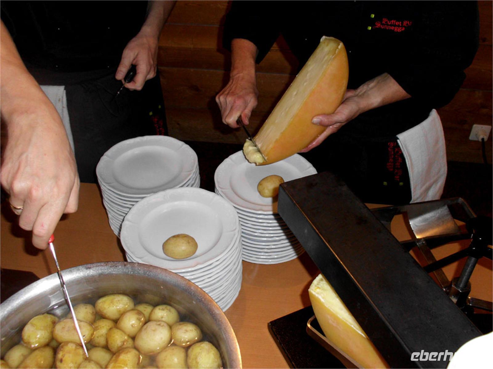 Als Hauptgang gibt es Raclette mit Pellkartoffel, Glaszwiebeln und sauren Gurken, soviel wie man möchte. Das Dessert besteht aus Eis mit Früchten.