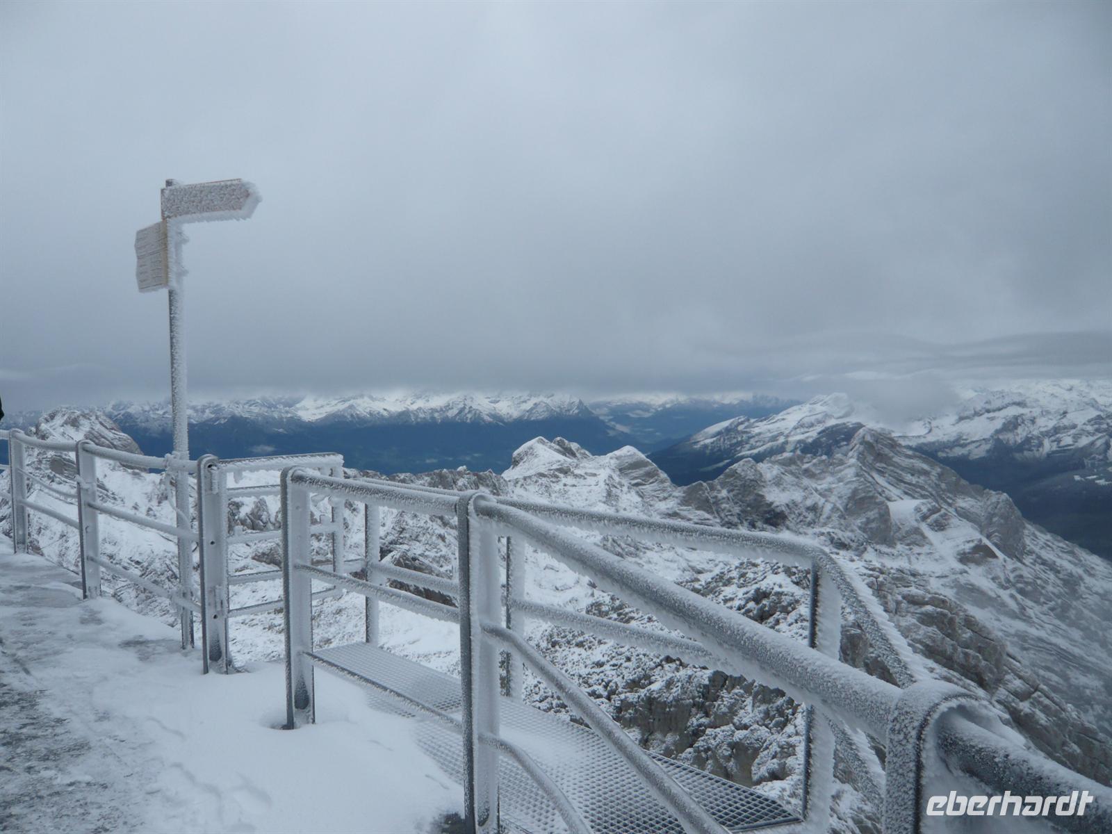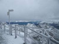 Wiederum meinte das Wetter es gut mit uns. Am Vortag und am Morgen hatte es geschneit, so dass auf dem Säntis Eis und Schnee lag. Dadurch konnten wir allerdings nicht auf die obere Plattform hinaus, aber der Ausgang vom Foyer aus war offen, so dass wir doch auf die untere Plattform hinaus konnten und die Aussicht genießen.