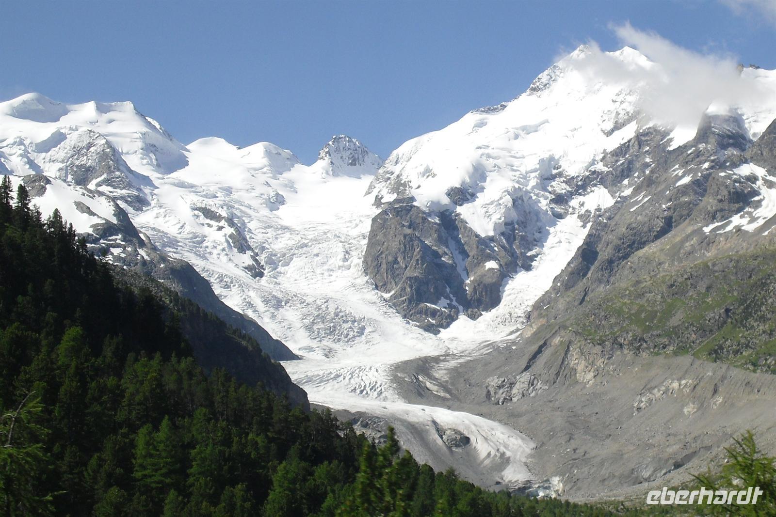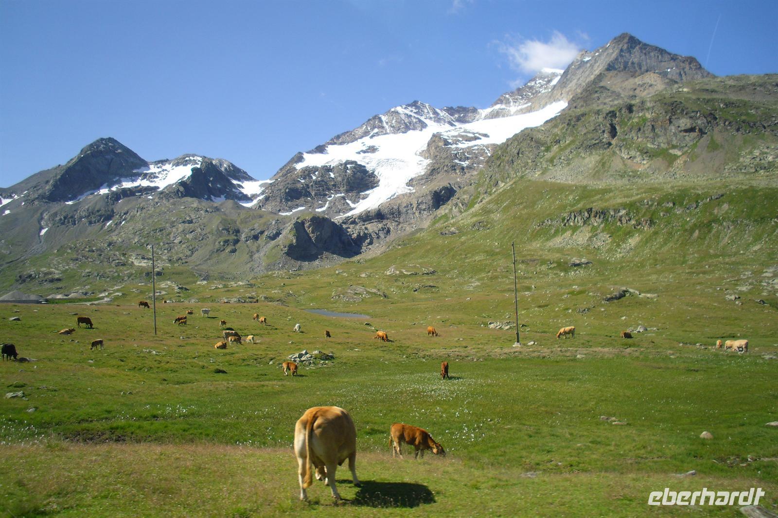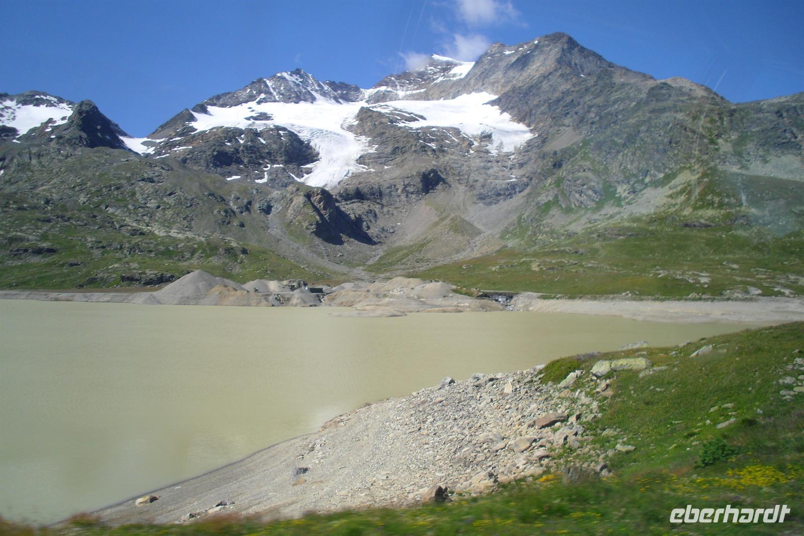 Heute stand bereits der erste Höhepunkt dieser Reise, die Fahrt mit dem Bernina-Express, auf dem Programm. Wir mußten dafür zwar zeitig aufstehen, aber das störte niemanden. Mit unserem Bus ging es über den 2.383 m hoch gelegenen Flüela-Pass nach Pontresina. Dort stiegen wir bei herrlichem Sonnenschein in den Bernina-Express ein. Die Bernina-Linie ist übrigens die einzige