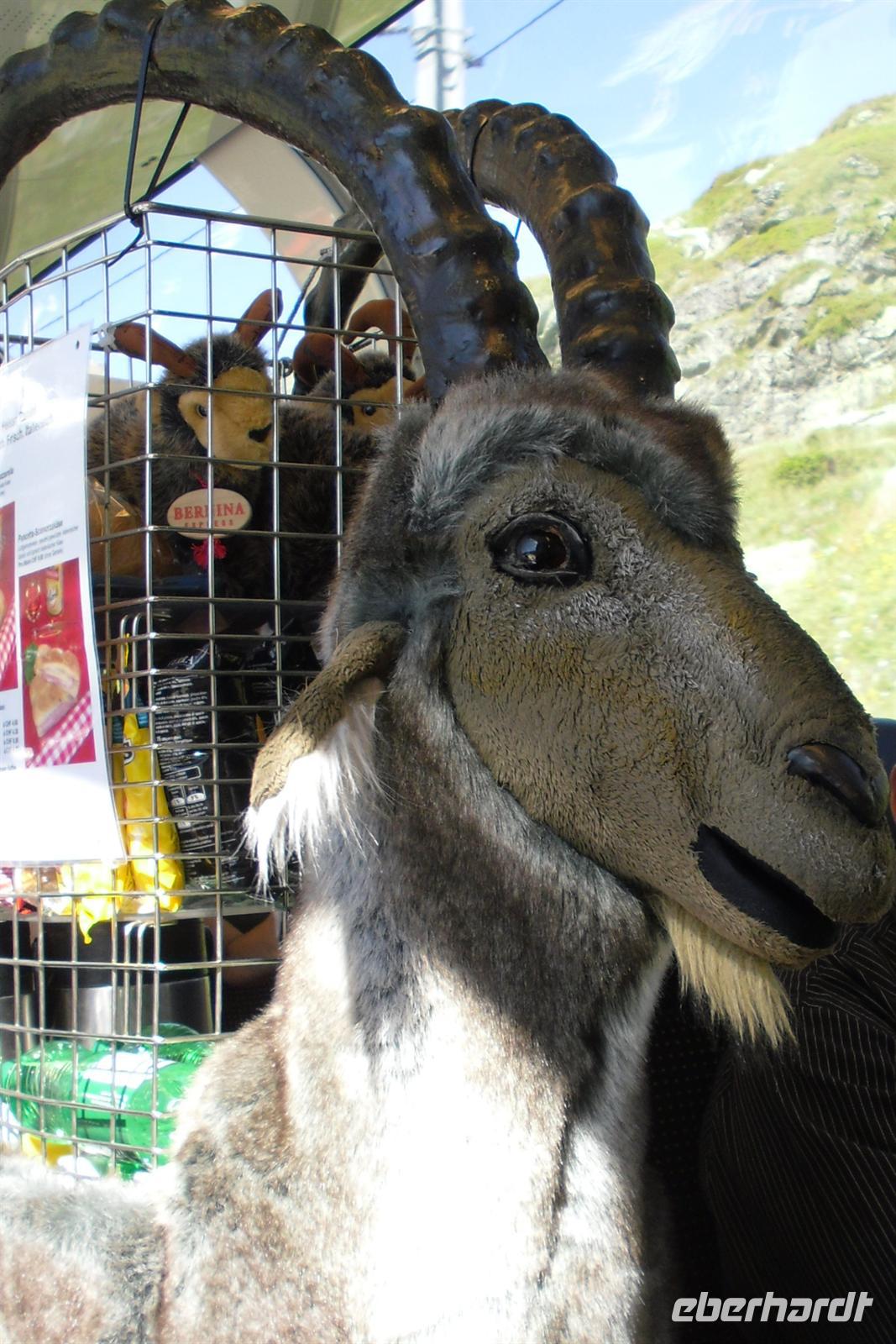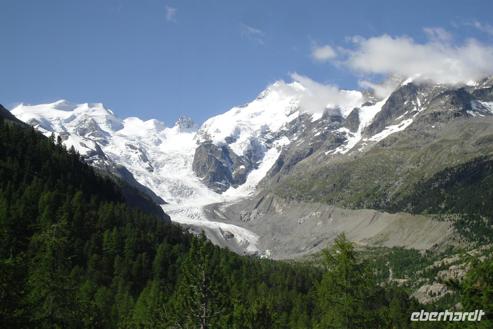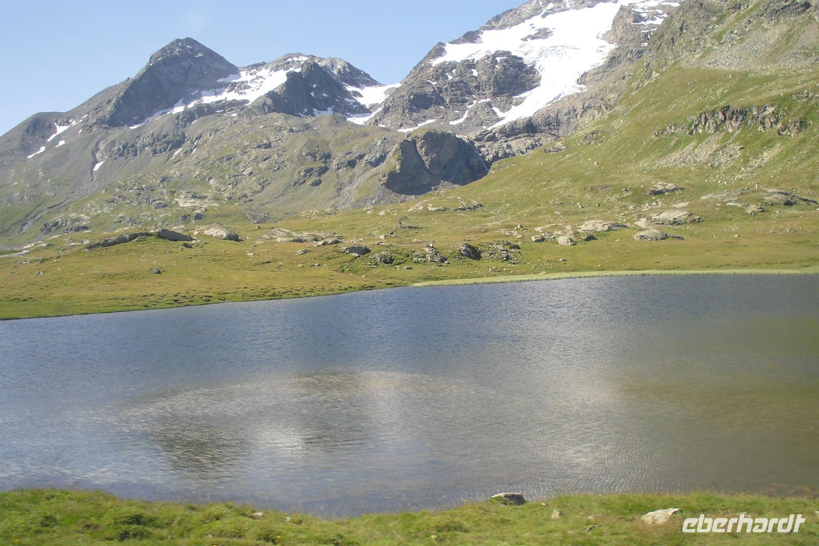 Heute stand bereits der erste Höhepunkt dieser Reise, die Fahrt mit dem Bernina-Express, auf dem Programm. Wir mußten dafür zwar zeitig aufstehen, aber das störte niemanden. Mit unserem Bus ging es über den 2.383 m hoch gelegenen Flüela-Pass nach Pontresina. Dort stiegen wir bei herrlichem Sonnenschein in den Bernina-Express ein. Die Bernina-Linie ist übrigens die einzige