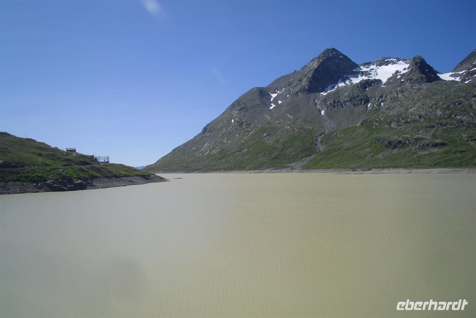 In Italien pflegt man nämlich die Tradition der Siesta und ein altes römische Sprichwort sagt: "Zu dieser Zeit sind nur Hunde und Franzosen unterwegs...". Für uns ging es am Nachmittag mit dem Bus zurück. Nach kurzer Zeit erreichten wir wieder den Grenzübergang Italien - Schweiz und wie versprochen, legten wir auf der Rückfahrt ein paar Foto-Stopps ein, denn während unserer Bahnfahrt am Vormittag durften wir leider nicht aussteigen. Brusio sollte unser erstes Ziel sein, denn dort erlebt man eine wahre Einzigartigkeit - der Bernina-Express beschreibt eine Schleife über einen Kreisviadukt. 107 Meter ist er lang, und er dürfte zu den meistfotografierten Bauwerken der Rhätischen Bahn zählen. Diese 360-Grad-Kehre bringt wertvolle Höhenmeter, ein Griff in die Trickkiste der Bahnbauer, der sonst nur bei Kehrtunnels angewendet wird. Wir warteten auf einen Bernina-Zug, damit unser Foto perfekt war. Weiter hinauf ging es zum Lago di Poschiavo, wo wir zum See spazieren konnten. Durch die Ortschaften des Val di Poschiavo, einem italienischsprachigen Südtal des Kantons Graubünden, erreichten wir die Bernina-Passstraße. Diese ist gewöhnlich ganzjährig geöffnet und stellt die Verbindung zwischen dem Puschlav im Süden und dem Engadin im Norden dar. Damit ist der Pass gleichzeitig eine Sprachgrenze. Eine gelbe Tafel auf dem Pass signalisiert die Europäische Wasserscheide, das Wasser in Richtung Süden gelangt über die Flüsse Poschiavino, Adda und Po ins Adriatische Meer und das Wasser in Richtung Norden wird über den Inn und die Donau ins Schwarze Meer geleitet. Nach einem Aufenthalt auf dem Bernina-Pass ging es mit einem kurzen Stopp mit Blick auf den Morteratsch-Gletscher zurück über den Flüela-Pass nach Davos. Nun ging ein langer und erlebnisreicher Tag zu Ende.