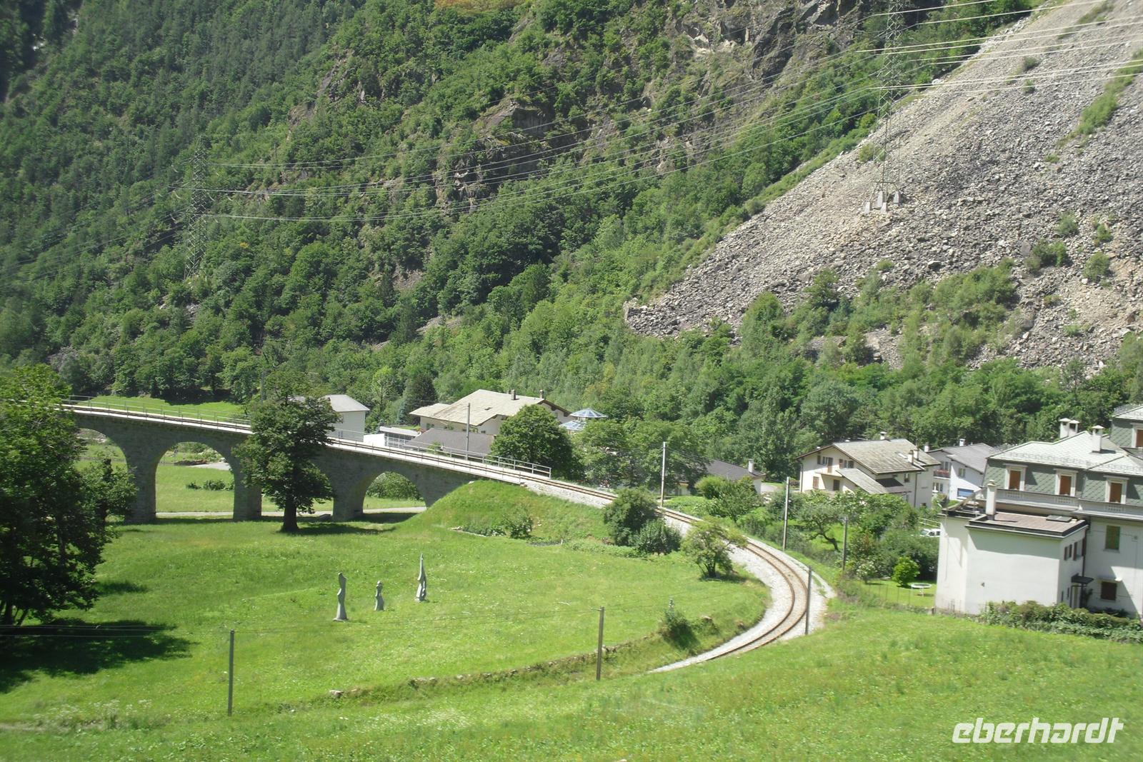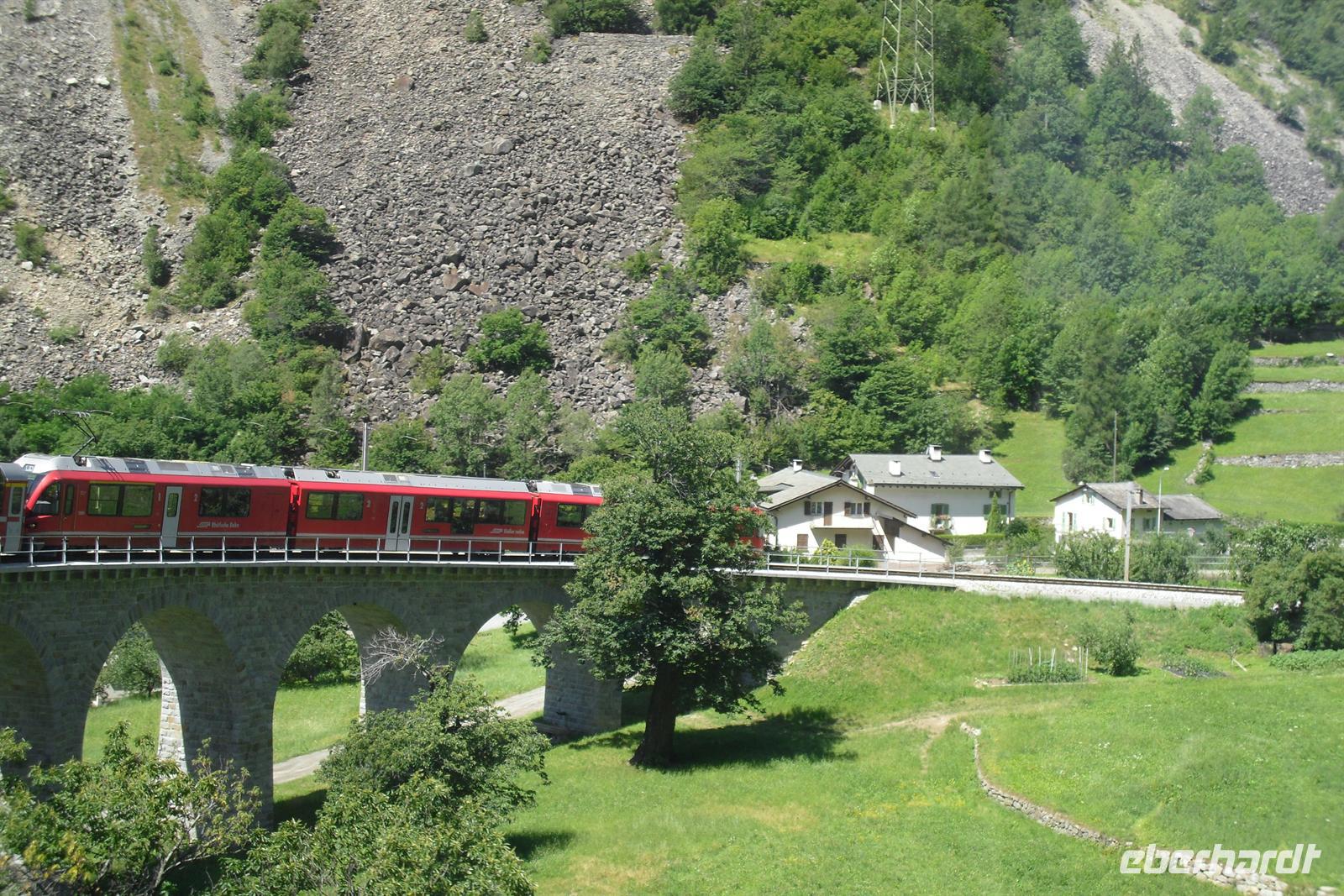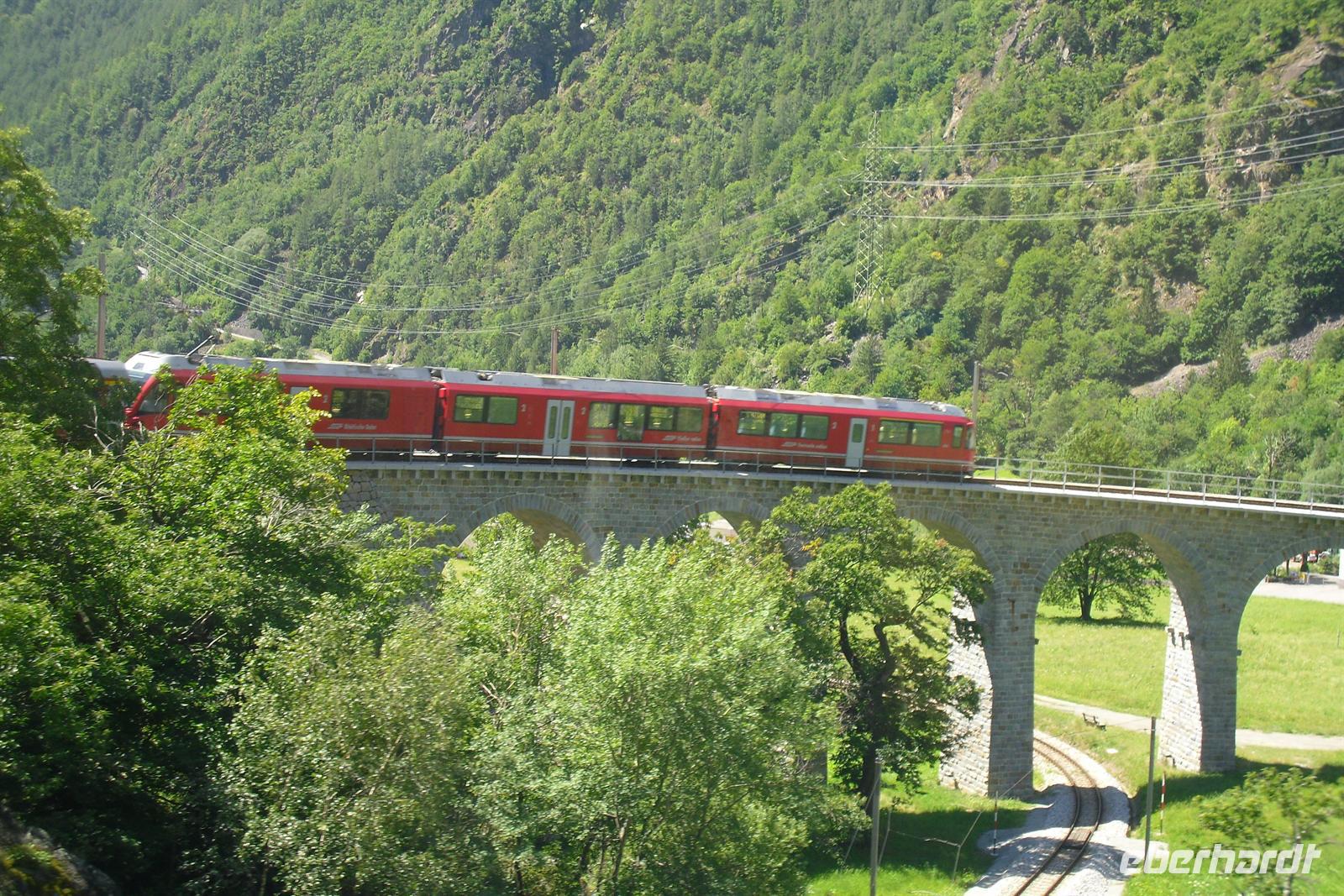 Schweizerbahn, die offen über die Alpen führt. Sie wurde 1910 fertig gestellt und brachte uns von den Gletschern des Berninapasses auf 2.253 m ü. d. M. hinunter auf 429 m ü. d. M. nach Tirano. Während der Höhenunterschied zwischen Ospizio Bernina und Tirano 1.824 Meter beträgt, misst die Horizontaldistanz nur 22 Kilometer. Diese Höhendifferenz wird ohne Zahnrad-Strecken überwunden - trotz Steigungen von bis zu 70o/oo. Das ist das absolute Maximum, das eine Adhäsionsbahn noch nutzbringend bewältigen kann. Besonders raffiniert ist übrigens auch die Wahl der Linienführung. Sie ermöglicht nicht nur die Überwindung der immensen Höhenunterschiede, sie eröffnet dem Reisenden auch atemberaubende Ausblicke auf eine imposante Bergwelt, auf Gletscher und Täler. Gegen Mittag kamen wir nach einer etwa 2-stündigen Fahrt im Bernina-Express im italienischen Tirano an und die meisten von uns gingen zum Mittagessen ins Restaurant "Al Portici". Einige von uns probierten hier - auf meine Empfehlung hin - eine Spezialität dieser Gegend, nämlich "Pizzoccheri". Das ist eine Mischung aus Buchweizennudeln, Spinat, Karotten, Knoblauch, Zwiebeln und das alles mit Butter und Käse überbacken. Dazu gab es für einige ein Glas Hauswein, natürlich aus dieser Gegend - dem milden Veltlin. Wir hatten wahrhaftig Temperaturen an die 30 Grad. Einige von uns nutzten auch noch die Gelegenheit und spazierten zur Wallfahrtkirche "Madonna di Tirano" - diese Kirche mit ihren herrlichen Fresken hatte heute sogar ihre Türen geöffnet, denn meistens ist sie über die Mittagszeit geschlossen - wie fast alle Geschäfte hier!