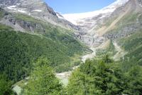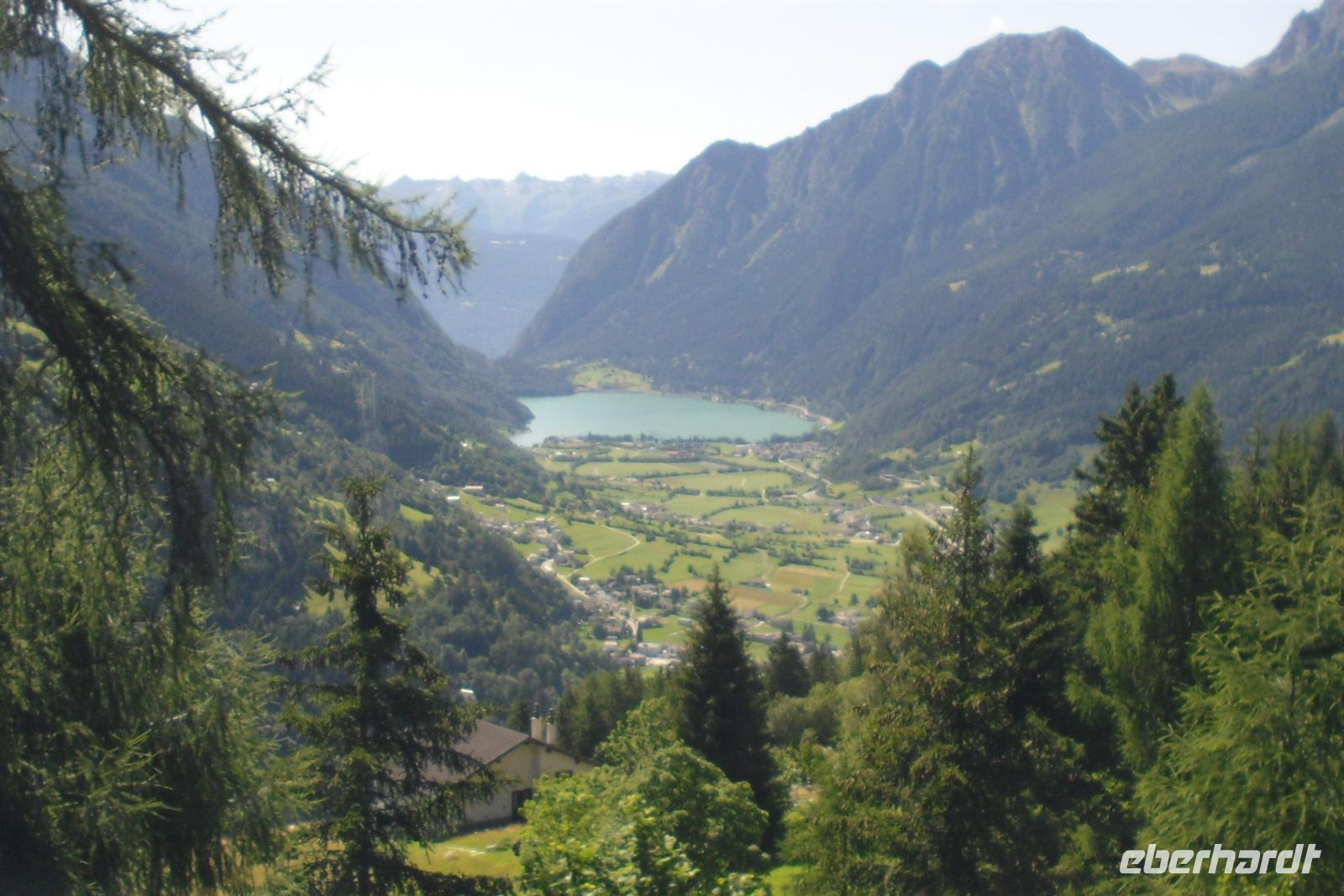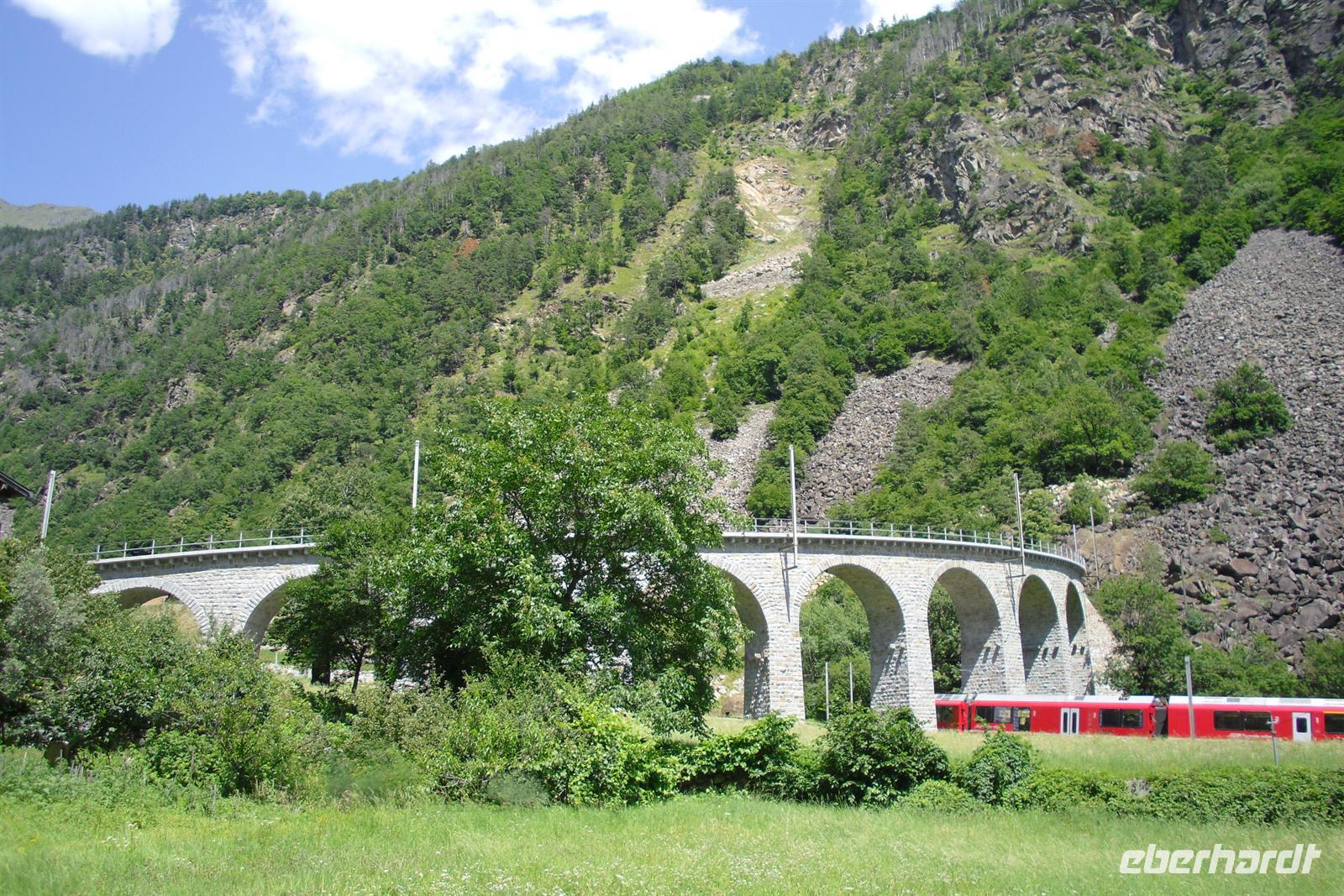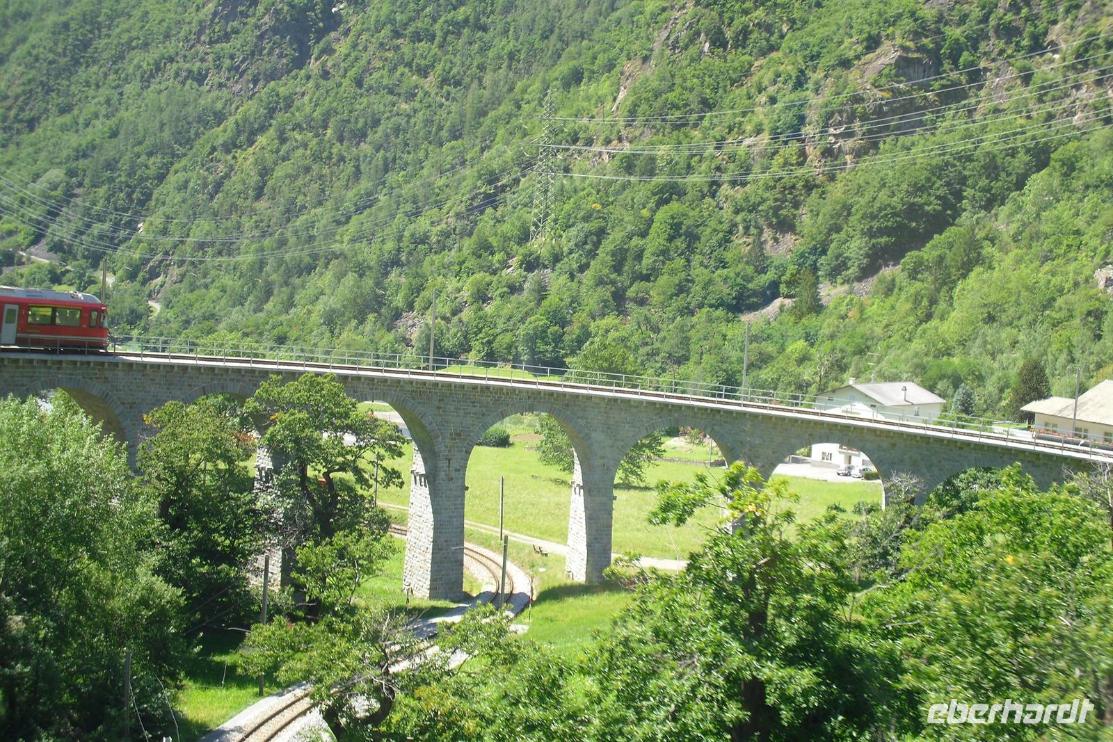 Schweizerbahn, die offen über die Alpen führt. Sie wurde 1910 fertig gestellt und brachte uns von den Gletschern des Berninapasses auf 2.253 m ü. d. M. hinunter auf 429 m ü. d. M. nach Tirano. Während der Höhenunterschied zwischen Ospizio Bernina und Tirano 1.824 Meter beträgt, misst die Horizontaldistanz nur 22 Kilometer. Diese Höhendifferenz wird ohne Zahnrad-Strecken überwunden - trotz Steigungen von bis zu 70o/oo. Das ist das absolute Maximum, das eine Adhäsionsbahn noch nutzbringend bewältigen kann. Besonders raffiniert ist übrigens auch die Wahl der Linienführung. Sie ermöglicht nicht nur die Überwindung der immensen Höhenunterschiede, sie eröffnet dem Reisenden auch atemberaubende Ausblicke auf eine imposante Bergwelt, auf Gletscher und Täler. Gegen Mittag kamen wir nach einer etwa 2-stündigen Fahrt im Bernina-Express im italienischen Tirano an und die meisten von uns gingen zum Mittagessen ins Restaurant "Al Portici". Einige von uns probierten hier - auf meine Empfehlung hin - eine Spezialität dieser Gegend, nämlich "Pizzoccheri". Das ist eine Mischung aus Buchweizennudeln, Spinat, Karotten, Knoblauch, Zwiebeln und das alles mit Butter und Käse überbacken. Dazu gab es für einige ein Glas Hauswein, natürlich aus dieser Gegend - dem milden Veltlin. Wir hatten wahrhaftig Temperaturen an die 30 Grad. Einige von uns nutzten auch noch die Gelegenheit und spazierten zur Wallfahrtkirche "Madonna di Tirano" - diese Kirche mit ihren herrlichen Fresken hatte heute sogar ihre Türen geöffnet, denn meistens ist sie über die Mittagszeit geschlossen - wie fast alle Geschäfte hier!