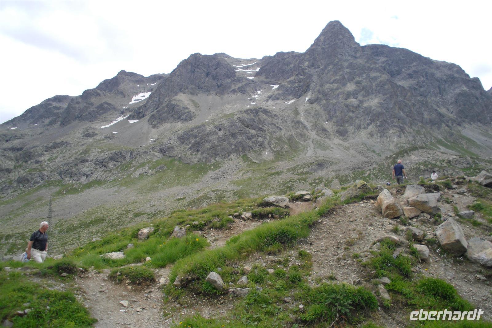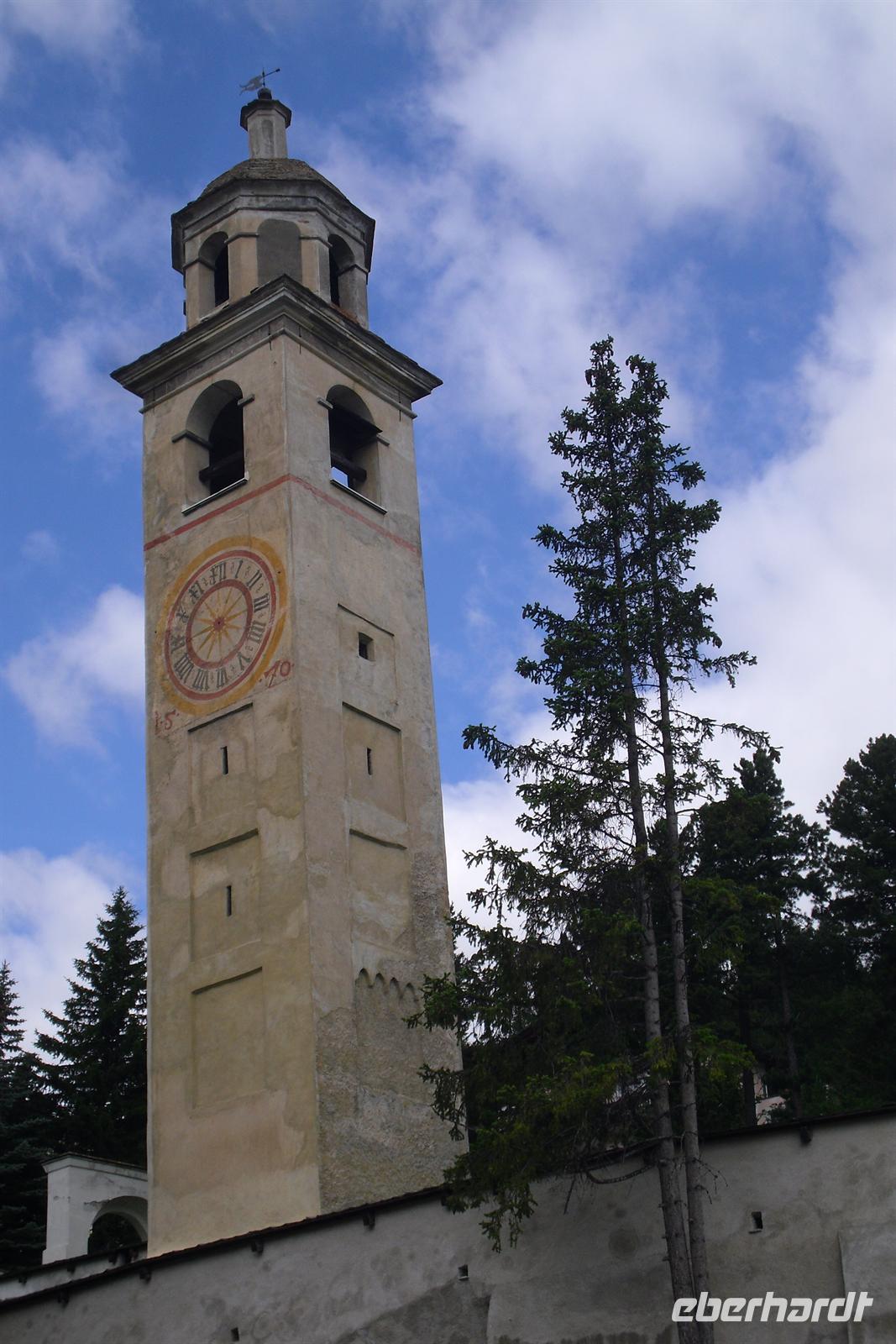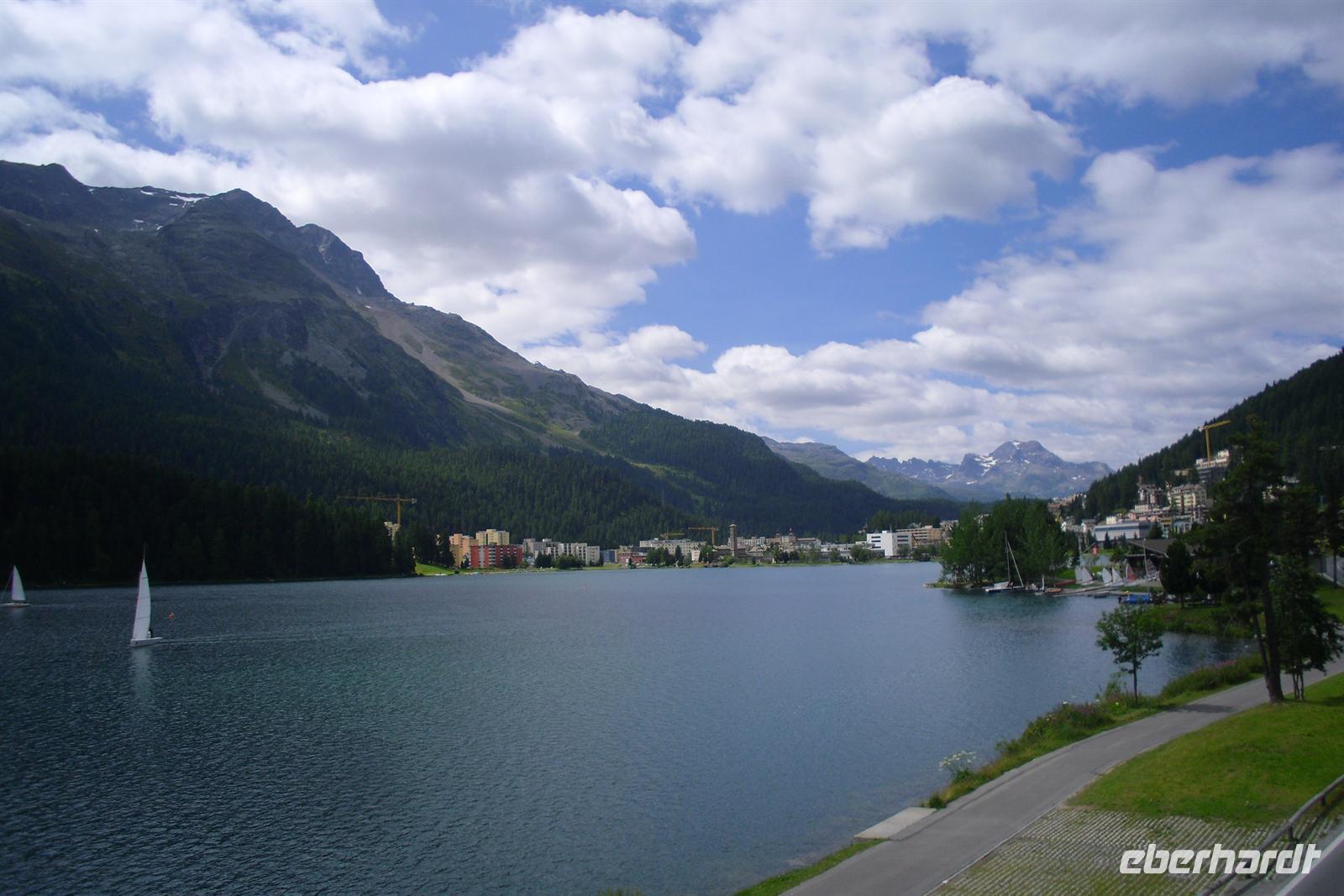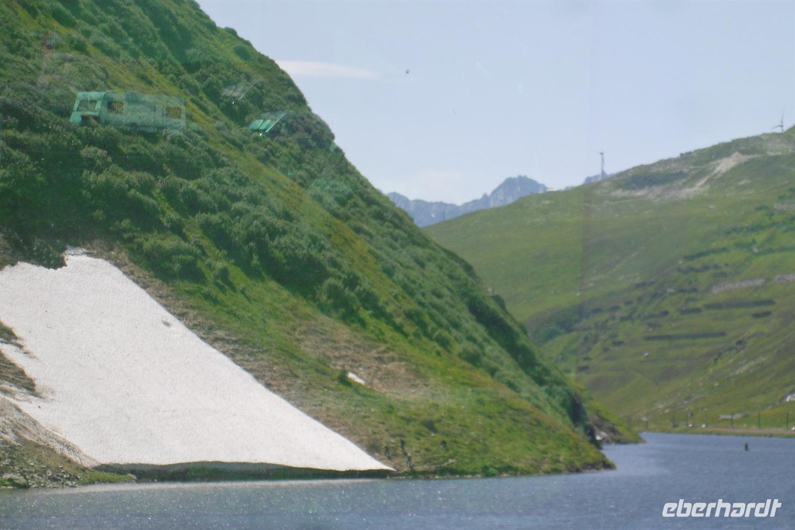 Zuerst führte uns die Fahrt durch die Ortschaften Susch, Zernez, vorbei an Zuoz und Samedan nach St. Moritz. St. Moritz ist in erster Linie als Wintersportort bekannt, im Sommer ist hier so gut wie gar nichts los. Zahlreiche Baustellen prägten das Ortsbild, aber das ist im Sommer normal. Die meisten Touristen besuchen St. Moritz nämlich im Winter. Das hatte natürlich auch einen Vorteil, denn so konnten wir ganz in Ruhe flanieren. Zum Glück für die Männer, hatten auch noch einige der teuren Geschäfte geschlossen und so mußte niemand seine Kreditkarte zücken. Ich führte unsere Gäste bis zum sogenannten "Schiefen Turm", dem Rest einer alten Kirche aus dem Mittelalter. Dieser Turm ist eines der Wahrzeichen von St. Moritz. Für die meisten von uns ging es einfach darum, St. Moritz zumindest mal gesehen zu haben, um mitreden zu können. Fast alle waren der Meinung, daß hier sehr viel von der Ursprünglichkeit verloren gegangen ist. Vorbei an den Oberengadiner Seen ging es nunmehr zum Julierpass hinauf. Dieser Pass bildet den Übergang vom Engadin nach Tiefencastel bzw. ins Rheintal. Durch das Oberhalbstein-Gebiet kamen wir dann bis kurz vor Filisur. Dort machten wir unsere Kaffeepause nur wenige Gehminuten vom imposanten Landwasserviadukt entfernt. Viele kamen mit einem wunderschönen Foto vom Landwasserviadukt - natürlich mit Bahn - zurück. Durch das Landwassertal gelangten wir zurück nach Davos und dort war dann die Schatzalpbahn unser Ziel. Einige nutzten nämlich das Sommerangebot von Davos und Klosters, nach dem man mit der Gästekarte kostenfrei sämtliche Bergbahnen in der Region nutzen kann.