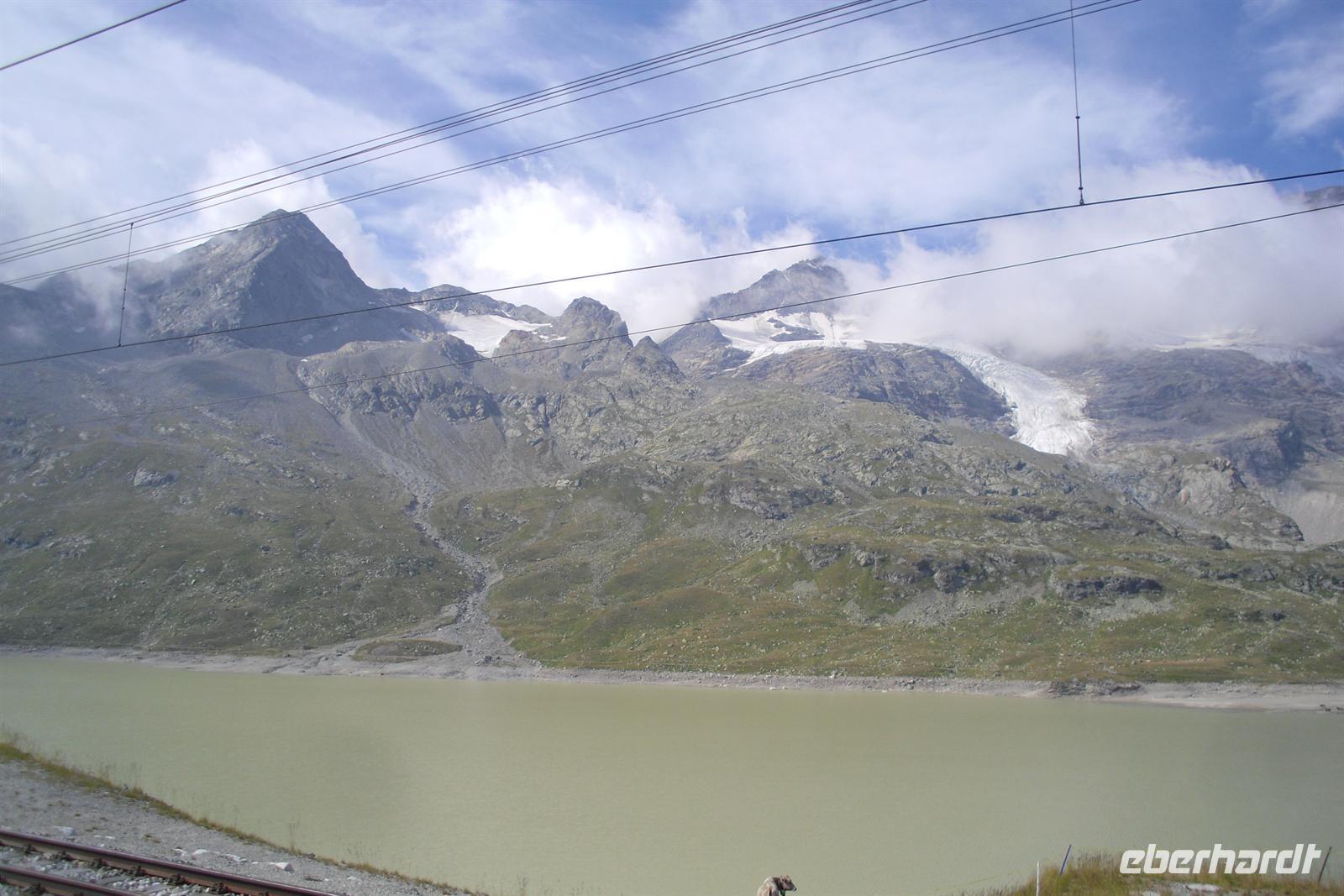 Heute stand bereits der erste Höhepunkt dieser Reise, die Fahrt mit dem Bernina-Express, auf dem Programm. Wir mussten dafür zwar zeitig aufstehen, aber das störte niemanden. Mit unserem Bus ging es über den 2.383 m hoch gelegenen Flüela-Pass nach Pontresina. Dort stiegen wir bei herrlichem Sonnenschein in den Bernina-Express ein. Die Bernina-Linie ist übrigens die einzige