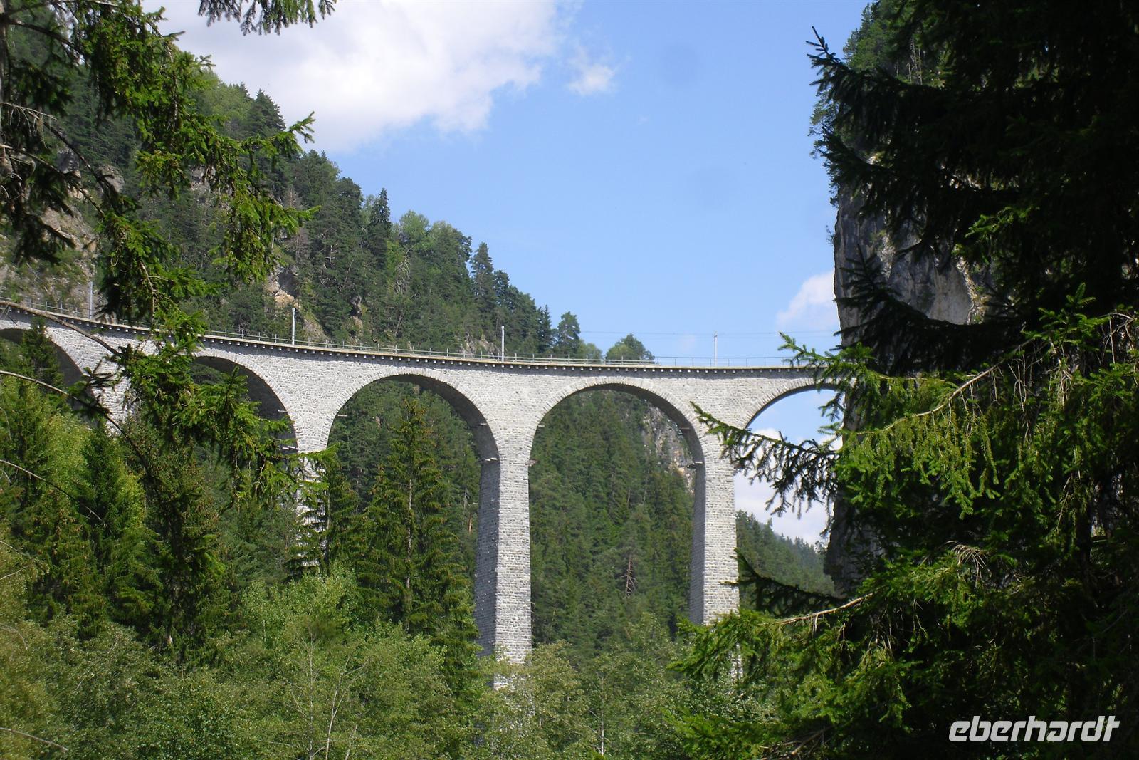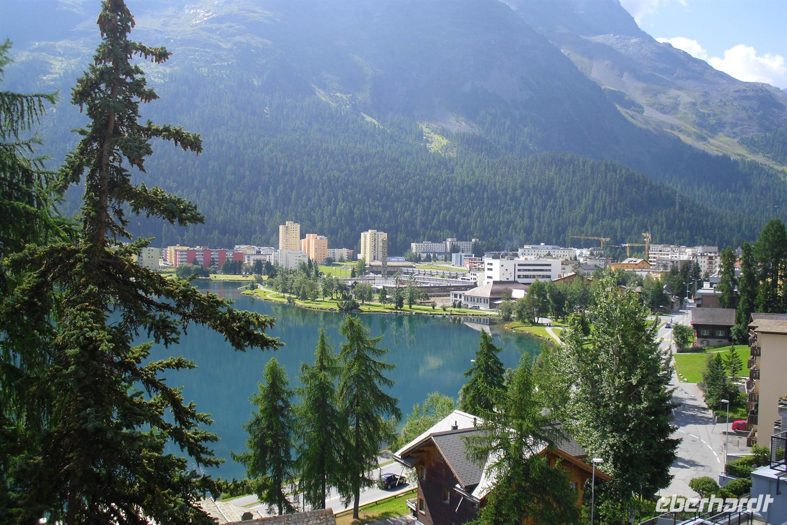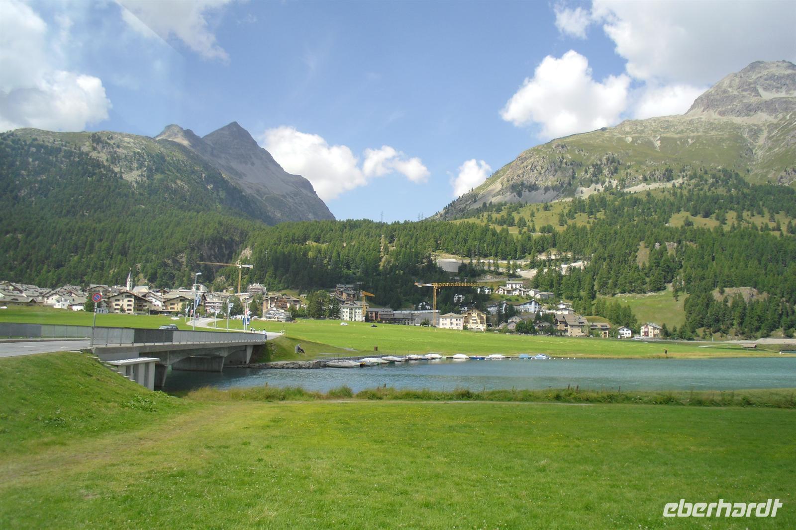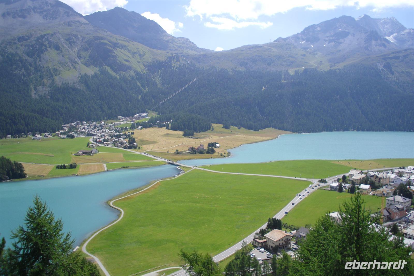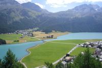 Im Engadin spricht man Rätoromanisch und dort sagt man En, wenn man vom Inn spricht. Zuerst führte uns die Fahrt durch die Ortschaften Susch, Zernez, vorbei an Zuoz und Samedan nach St. Moritz. St. Moritz ist in erster Linie als Wintersportort bekannt, im Sommer ist hier so gut wie gar nichts los. Zahlreiche Baustellen prägten das Ortsbild, aber das ist im Sommer normal. Die meisten Touristen besuchen St. Moritz nämlich im Winter. Das hatte natürlich auch einen Vorteil, denn so konnten wir ganz in Ruhe flanieren. Zum Glück für die Männer, hatten auch noch einige der teuren Geschäfte geschlossen und so mußte niemand seine Kreditkarte zücken. Ich führte unsere Gäste bis zum sogenannten "Schiefen Turm", dem Rest einer alten Kirche aus dem Mittelalter. Dieser Turm ist eines der Wahrzeichen von St. Moritz. Für die meisten von uns ging es einfach darum, St. Moritz zumindest mal gesehen zu haben, um mitreden zu können. Fast alle waren der Meinung, daß hier sehr viel von der Ursprünglichkeit verloren gegangen ist. Vorbei an den Oberengadiner Seen ging es nunmehr zum Julierpass hinauf. Dieser Pass bildet den Übergang vom Engadin nach Tiefencastel bzw. ins Rheintal. Durch das Oberhalbstein-Gebiet kamen wir dann bis kurz vor Filisur. Dort machten wir unsere Kaffeepause nur wenige Gehminuten vom imposanten Landwasserviadukt entfernt. Viele kamen mit einem wunderschönen Foto vom Landwasserviadukt - natürlich mit Bahn - zurück. Durch das Landwassertal gelangten wir zurück nach Davos und dort war dann die Schatzalpbahn unser Ziel. Einige nutzten nämlich das Sommerangebot von Davos und Klosters, nach dem man mit der Gästekarte kostenfrei sämtliche Bergbahnen in der Region nutzen kann.