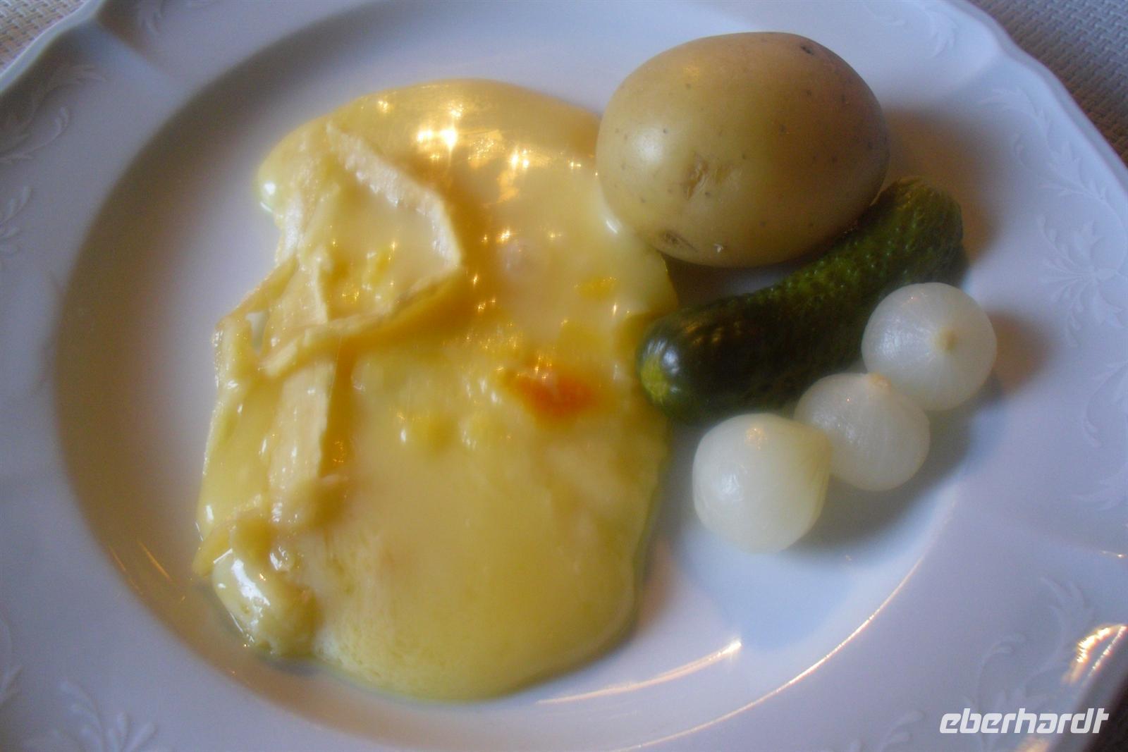 Diese Häuser stehen häufig auf sogenannten "Mäuseplatten" und dienten früher dazu, dass keine Mäuse an die Vorräte rankamen. So erlebte jeder diesen Tag nach seinen eigenen Vorstellungen. Am frühen Abend trafen wir uns alle wieder und nun ging es mit einer unterirdischen Standseilbahn zur Sunnegga hinauf. Wir befanden uns jetzt auf 2.288 Metern Höhe - Gornergrat und Matterhorn waren zum Greifen nah! Wir saßen auf der Terrasse und genossen einfach diese herrlichen Blicke, bevor wir ein typisch schweizerisches Essen erleben durften. Es gab Raclette - eine Käsespezialität mit Pellkartoffeln, grünen Gurken und Glaszwiebeln. Jeder konnte soviel essen, wie er wollte und wir konnten auch bei der Zubereitung zuschauen. Um Raclette zuzubereiten, wird übrigens ein großer halbierter Käse an der Schnittfläche erhitzt und die geschmolzene Oberfläche jeweils abgeschabt. Für die meisten von uns war es das erste Raclette-Essen des Lebens. Die Schweizer lieben Käse und das merkt man natürlich auch, wenn es um hiesige kulinarische Spezialitäten geht. Nachdem wir alle satt und zufrieden waren, ging es nach Zermatt zurück.