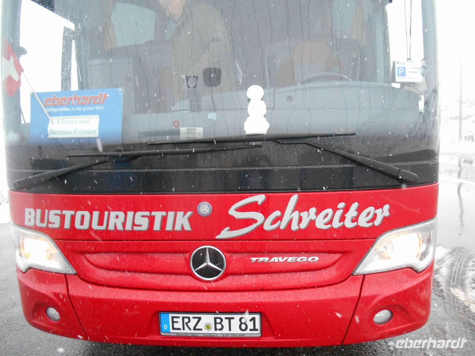 Pünktlich um 6 Uhr morgens ging es am Dresdner Flughafen los. Die letzten Gäste stiegen heute erst am Rasthaus "Seligweiler" in der Nähe von Ulm zu und damit war unsere Reisegruppe mit 33 Personen komplett. Wie bei unseren Reisen üblich, legten wir im Abstand von jeweils etwa zwei Stunden eine Pause ein. So konnte jeder einmal etwas frische Luft schnappen beziehungsweise sich die Beine vertreten. Die Fahrt führte uns über Nürnberg und Ulm in Richtung Bodensee. Wir fuhren wenige Kilometer durch Österreich und am Nachmittag erreichten wir dann die österreichisch-schweizerische Grenze Lustenau-Au. Am frühen Abend kamen wir schließlich in Davos, unserem Übernachtungsort für die nächsten drei Nächte, an. Im modernen und gemütlichen 4-Sterne-Hotel "Hilton Garden Inn" wurden wir herzlich begrüßt. Jeder von uns war froh, nun angekommen zu sein. Manch einer nutzte die Zeit bis zum Abendessen noch für einen ersten kleinen Spaziergang.