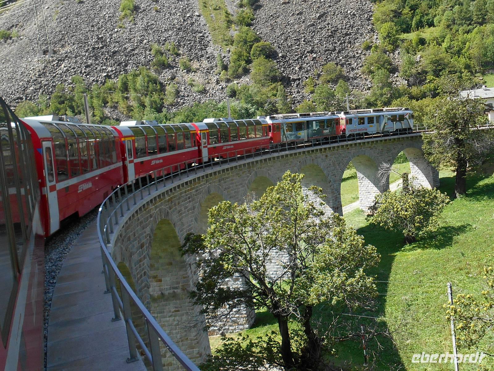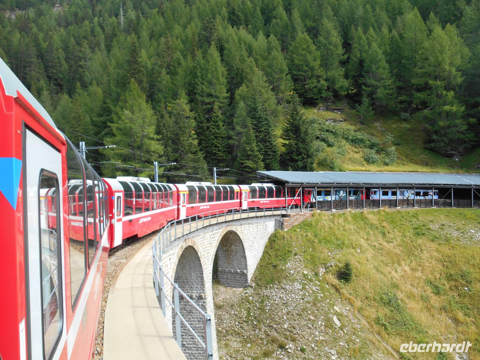 Erleben Sie eine der spektakulärsten Alpenüberquerungen - die Berninastrecke der Rhätischen Bahn. Sie verbindet den Norden und den Süden Europas in Schlangenlinien und ohne Zahnrad...!