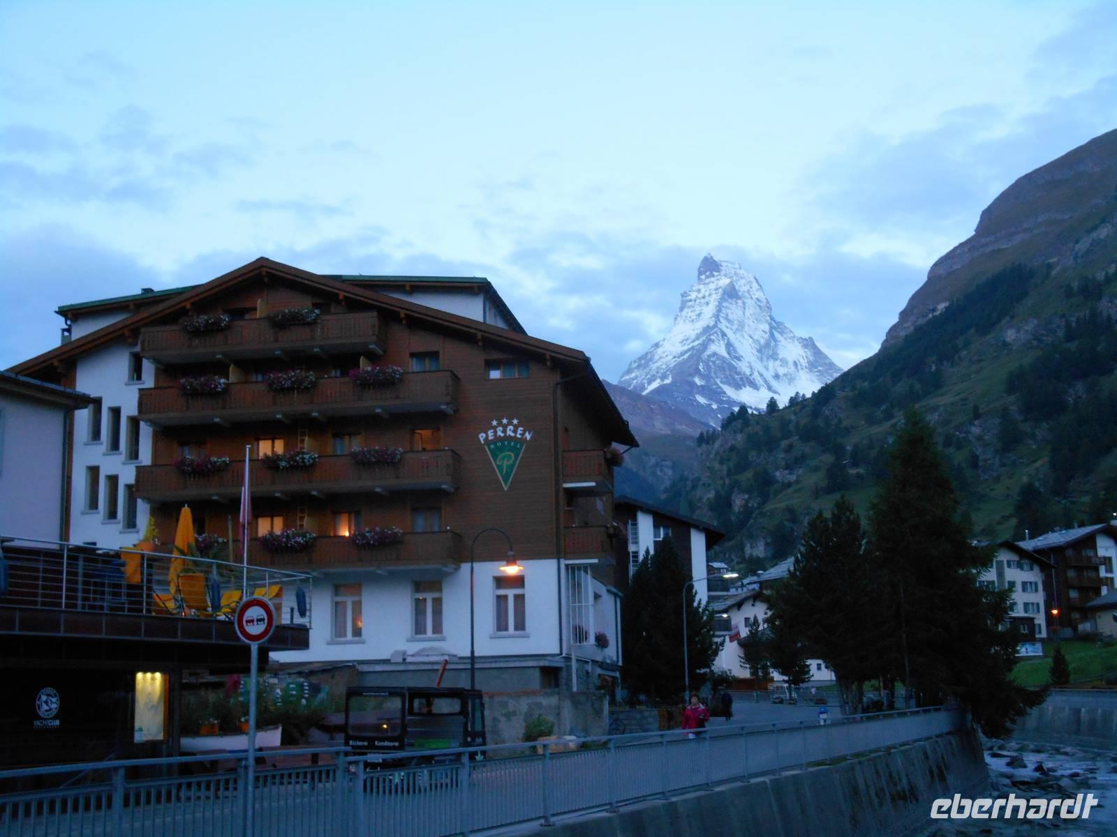 Der nächste Höhepunkt unserer Reise stand am 4. Tag an - die Fahrt mit dem "Glacier-Express"! Am Morgen fuhren wir zunächst zum Bahnhof in Davos-Platz, wo wir uns von unserem Buschauffeur Roy verabschiedeten, der allein mit dem Bus und unserem Gepäck die weite Strecke bis ins Wallis zurücklegte. Wir fuhren vorerst mit dem Regionalzug bis Filisur und dort machten wir es uns dann in unseren Panoramawagen der 2. Klasse im Glacier-Express gemütlich - die Fahrt führte über Thusis, Chur, Reichenau, die Vorderrheinschlucht, Disentis, über den 2.033 Meter hohen Oberalppass, Andermatt, das Goms, Brig und Visp nach Zermatt. Die Bahnfahrt mit dem langsamsten Schnellzug der Welt dauerte für uns etwa sieben Stunden, aber keine Angst - niemandem von uns wurde langweilig. Das Landschaftsbild verändert sich ständig und es gibt verdammt viel zu sehen...! Zudem wurden wir zum Mittagessen mit einem kleinen Bauernteller verwöhnt, einer kalten Platte mit Salami, Käse und Brot. Mit durchschnittlich 35 km/h legt der Glacier-Express die Strecke von St. Moritz nach Zermatt zurück. Am frühen Abend erreichten wir schließlich unser Ziel Zermatt und ein erster Blick auf das Matterhorn und die anderen umliegenden Berge erwartete uns. Gemütlich spazierten wir nunmehr zum Hotel "Perren", unserem Hotel für die nächsten zwei Nächte. Einige wenige von uns hatten Glück und sogar ein Zimmer mit "Matterhornblick"!