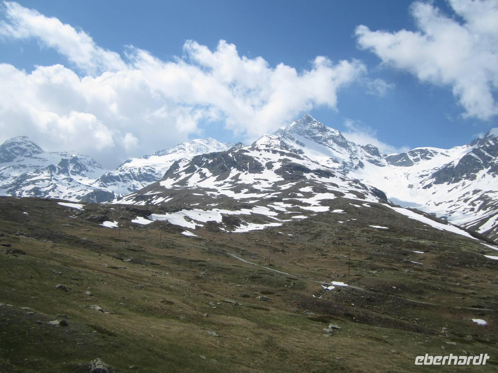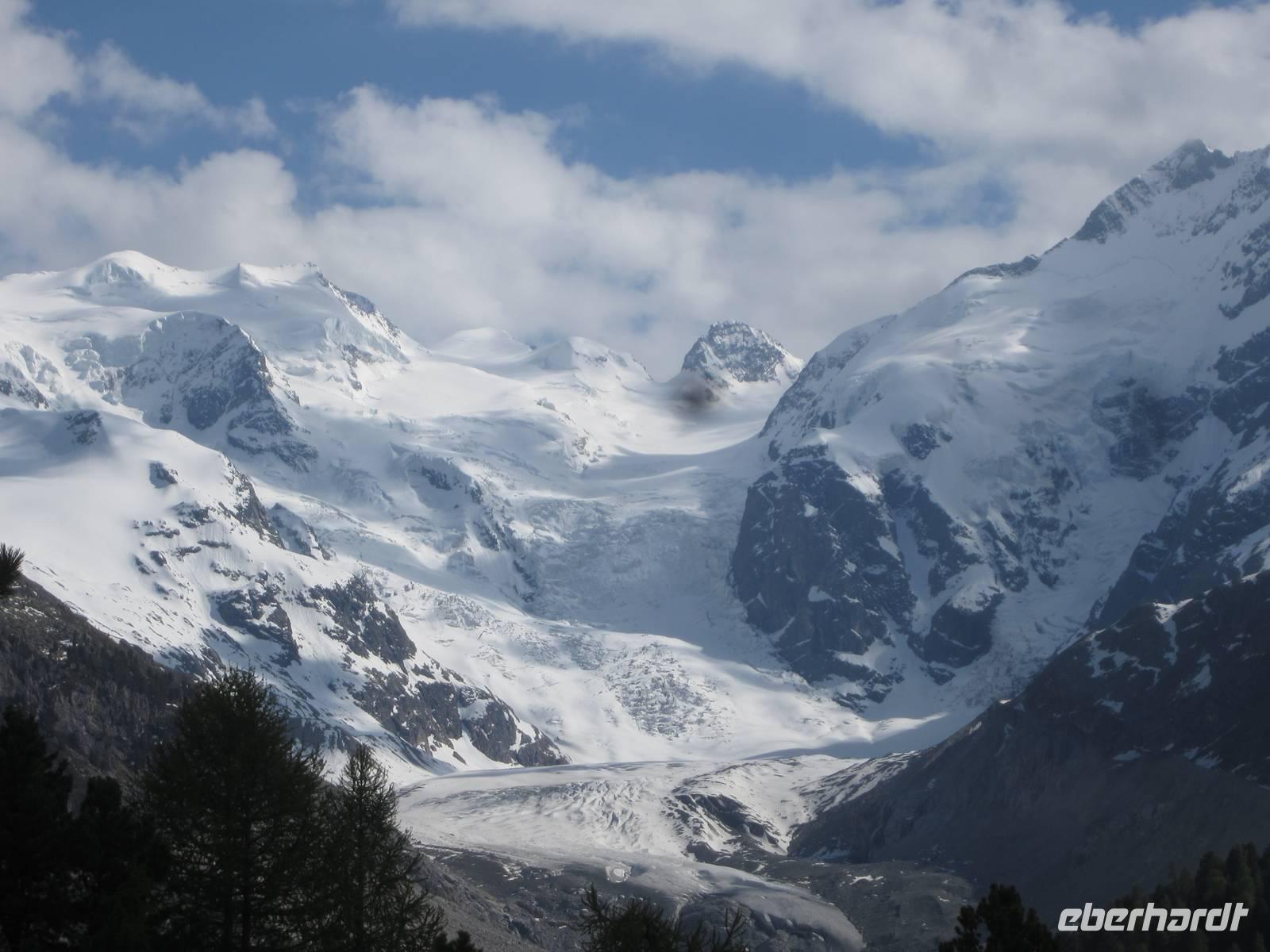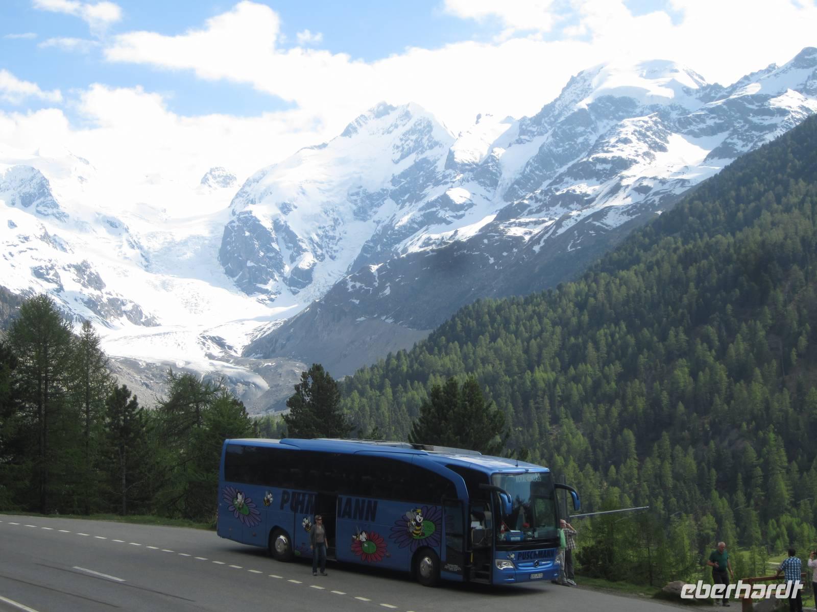 Nach dem Frühstück beginnt unsere Fahrt nach Pontresina. Wieder über den Flüela Pass (2383 m). Unser Fahrer Ingo bewältigt die Kehren sicher und perfekt. Somit können wir uns voll und ganz auf die Bergwelt konzentrieren. Die Berge, die Blumenvielfalt der Bergwiesen und die Fahrt am Inn entlang ist schon ein Erlebnis. Wir wollen aber nach Pontresina, um mit dem Bernina-Express, der höchsten Bahnverbindung, die offen - ohne Scheiteltunnel - über die Alpen führt, nach Tirano. Begeisterung bei allen Gästen, vor allem natürlich bei den Fotografen. Die Berge und Gletscher, die Schönheit der Natur können wir bei schönstem Wetter erleben.