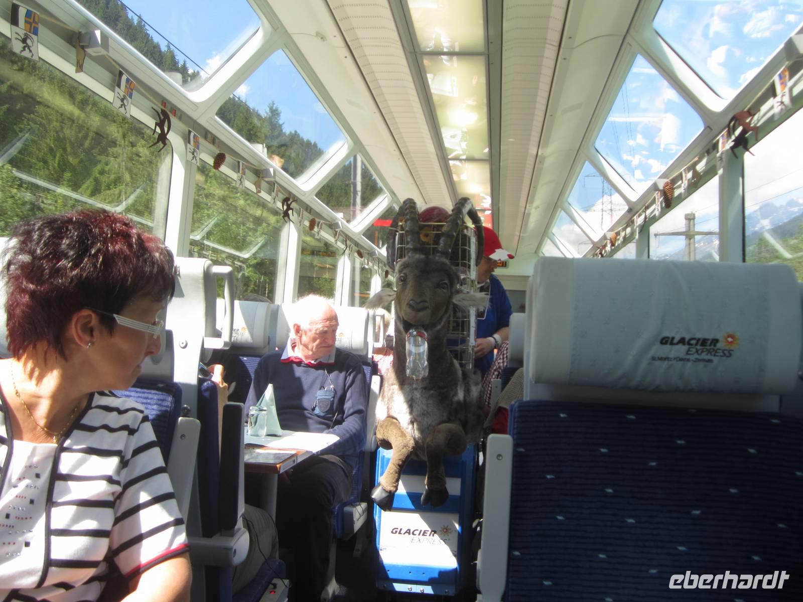 9.01 beginnt nun die Fahrt mit dem langsamsten Schnellzug der Welt" . Eine Reservierung für Eberhardt Gäste zeigt uns unsere Waggons. Nach einigem Hin und Her haben wir unsere Plätze. Die Fotografen wollen natürlich ans Fenster. Aber die Panoramawagen des Glacier Express es bieten allen Gästen eine allerbeste Aussicht auf die Umgebung. Unsere Panoramafahrt kann beginnen.
