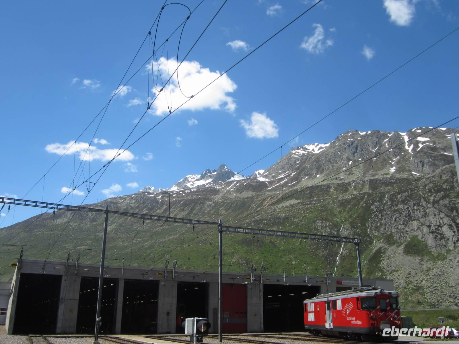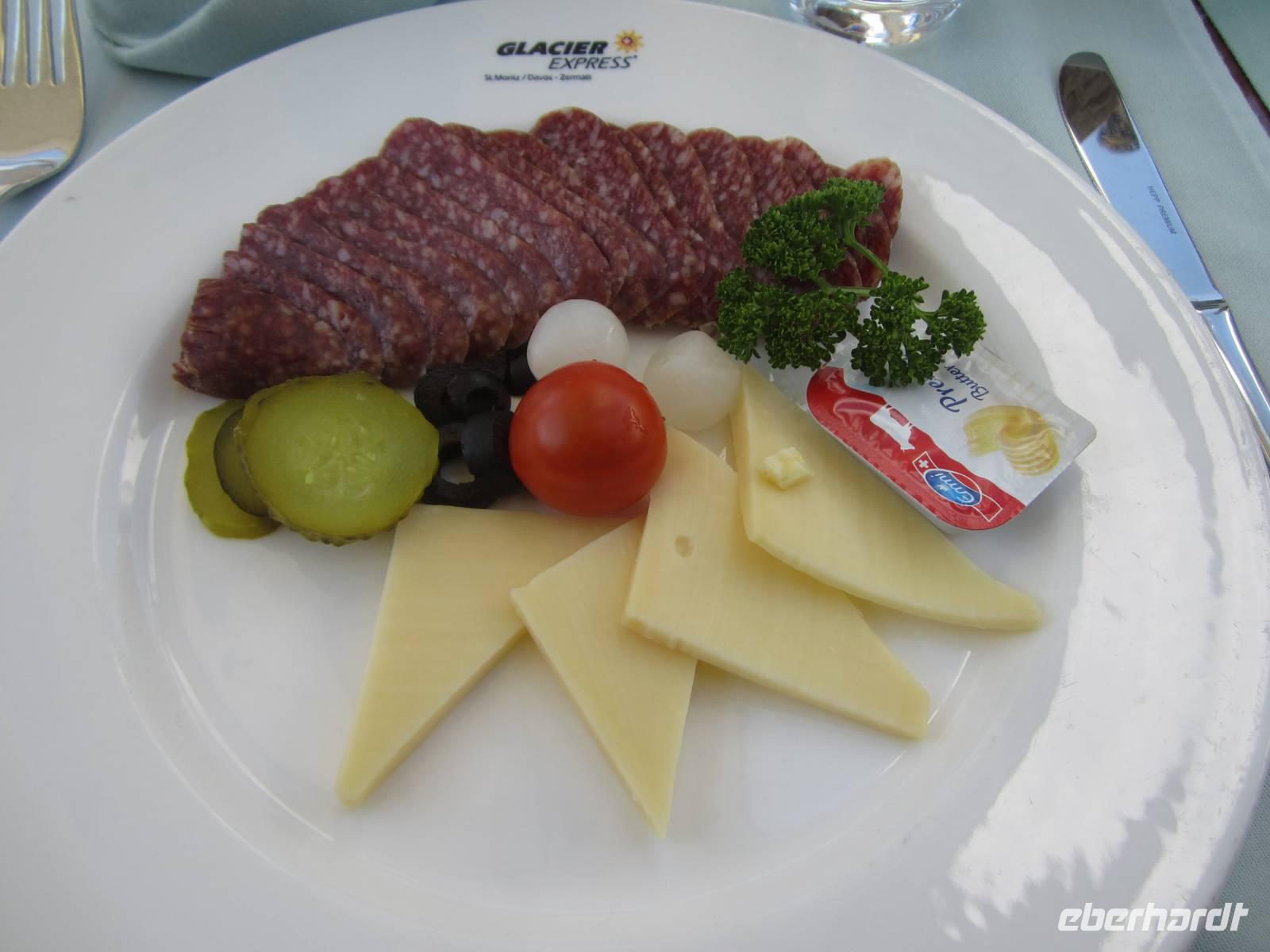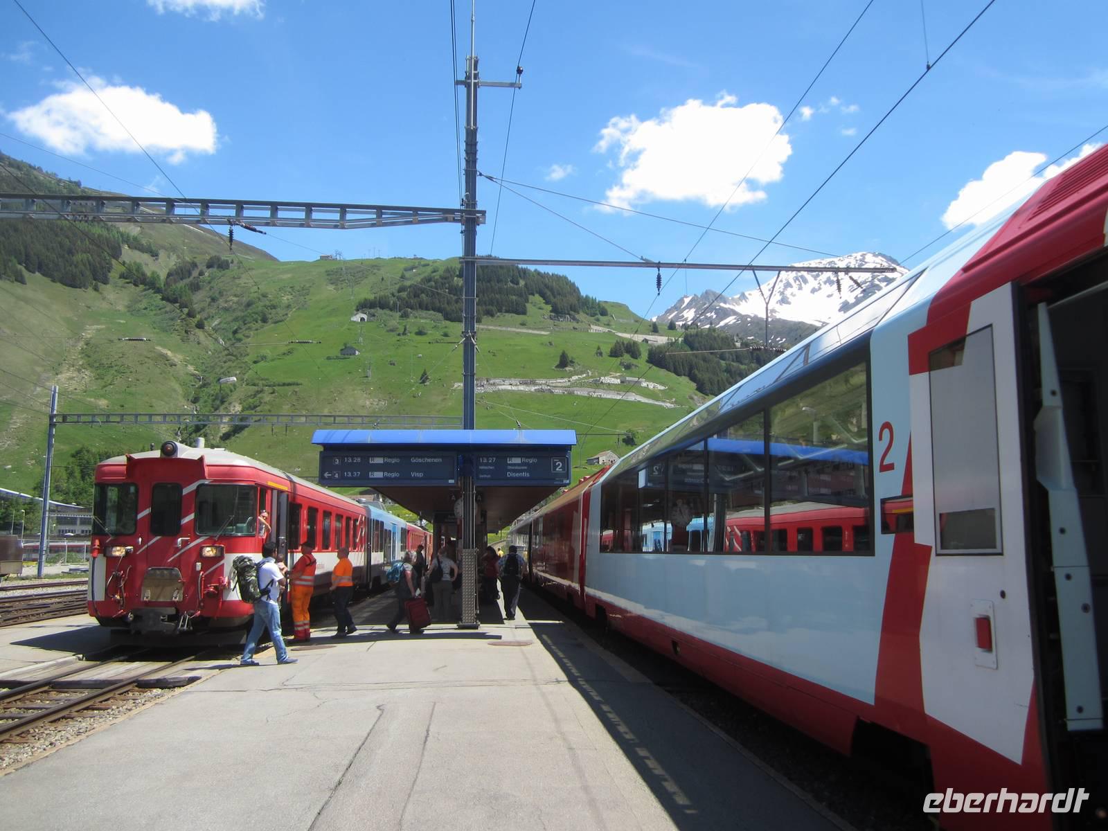 Weitere schöne Eindrücke erhalten wir auf der Fahrt nach Zermatt. Dazu gehört Disentis mit der ältesten Benediktinerabtei der Schweiz. Aber auch der Bahnhof ist ein wichtiger Punkt der Reise. Danach stärken wir uns erst einmal. Ein Älpler-Teller (Salsiz und Bündner Bergkäse mit Brot und Butter) wird am Platz serviert. Eine sehr gute und leckere Abwechslung. Die folgenden Strecken werden teilweise so steil, dass der Zug auf die Hilfe einer Zahnstange angewiesen ist. Nun erklimmen wir den höchsten Punkt der Reise, den 2033 m hohen Oberalppass. Nach steiler Abfahrt sehen wir Andermatt. Auf unserer weiteren Strecke durchfahren wir den Furka - Basis - Tunnel. 15 km lang und 15 min Fahrzeit. Der Bau des Tunnels (1982) macht es möglich, dass die Bahn das ganze Jahr betrieben werden kann.