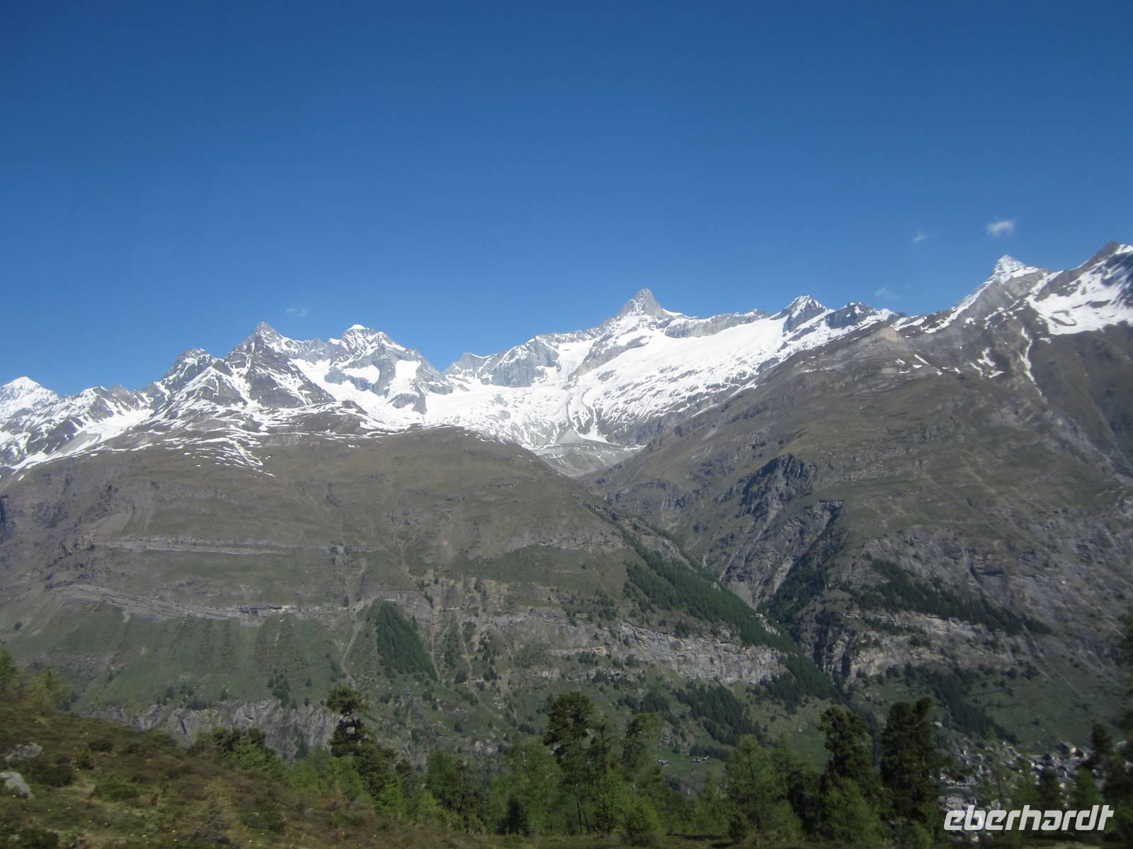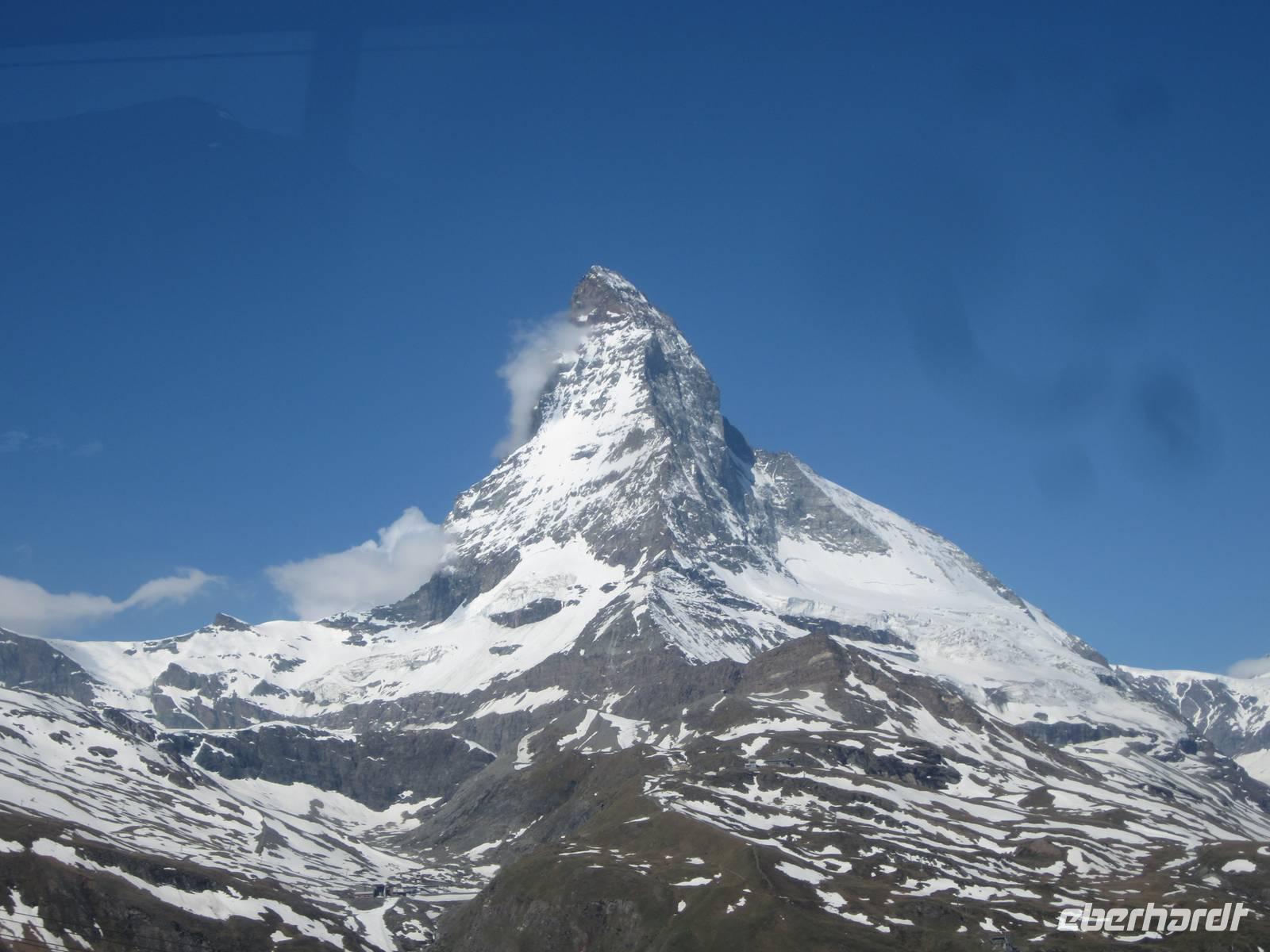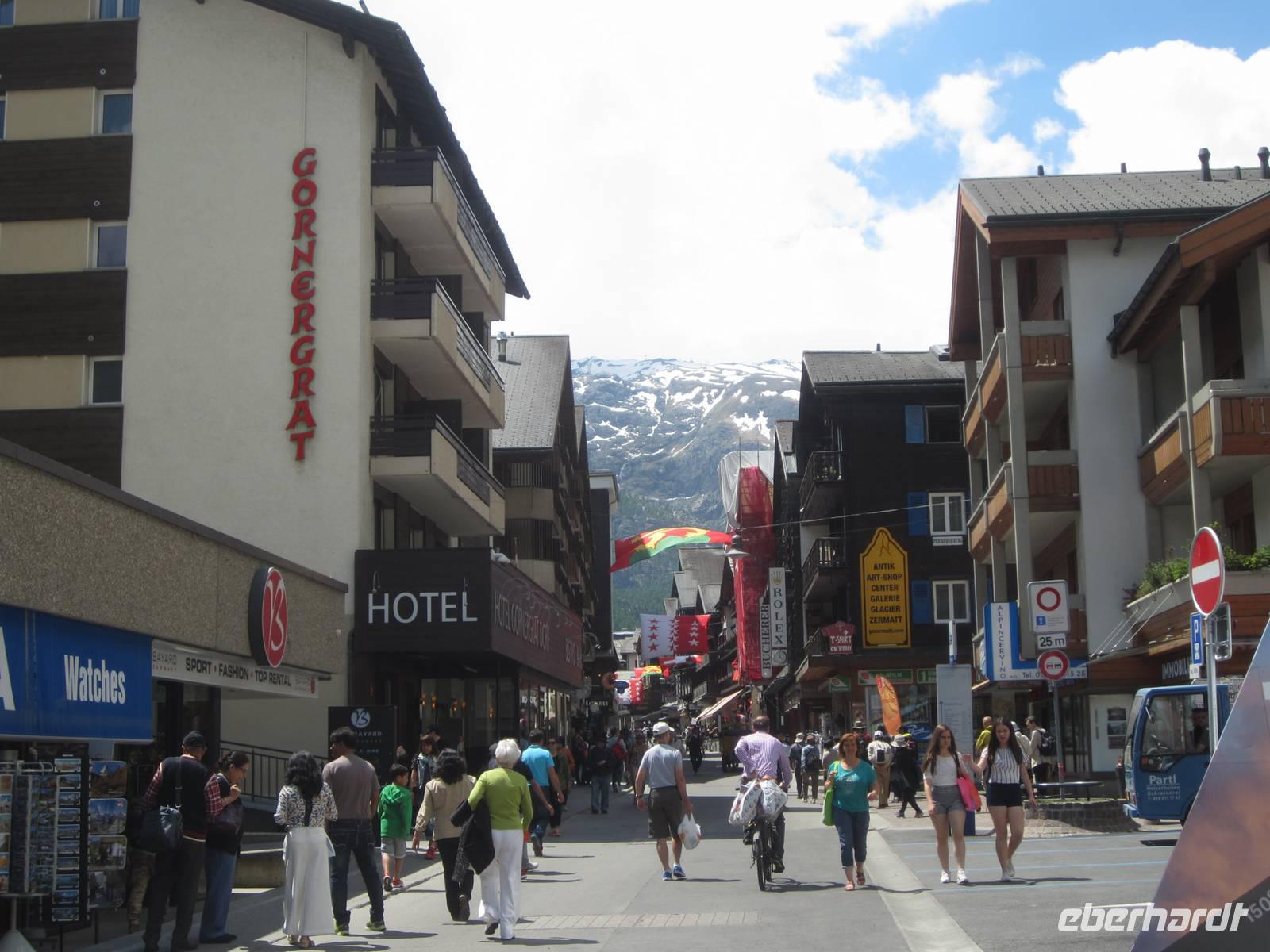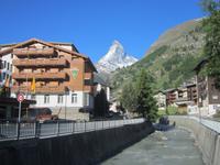 Weiter führt uns unsere Fahrt durch das reizvolle Rhonetal hinunter nach Brig. Von Brig aus beginnt nun unser Endspurt hinauf in das Mattertal. Tiefe Schluchten säumen den Weg und die uralten Steinbrücken zeugen vom regen Handel in vergangenen Zeiten. Vorbei am gewaltigen Bergsturz von 1991 fahren wir nach Zermatt, wo unsere Fahrt mit dem Glacier -Express gegen 16.00 Uhr endet.Wir laufen nach der langen Fahrt noch durch Zermatt entlang der Bahnhofstraße an der Kirche vorbei zum Hotel "Perren". Unsere Koffern sind schon im Hotel. Schnell sind die Zimmer bezogen und bis zum Abendessen bleibt noch Zeit Zermatt zu erkunden.