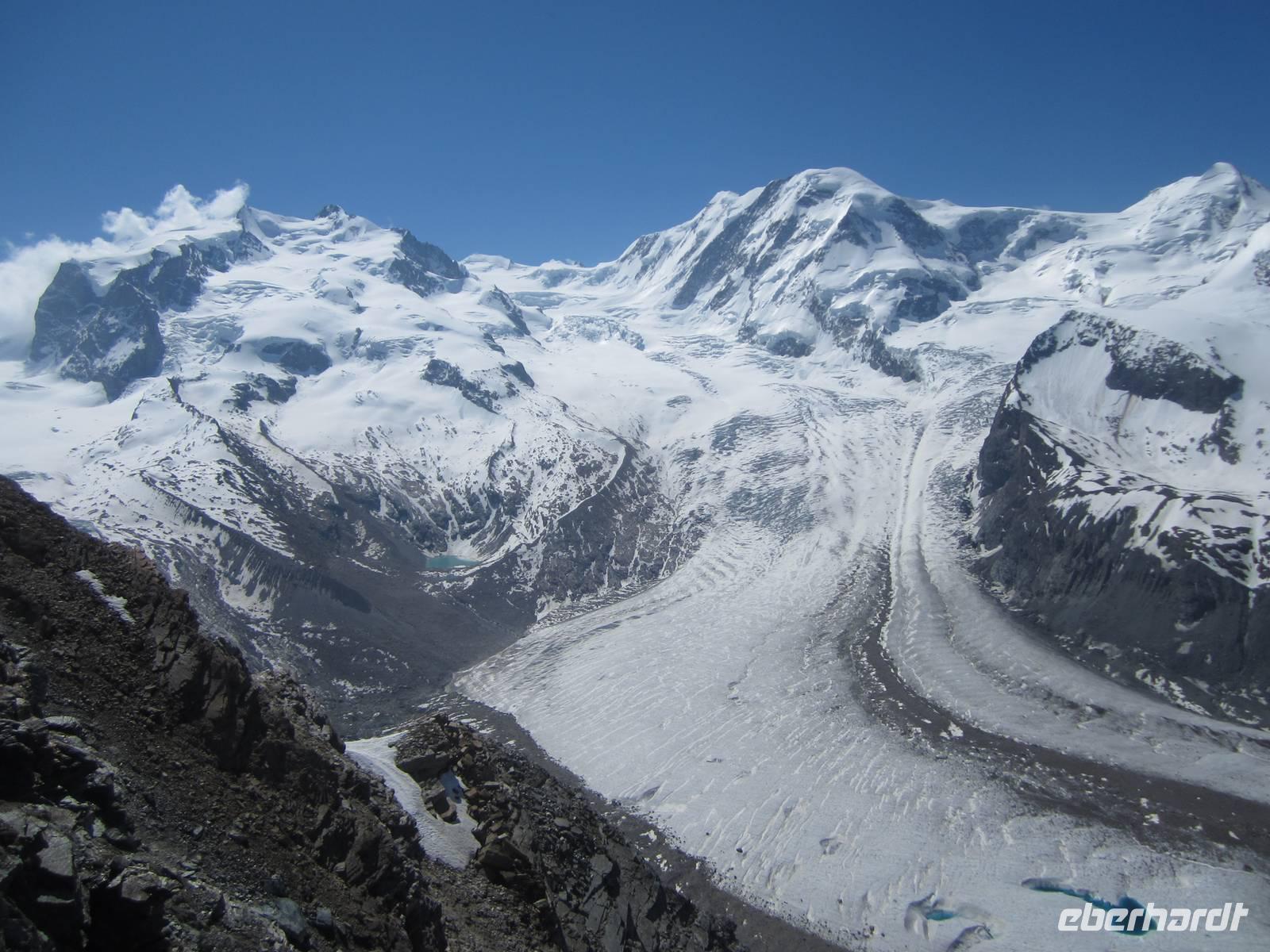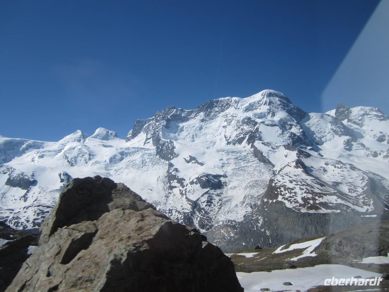 Nach dem Aufwecken, Blick zu den Bergen. Wir haben Glück, kalte Temperaturen in der Nacht und schon teilweise blauer Himmel am Morgen. Der größte Teil der Gruppe fährt zum Gornergrat. Wir nehmen den Zug 09.36 Uhr. Es sind noch wenige Gäste unterwegs, die Tagestouristen kommen später und wir können die Ruhe auf den Gornergrat genießen. Die Berge zeigen sich in voller Schönheit mit viel Schnee. Um wandern zu können, muss man die tieferen Regionen nutzen.