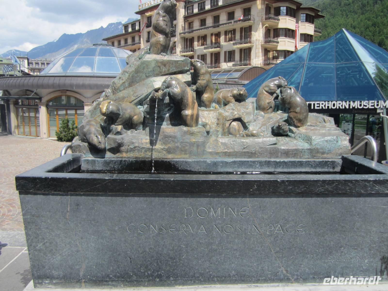 Am Nachmittag bleibt Zeit entlang der Bahnhofstraße zu bummeln. Auf dem Kirchplatz müssen noch die Murmeltiere auf dem Brunnen gestreichelt werden. Das ist ein Garant, dass man nach Zermatt zurückkehrt.