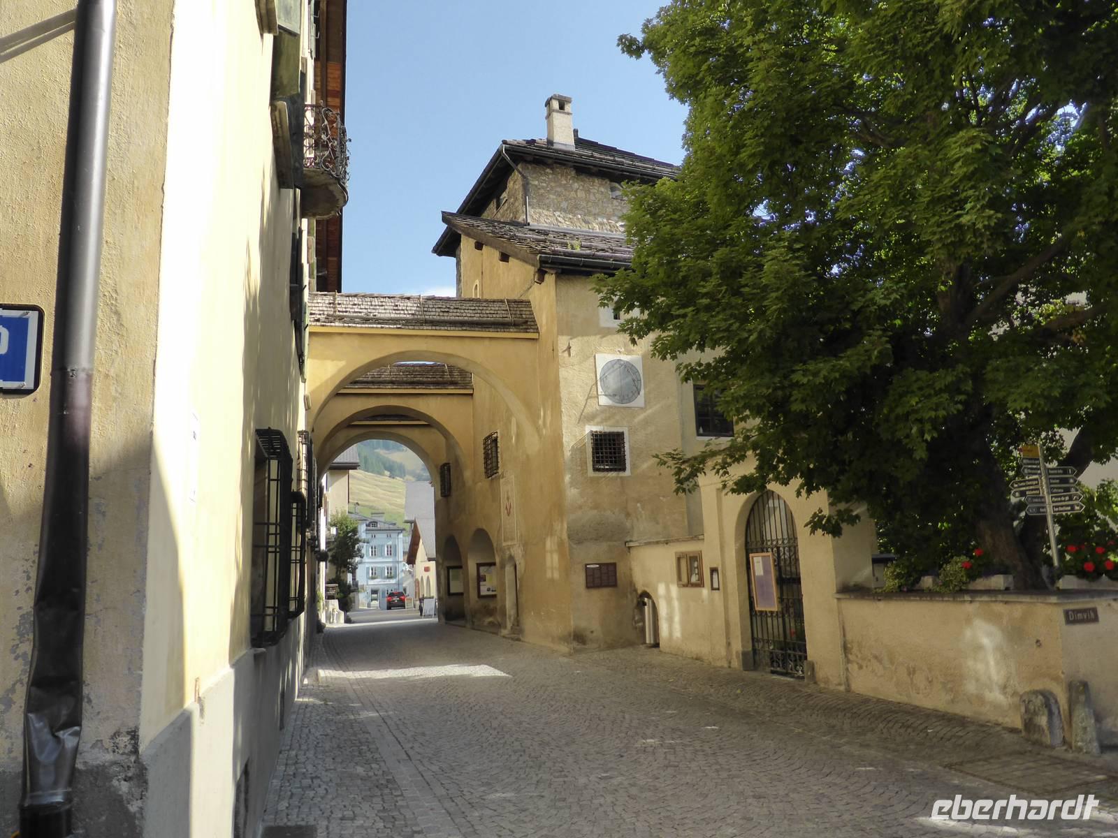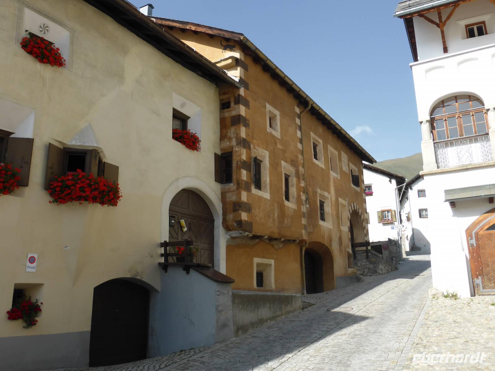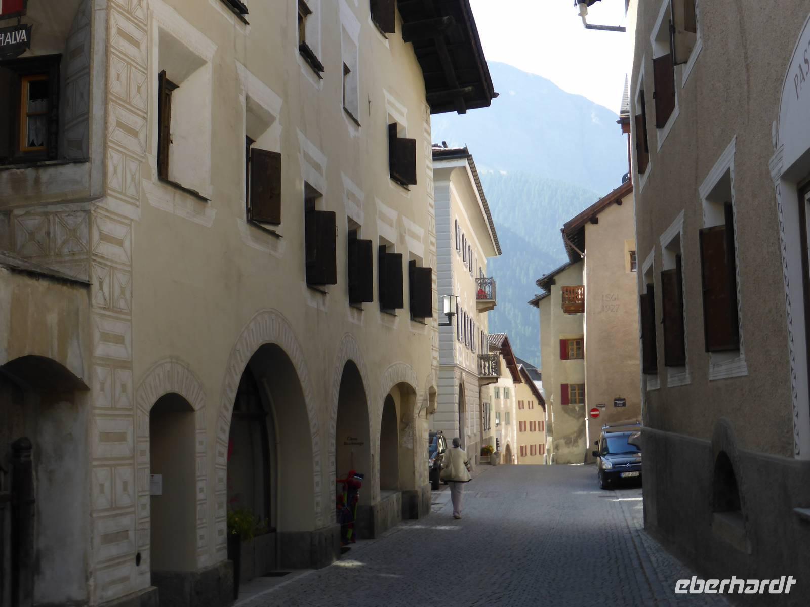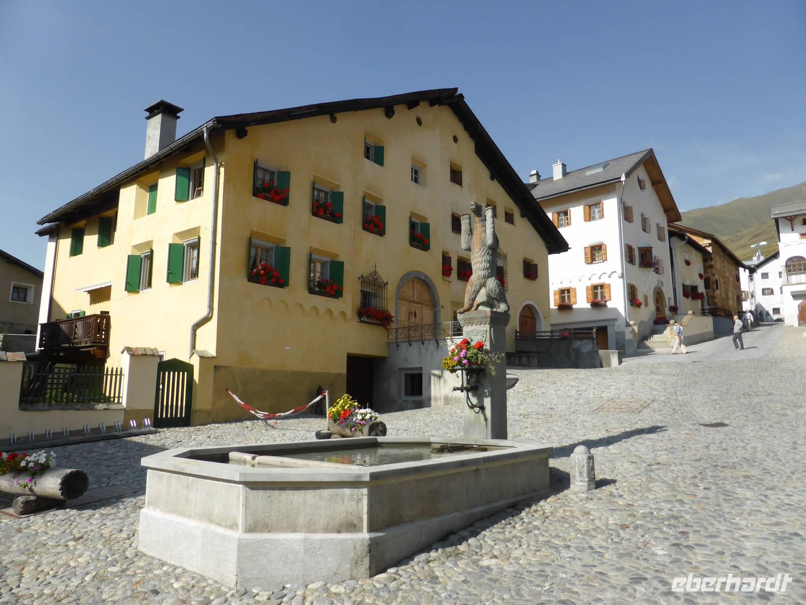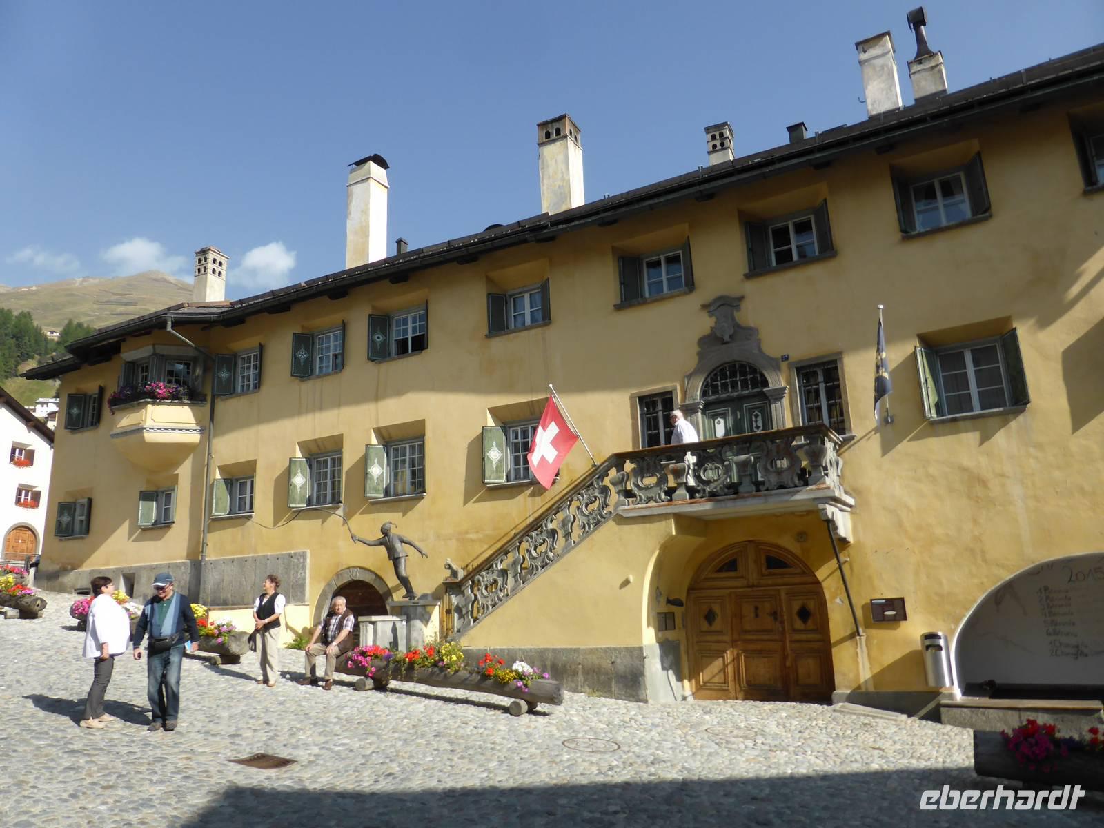 Der Ausflug ins Engadin konnte fakultativ gebucht werden. Alle Gäste nahmen daran teil. Über den Flüela-Pass fuhren wir wieder hinunter ins Engadin und entlang des Inn ins Oberengadin nach Zuoz. Der Ort ist bekannt für seine massiven Oberengadiner Häuser, für seine Sgraffito-Malereien an den Häuserfassaden und für den Chalandamarz, dem Ausläuten des Winters. Jungen und Mädchen ziehen Kuhglocken läutend am Chalandamarz durch den Ort und singen vor jedem Haus Lieder. Dafür erhalten sie Süßigkeiten oder ein wenig Kleingeld. Einem der Kinder, dem Schellen-Ursli, wurde am Marktplatz in Zuoz ein Bronzedenkmal gesetzt.