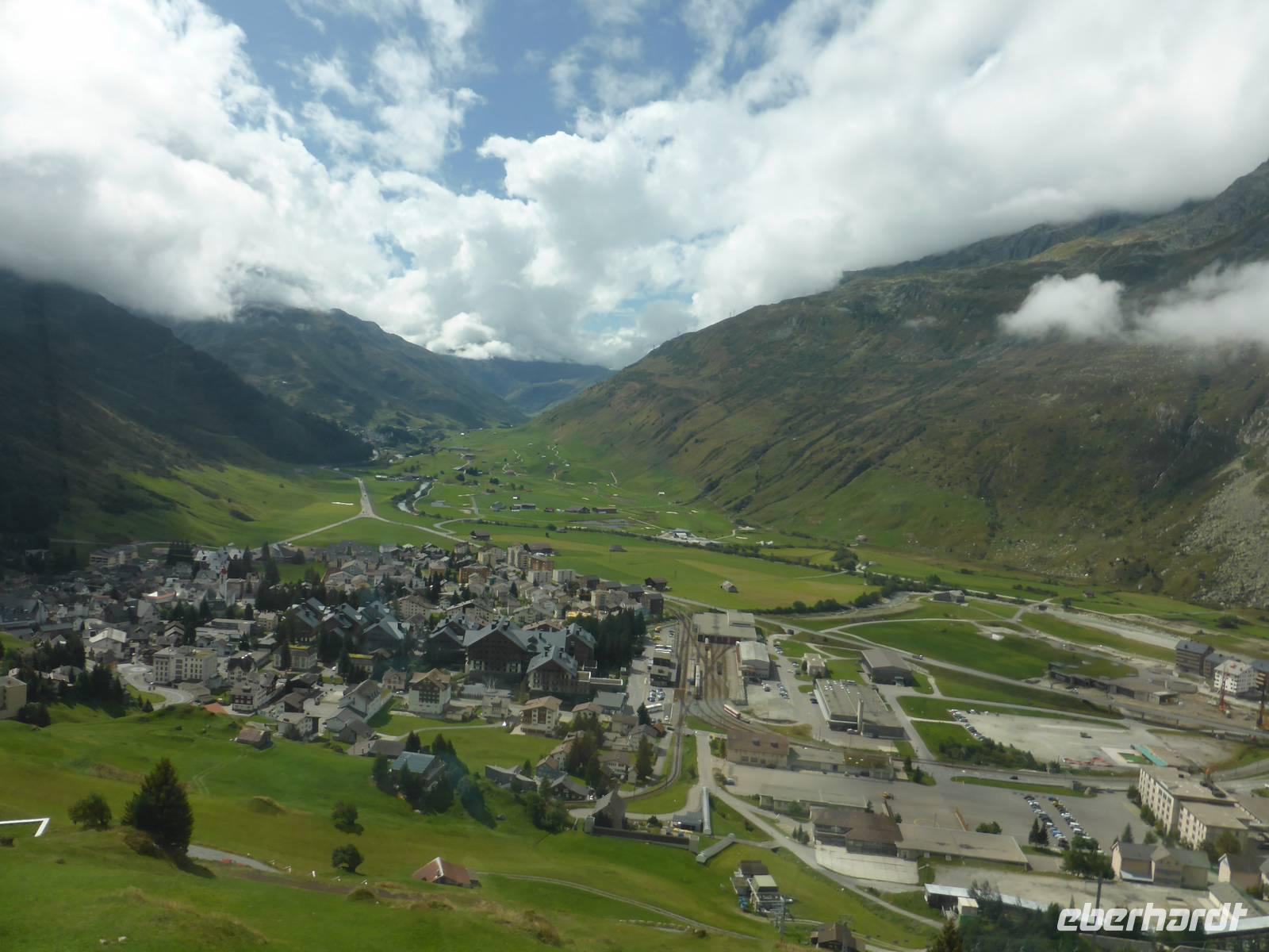 Am Morgen fuhren wir vom Hotel zum Bahnhof in Davos-Platz. Hier verabschiedeten wir unseren Fahrer Rainer, den wir erst am Abend in Zermatt wiedersehen sollten. Pünktlich um 09.31 Uhr setzte sich der Regionalzug in Richtung Filisur in Bewegung. Bereits in Davos stieg eine Mitarbeiterin des Glacier-Expresses zu. Sie verteilte Wasserflaschen an uns sowie Prospekte und Info-Material. In Filisur stiegen wir in den Glacier-Express, in dem ein Waggon für uns reserviert war, um. Auf unseren Plätzen lagen Kopfhörer für die Erläuterungen während der Fahrt bereit und die Tische waren bereits mit weißen Tischdecken bedeckt. Wir hatten viel besseres Wetter als erwartet und klare Sicht, so dass es eine richtig tolle Panoramafahrt wurde. Nach kurzem Aufenthalt in Disentis wurde uns ein typischer Älpler-Teller, bestehend aus reichlich Salami und Käse, serviert. Während wir aßen, fuhren wir weiter über den Oberalppass hinunter nach Andermatt. Hier hatten wir Gelegenheit, auszusteigen und uns die Beine zu vertreten. Von Realp ging es dann durch den Furka-Tunnel nach Oberwald und von dort durch das schöne Rhone-Tal bis Visp. Ab Visp fuhren wir auf der Zahnstange das Tal hinauf bis nach Täsch. Dort war die Freude groß, als wir Rainer und unseren Bus auf dem Parkplatz stehen sahen. Wir fuhren weiter bis zur Endstation in Zermatt und spazierten vom Bahnhof zu unserem Hotel Bristol. Nach dem Zimmerbezug und dem Eintreffen der Koffer trafen wir uns dann wieder zum gemeinsamen Abendessen im Hotelrestaurant.
