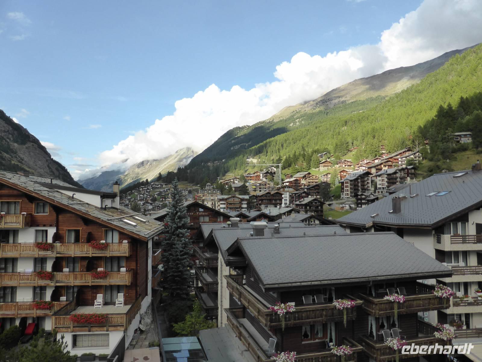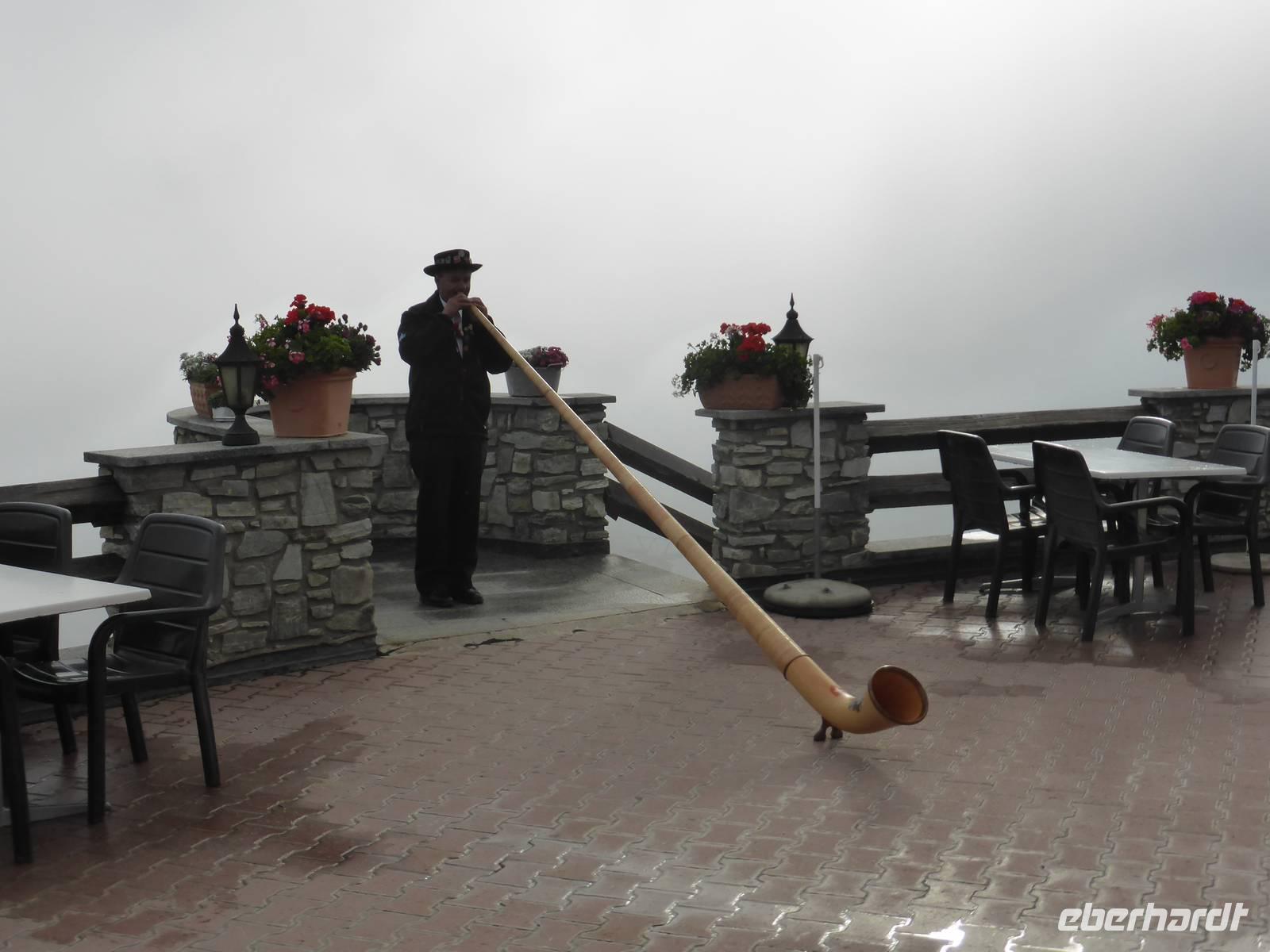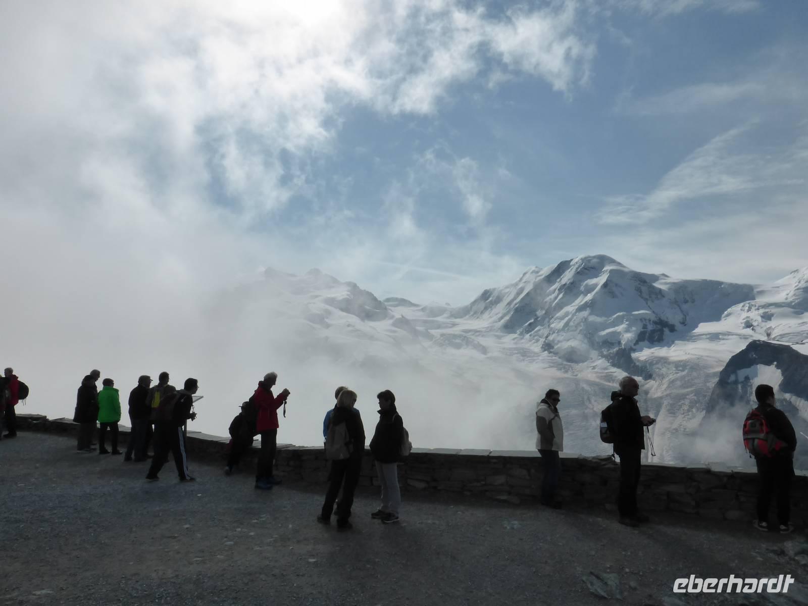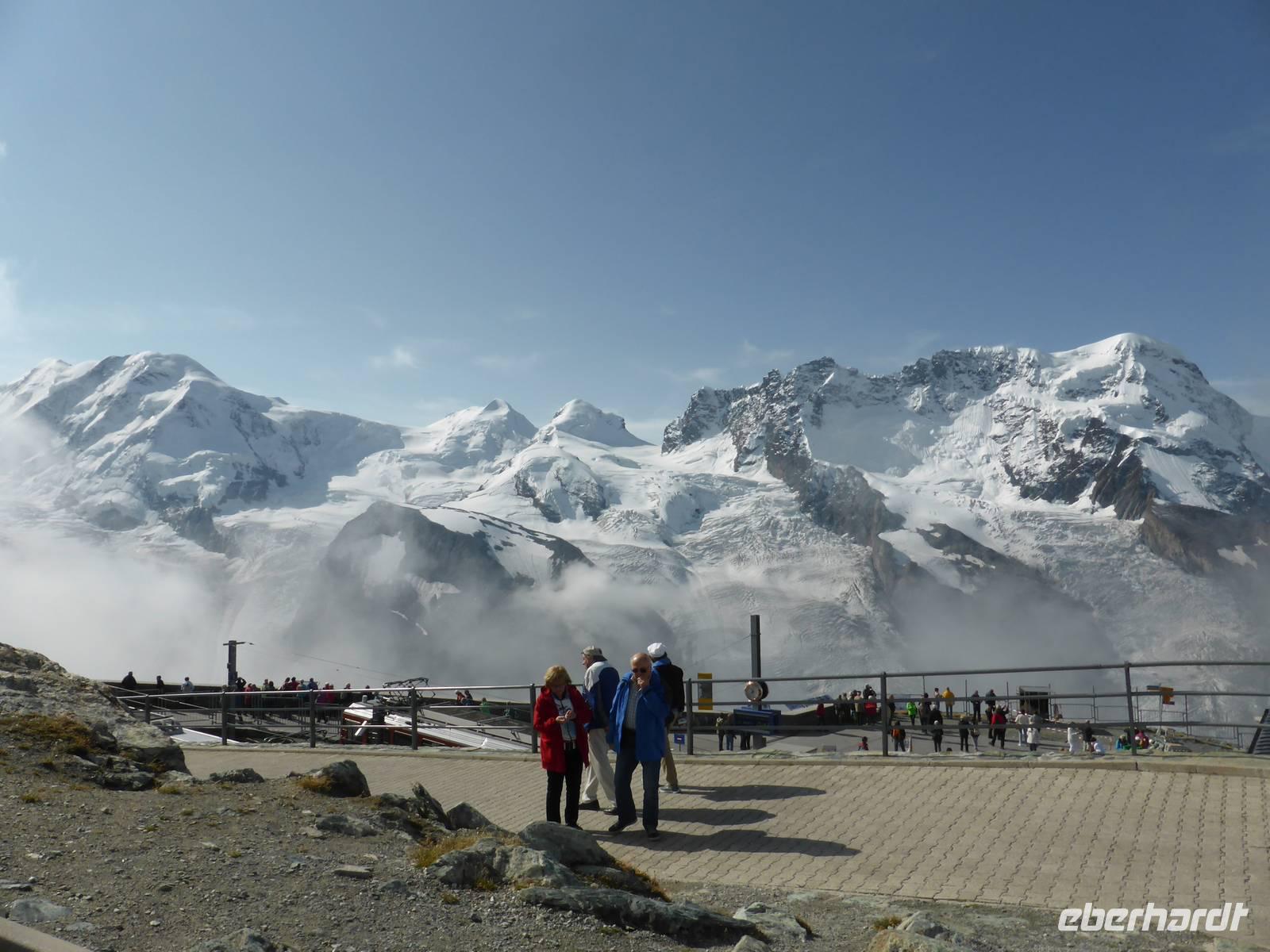 In der Nacht hatte es gewittert und geregnet. Da der Blitz ausgerechnet in die Kamera der Gornergrat-Bergstation eingeschlagen hatte, wussten wir nicht, welches Wetter uns oben erwarten würde. Nur der Vergleich mit dem auf ähnlicher Höhe liegenden Rothorn erlaubte uns die Hoffnung auf freie Berggipfel-Sicht. Zum Glück war die Kamera des Rothorns in Betrieb. Die meisten Gäste fuhren mit der Zahnradbahn hinauf zum Gornergrat auf 3089 Meter und wurden mit einer atemberaubenden Rundumsicht belohnt. Wir sahen das Matterhorn, die Gorner-Gletscher und das Monte-Rosa-Massiv mit der Dufour-Spitze (4634 m). Die Dufourspitze ist der höchste Berg der Schweiz. Nach unserem Aufenthalt an der Bergstation des Gornergrat, entschieden sich viele Gäste dafür, ein Teilstück auf dem Rückweg zu wandern und erst später in die Bahn hinunter nach Zermatt einzusteigen. Am frühen Nachmittag war dann der Großteil unserer Gruppe wieder im Tal und nutzte die Zeit zum Bummel durch das urige Zermatt. Am Abend trafen wir uns alle an der Hotelrezeption und spazierten gemeinsam zur Talstation der Rothorn-Bahn. Nachdem wir durch einen langen Tunnel die Kabinen der Zahnradbahn erreicht hatten, folgte eine kurze Fahrt hinauf zur Sunnega. Am Sunnega-Panorama-Restaurant wurden wir mit einem Begrüßungs-Sekt und von einem Alphorn-Bläser empfangen. Es war ein sehr ergreifender Augenblick. Das folgende Raclette-Essen bei alpenländischer Musik nahmen wir im Inneren des Panoramarestaurants ein. Zuerst gab es einen Schinkenteller und anschließend Raclette-Käse mit kleinen Kartoffeln und Zwiebeln. Das Essen war reichlich und gut, die Musikgruppe urig und alle fühlten sich sehr wohl! Rasant ging es dann von der Sunnega-Bergstation wieder hinunter nach Zermatt und dort entlang der Vispa zu Fuß zurück zum Hotel.