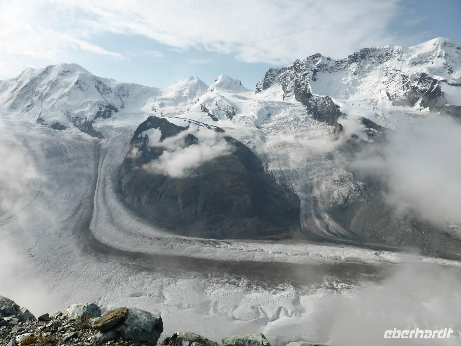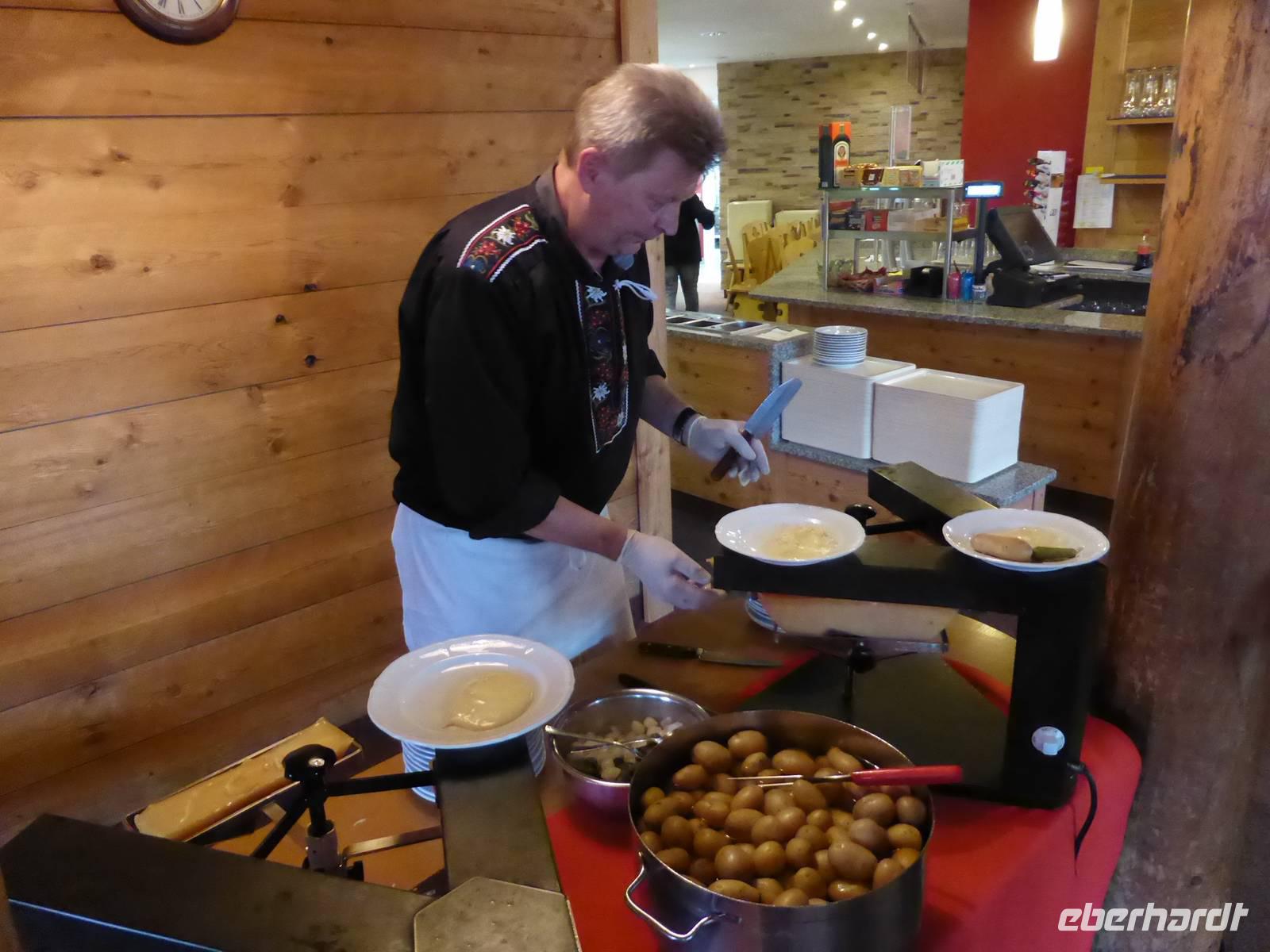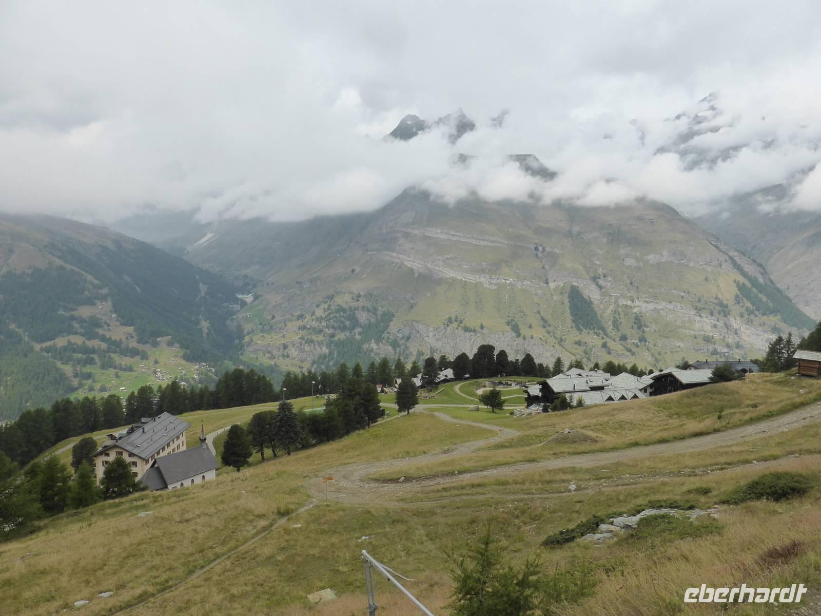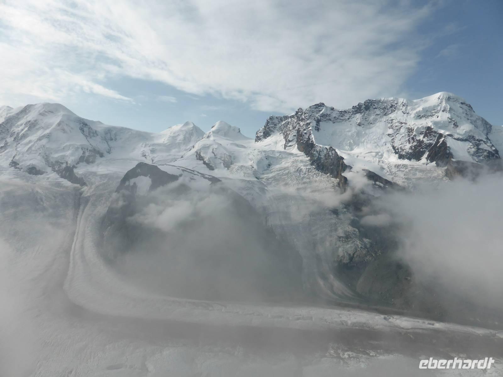 In der Nacht hatte es gewittert und geregnet. Da der Blitz ausgerechnet in die Kamera der Gornergrat-Bergstation eingeschlagen hatte, wussten wir nicht, welches Wetter uns oben erwarten würde. Nur der Vergleich mit dem auf ähnlicher Höhe liegenden Rothorn erlaubte uns die Hoffnung auf freie Berggipfel-Sicht. Zum Glück war die Kamera des Rothorns in Betrieb. Die meisten Gäste fuhren mit der Zahnradbahn hinauf zum Gornergrat auf 3089 Meter und wurden mit einer atemberaubenden Rundumsicht belohnt. Wir sahen das Matterhorn, die Gorner-Gletscher und das Monte-Rosa-Massiv mit der Dufour-Spitze (4634 m). Die Dufourspitze ist der höchste Berg der Schweiz. Nach unserem Aufenthalt an der Bergstation des Gornergrat, entschieden sich viele Gäste dafür, ein Teilstück auf dem Rückweg zu wandern und erst später in die Bahn hinunter nach Zermatt einzusteigen. Am frühen Nachmittag war dann der Großteil unserer Gruppe wieder im Tal und nutzte die Zeit zum Bummel durch das urige Zermatt. Am Abend trafen wir uns alle an der Hotelrezeption und spazierten gemeinsam zur Talstation der Rothorn-Bahn. Nachdem wir durch einen langen Tunnel die Kabinen der Zahnradbahn erreicht hatten, folgte eine kurze Fahrt hinauf zur Sunnega. Am Sunnega-Panorama-Restaurant wurden wir mit einem Begrüßungs-Sekt und von einem Alphorn-Bläser empfangen. Es war ein sehr ergreifender Augenblick. Das folgende Raclette-Essen bei alpenländischer Musik nahmen wir im Inneren des Panoramarestaurants ein. Zuerst gab es einen Schinkenteller und anschließend Raclette-Käse mit kleinen Kartoffeln und Zwiebeln. Das Essen war reichlich und gut, die Musikgruppe urig und alle fühlten sich sehr wohl! Rasant ging es dann von der Sunnega-Bergstation wieder hinunter nach Zermatt und dort entlang der Vispa zu Fuß zurück zum Hotel.