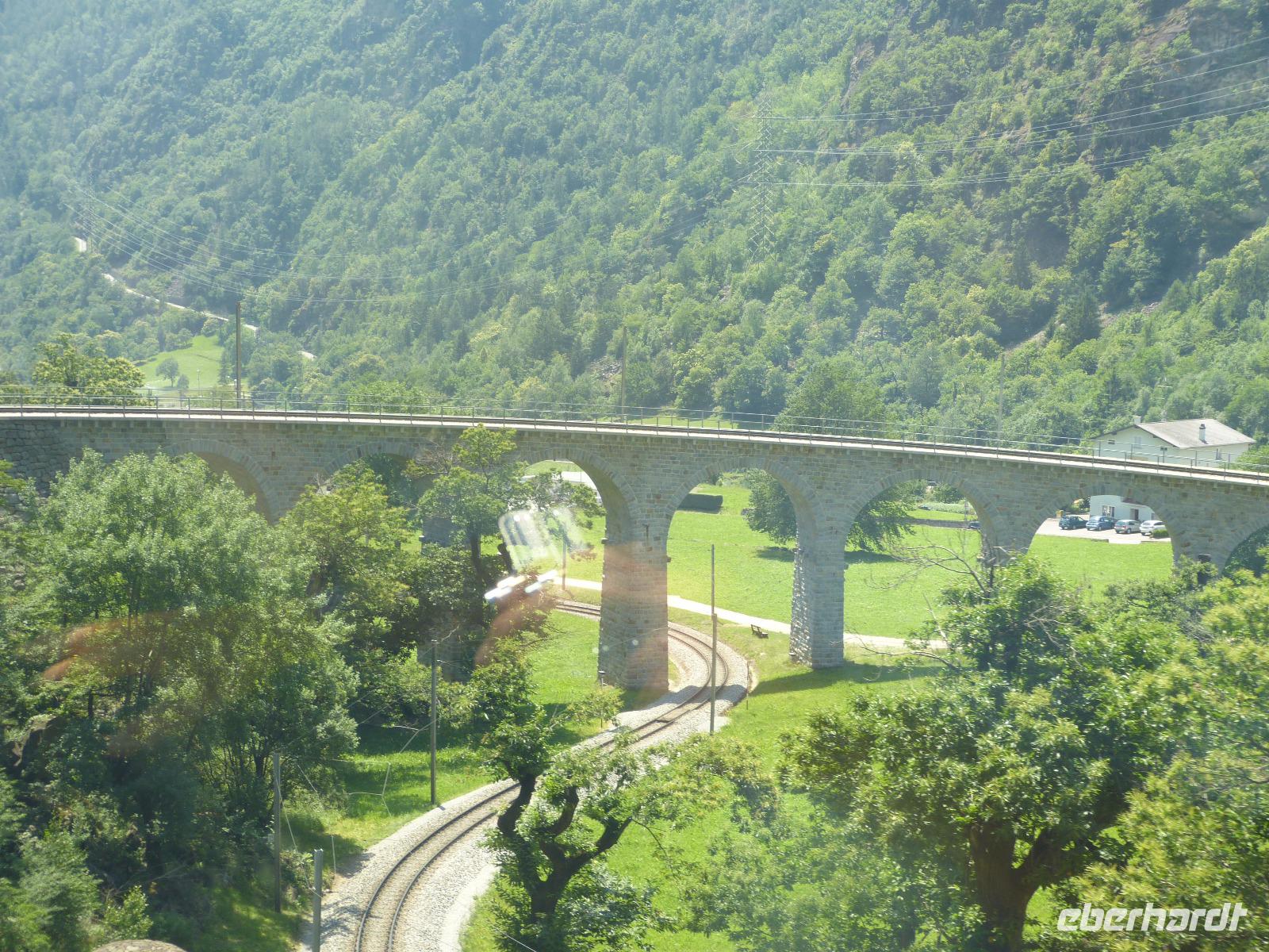 Heute sollte das größte Erlebnis unseres Urlaubes stattfinden, die Fahrt mit dem Glacier-Express. Nach der zeitigen Kofferverladung in unseren Bus fuhren wir zum Bahnhof Davos. Unser Bus fuhr mit dem gesamten Gepäck direkt über Tesch nach Zermatt. Unsere Reisegruppe fuhr mit der Davoscard von Davos nach Filisur. Dort bestiegen wir dann den Glacier-Express. Jeder hatte seinen Sitzplatz im Panoramawagen der 2. Klasse. Die Fahrt begann gleich mit einem Höhepunkt, der Fahrt über den Landwasserviadukt. Alle Fotoapparate waren in Betrieb und die Bewunderung war groß, wenn aber auch gleich wieder vorbei.