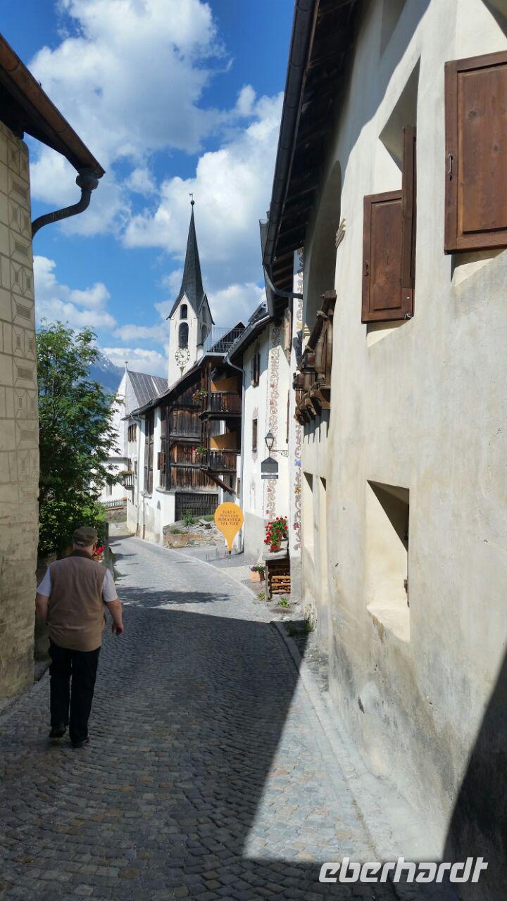 Am Vorabend hatten sich 17 Gäste für diese Rundfahrt interessiert. So fuhren wir nach einem ausgiebigen Frühstück mit dem Bus über den Flüele-Pass nach Susch und dann nach Guarda. Im Bus hatte ich den Gästen bereits etwas über die Engadiner Häuser berichtet und Ihnen die Geschichte vom Schellen-Ursli erzählt. Beim Rundgang durch Guarda konnte man den Zweck der Bauweise der Engadinhäuser bildlich darstellen. Es ist ein wunderschönes kleines Dorf im Unterengadin oberhalb des Inn mit vielen kleinen verschlungenen Gassen, wunderschönen Häusern und netten Einheimischen. Imposant auch die verschiedene Gestaltung der Häuserwände durch Sgraffito. Ein Höhepunkt dieser Reise, wie auch die mitgefahrenen Gäste bestätigten.