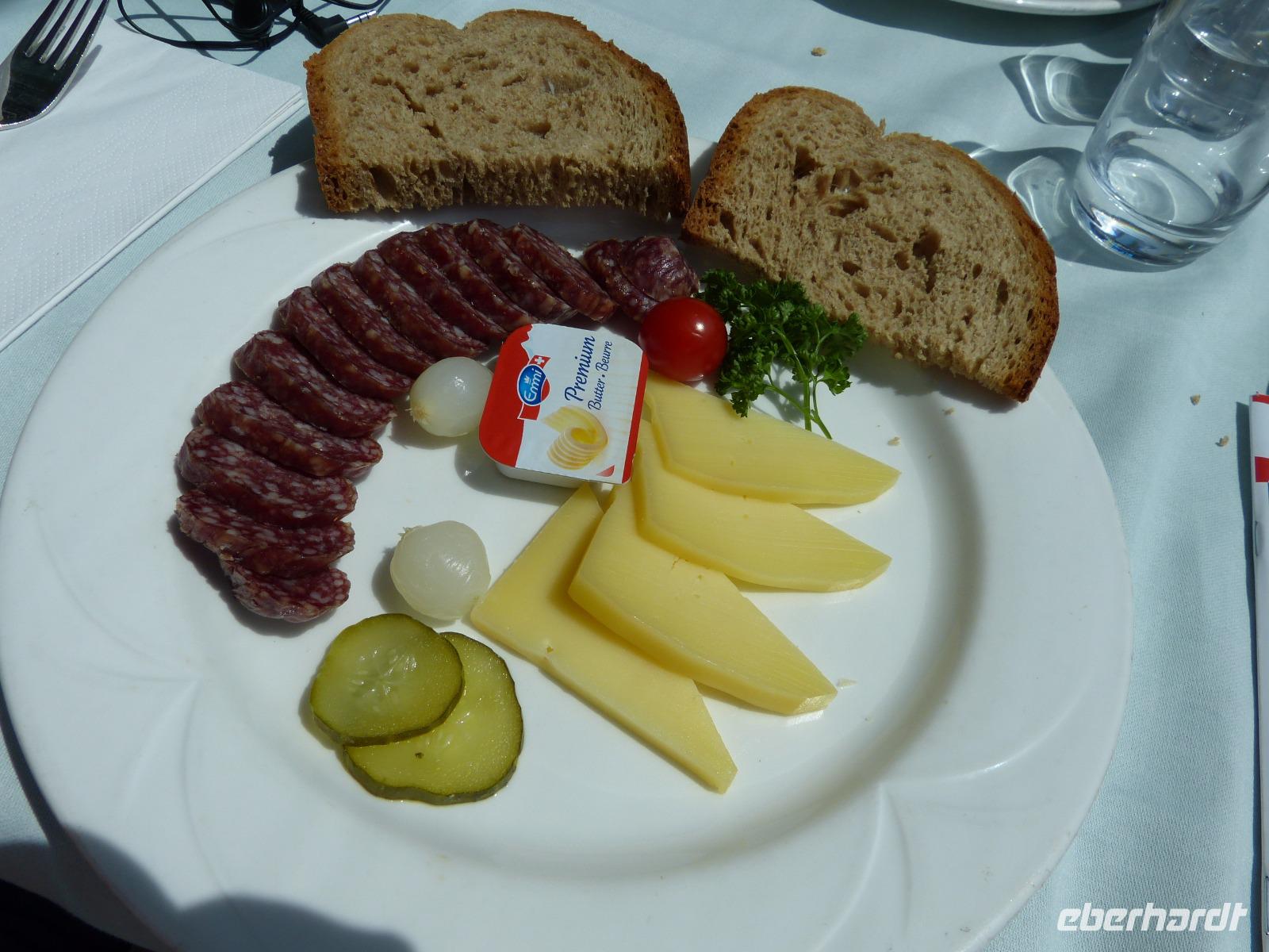 Die Bahnfahrt mit dem langsamsten Schnellzug dauerte ca. 7,5 Stunden und sie war keineswegs langweilig für die Passagiere. Die Landschaft veränderte sich ständig und es gab auf beiden Seiten des Zuges sehr viel zu sehen. Zudem wurde uns zum Mittagessen am Platz ein typischer Bauernteller (Älplerteller) mit Rauchwurst, Käse und reichlich Brot gereicht.