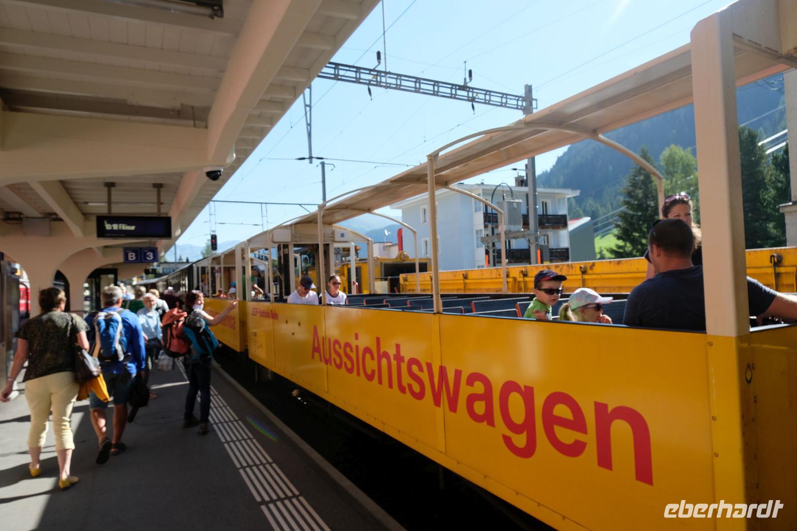 Heute sollte ein weiterer Höhepunkt unseres Urlaubes stattfinden, die Fahrt mit dem Glacier-Express. Unser Busfahrer Andre fuhr mit dem gesamten Gepäck direkt über Täsch nach Zermatt. Unsere Reisegruppe fuhr zunächst im Aussichtswagen mit dem Nostalgiezug von Davos nach Filisur. Dort bestiegen wir dann den Glacier-Express. Jeder hatte durch eine persönliche Platzkarte sofort seinen Sitzplatz im Panoramawagen der 2. Klasse. Die Fahrt begann gleich mit einem Höhepunkt, der Fahrt über das Landwasserviadukt. Alle Fotoapparate und Handys waren in Betrieb und die Bewunderung für das Bauwerk groß, wenn aber auch gleich wieder vorbei.