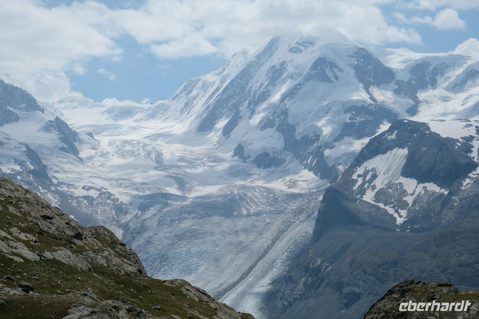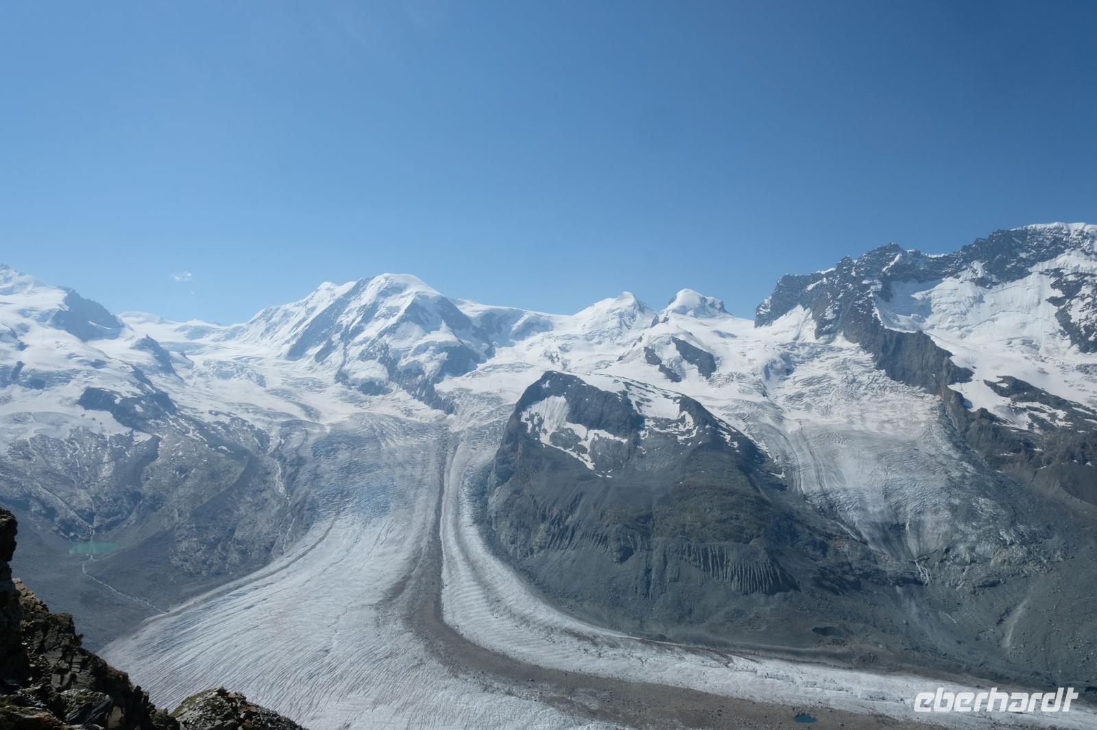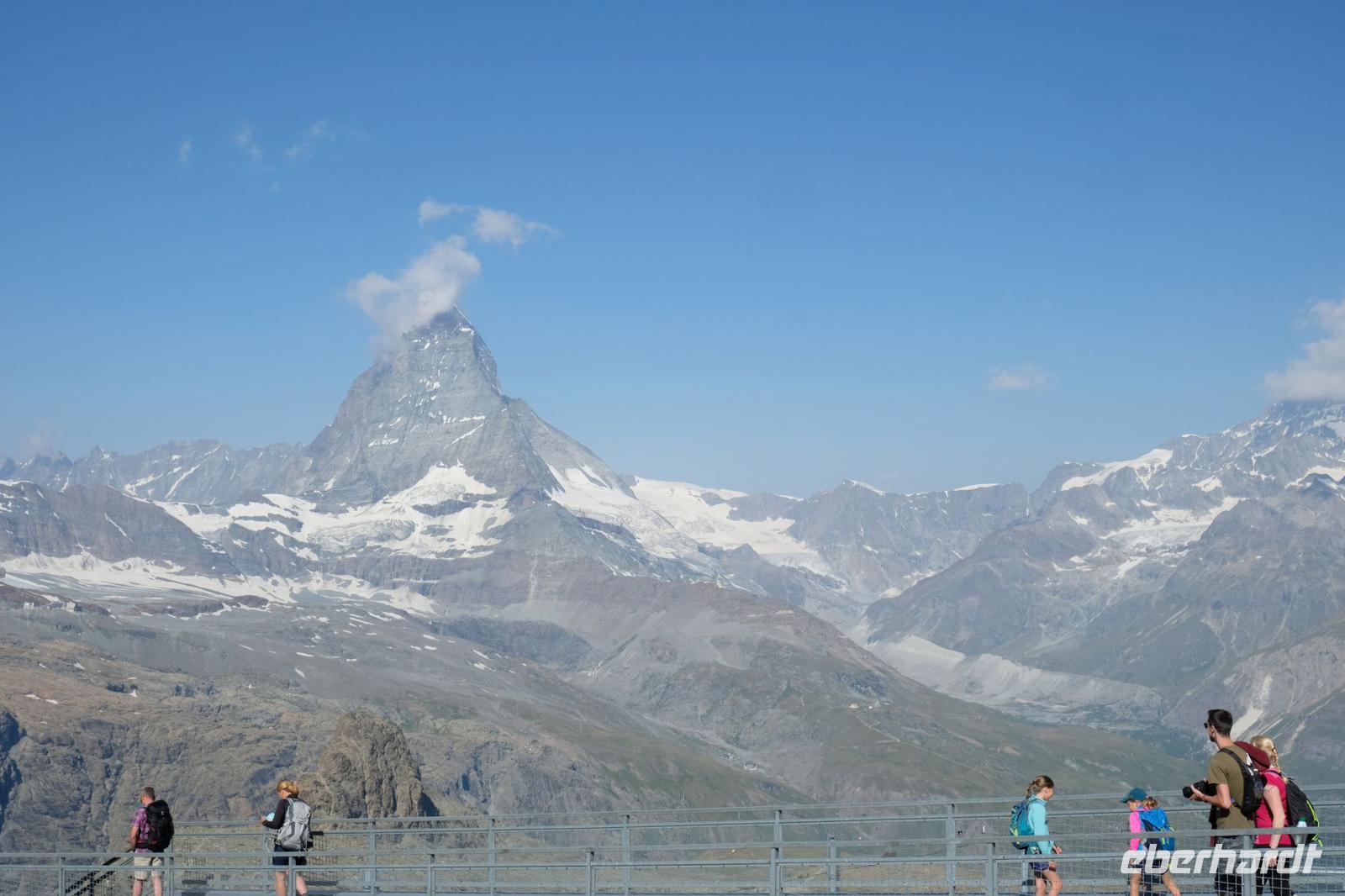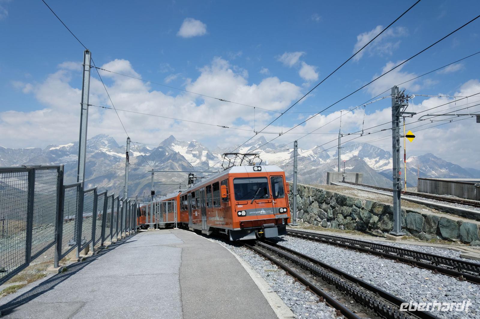 18 Personen hatten sich am Vorabend gemeldet, um mit mir auf den Gornergrat zu fahren. So fuhren wir 9.10 Uhr mit der höchsten, frei im Gelände angelegten Zahnradbahn Europas auf den 3089 m hohen Berg. Oben angekommen hatten wir bei strahlendem Sonnenschein einen fantastischen Blick auf einige Viertausender und natürlich auch auf das Matterhorn und die leider immer kleiner werdenden Gletscher. Das weitere Programm war dann ganz individuell angepasst, und jeder konnte seinen Abstieg selbst bestimmen.