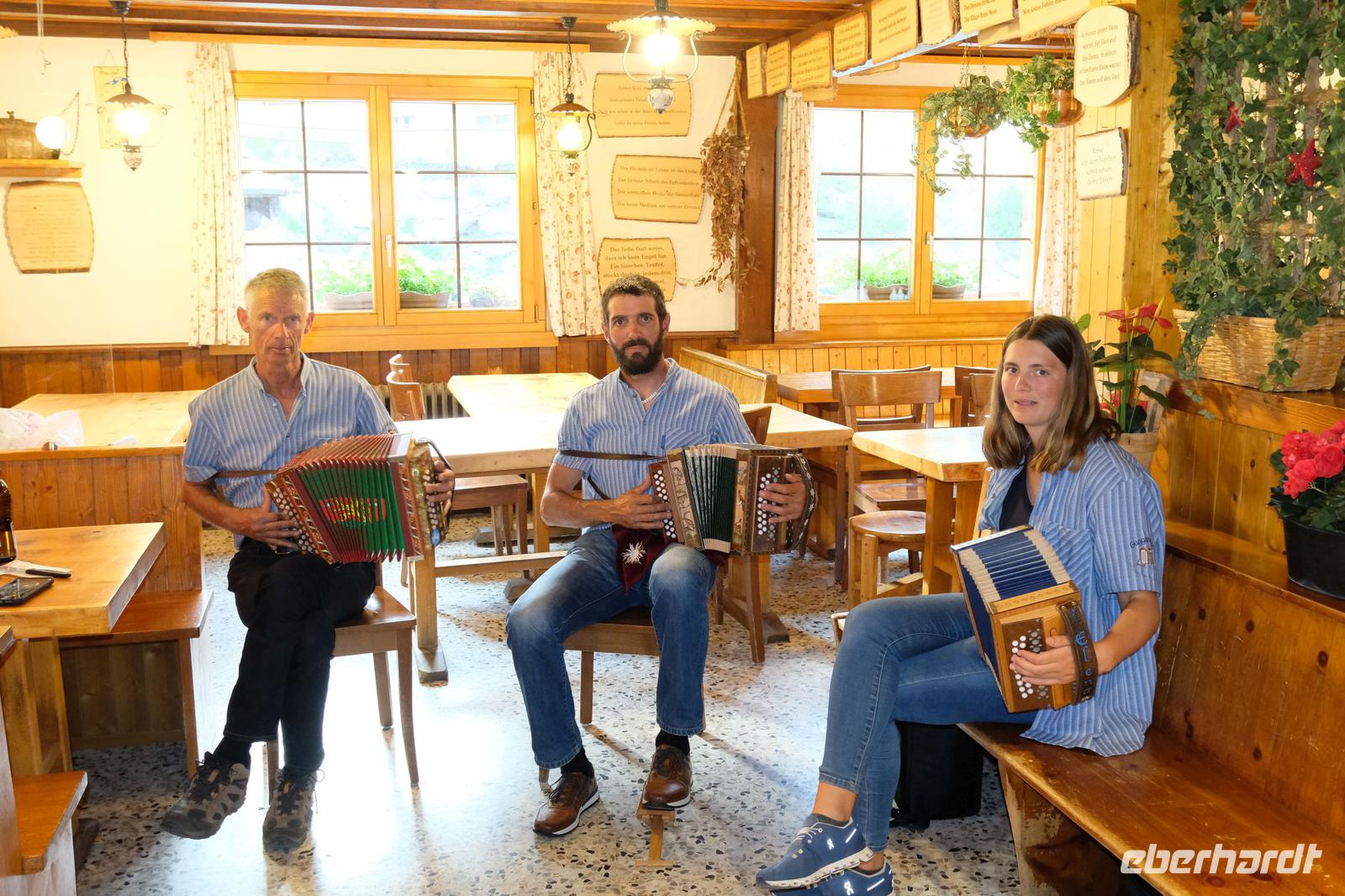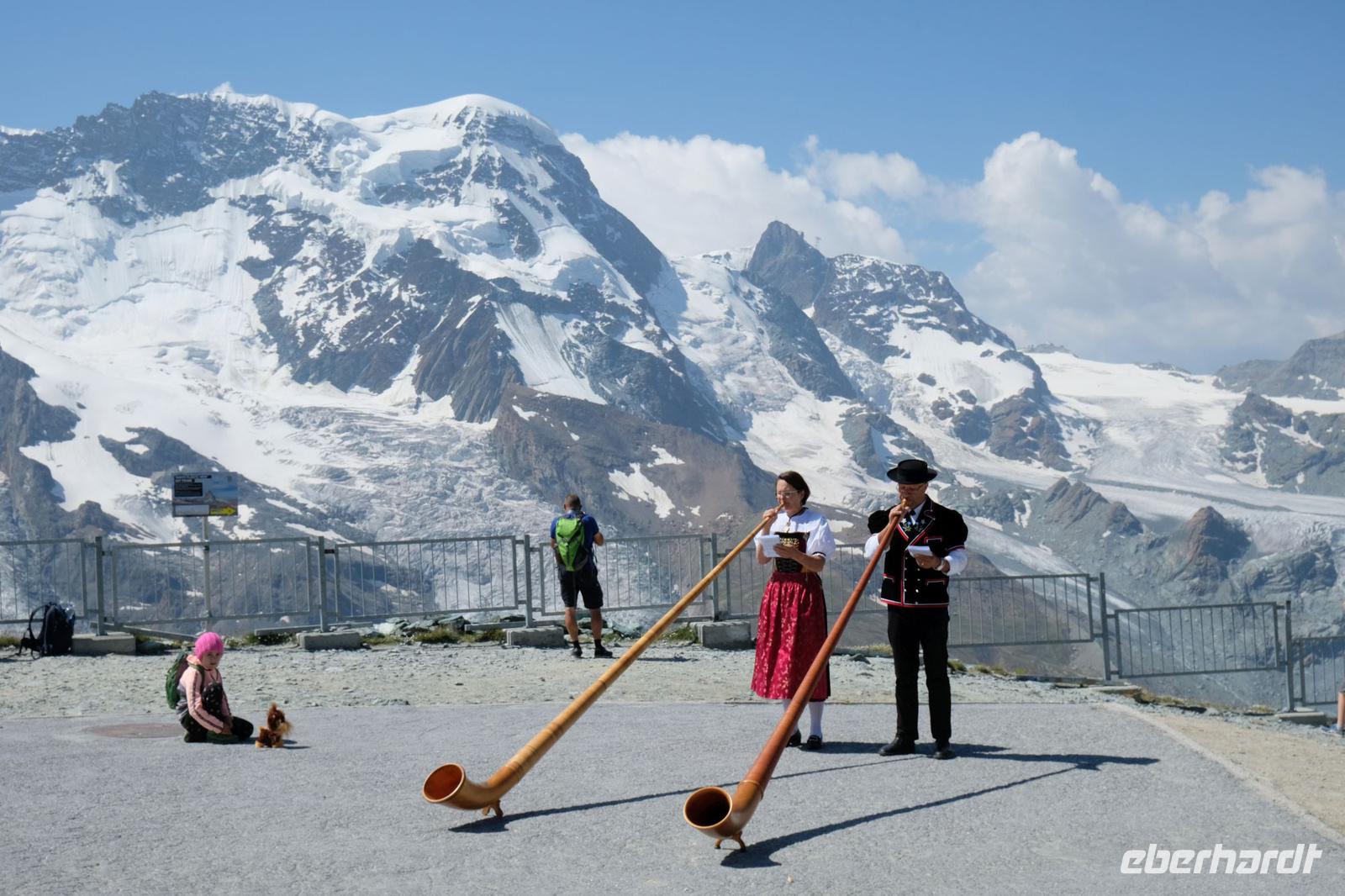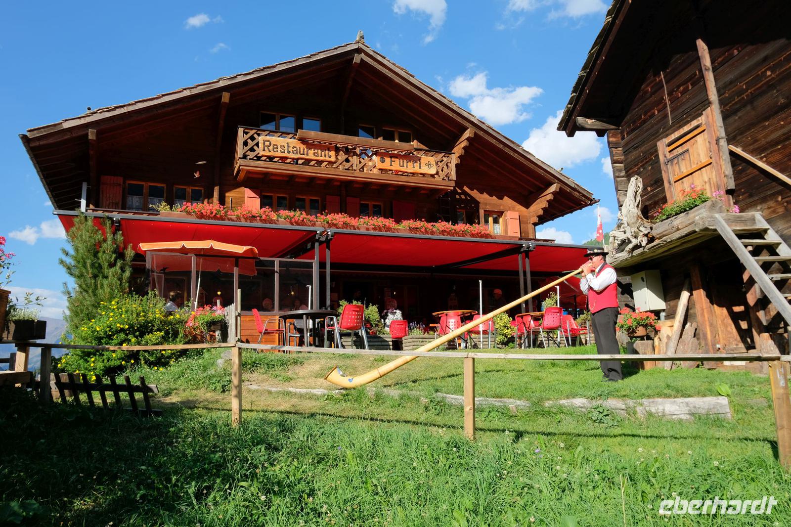 Das Abendessen wurde an diesem Abend nicht im Hotel gereicht, sondern wir fuhren mit der Kabinenbahn auf den Furi. In 1867 m Höhe wurden wir von den Wirtsleuten mit einem Aperitif begrüßt. Dazu spielte ein Alphornbläser auf der Terrasse, für alle Gäste ein schönes Erlebnis.